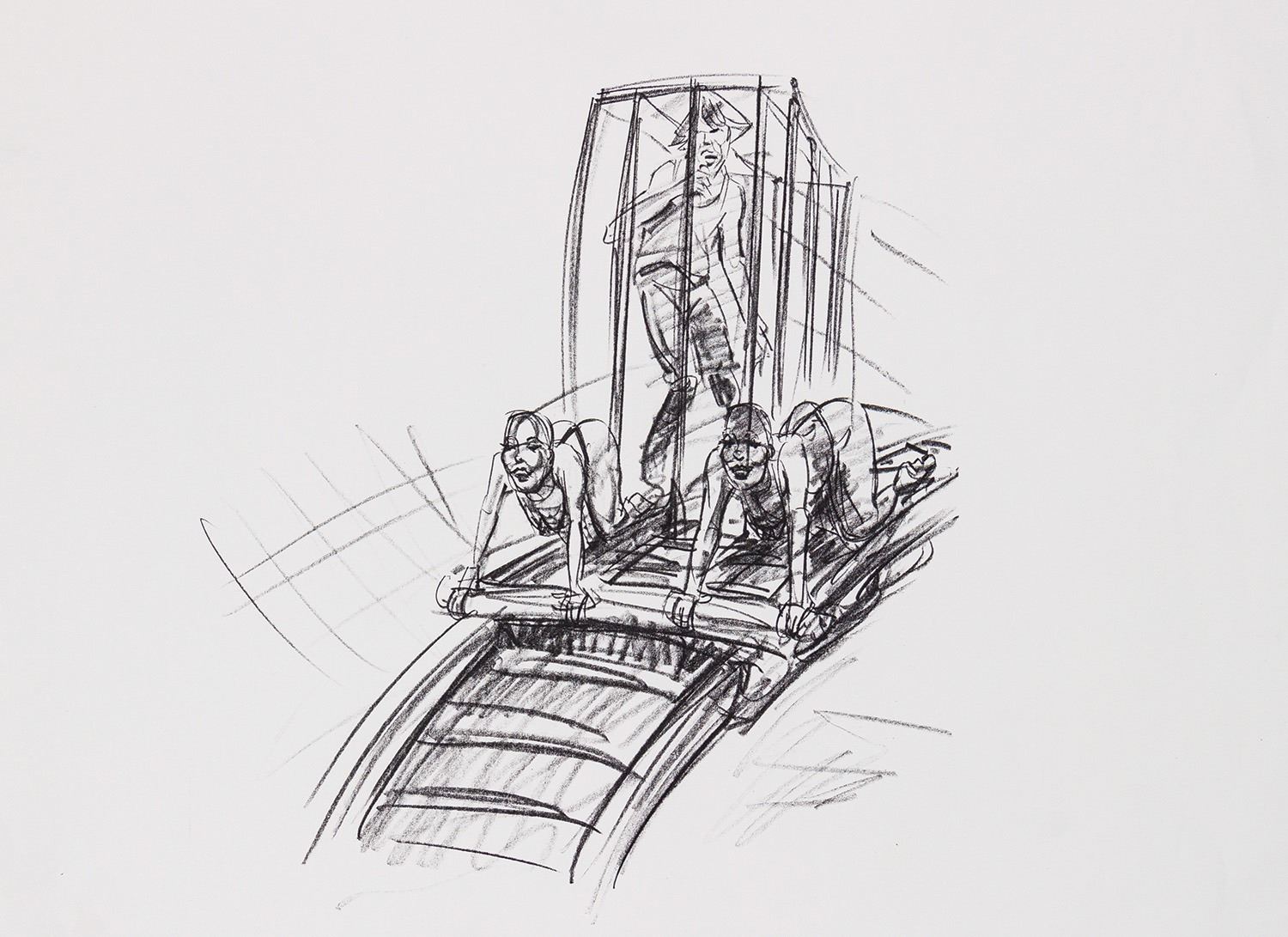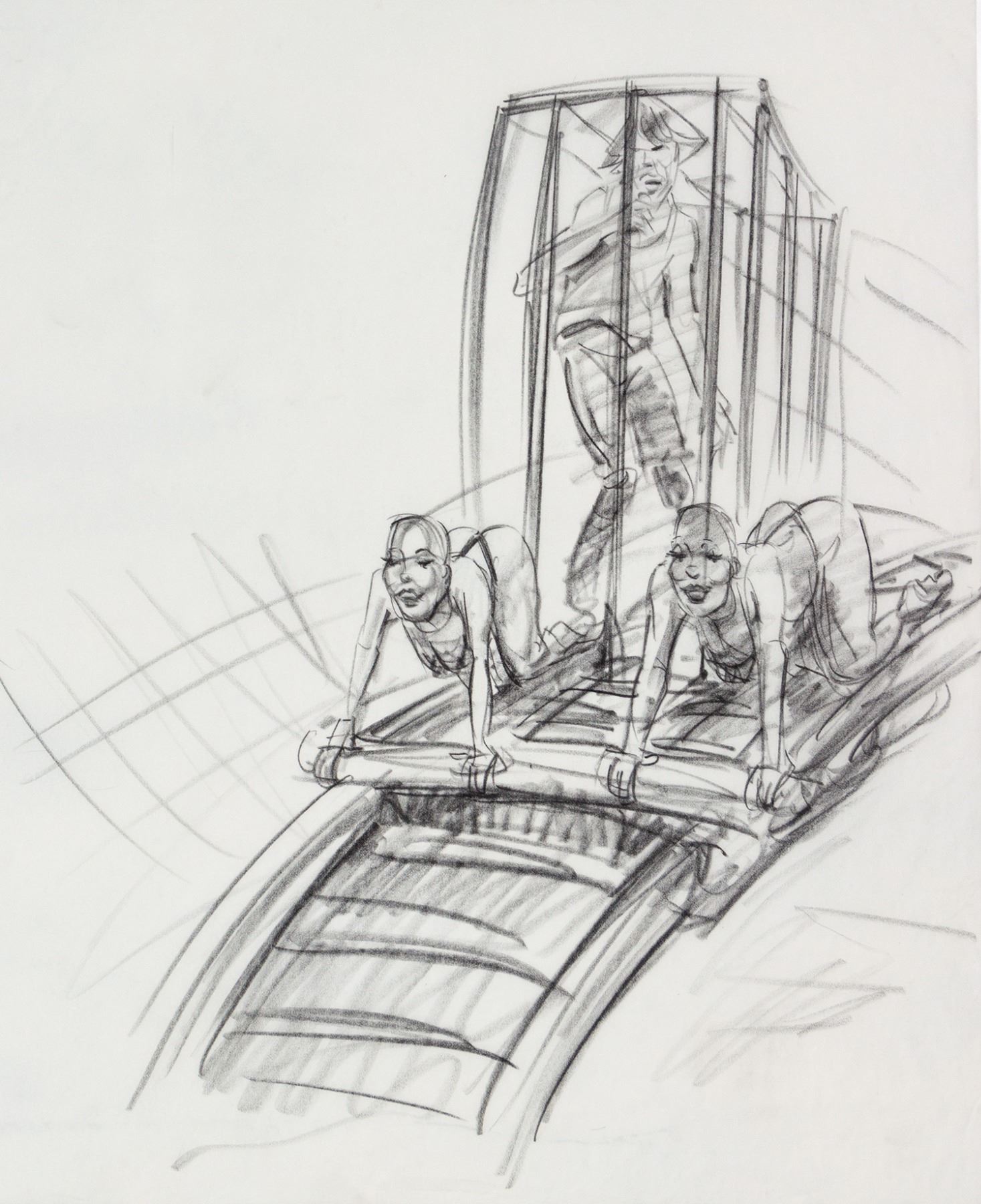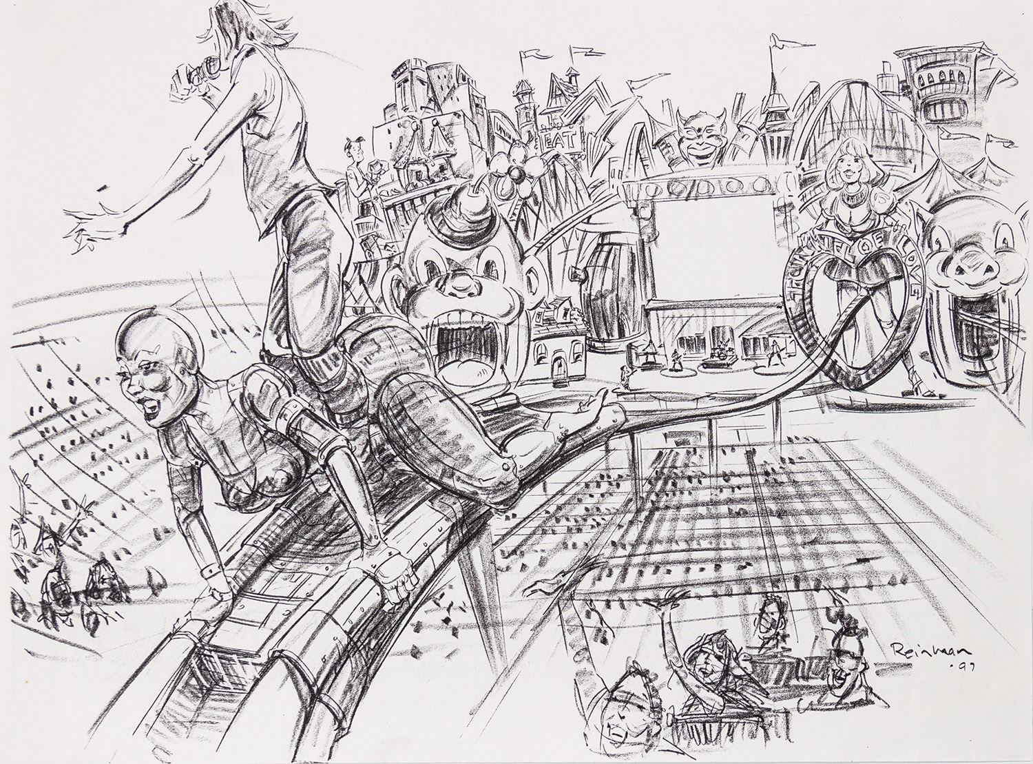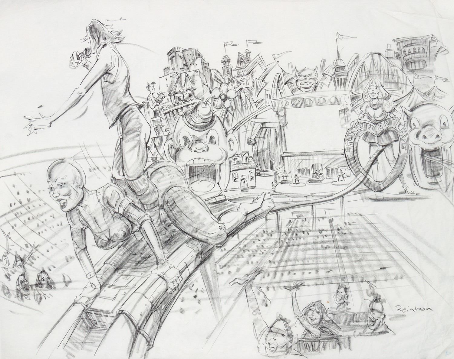 (Landmark Entertainment, c.1997) A collection of (2) original concept art drawings and (4) xerox prints for a potential Rolling Stones theme park style attraction. These concepts feature a carnival-like stage setup, featuring a "Tunnel of Love" which has a roller coaster-like track to take Mick Jagger out into the crowd. Ranging in size from 17"x14" to 19"x24", the pencil drawings and xerox prints are in very good condition with expected wear from age and use, including some spots of creasing along the edges.