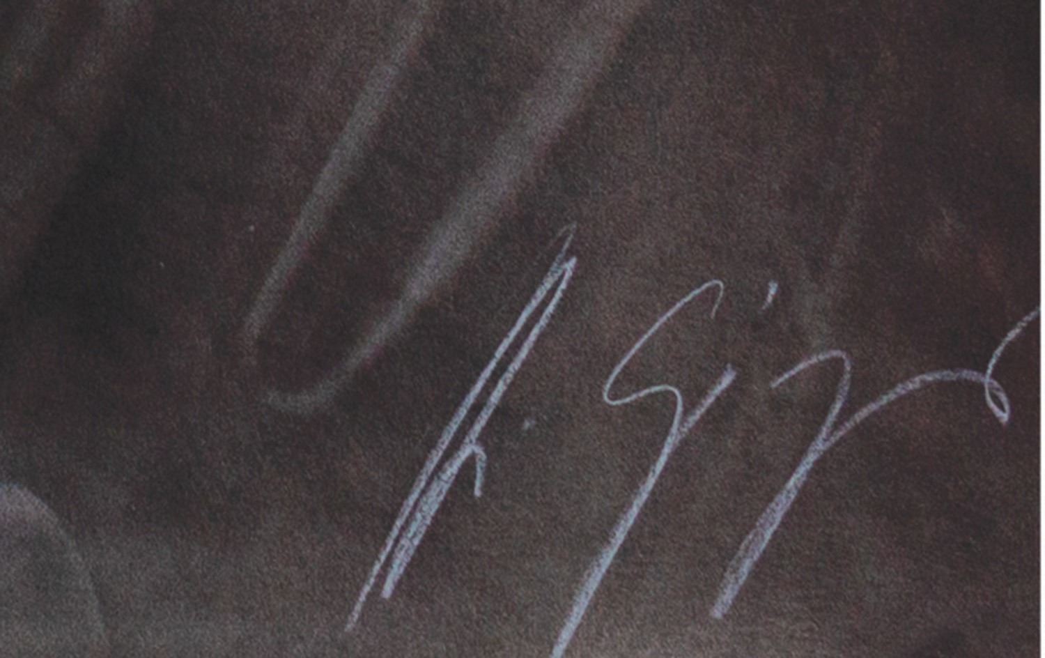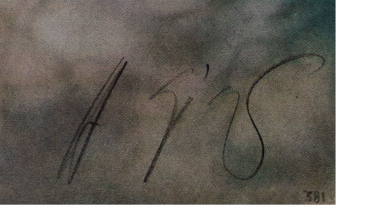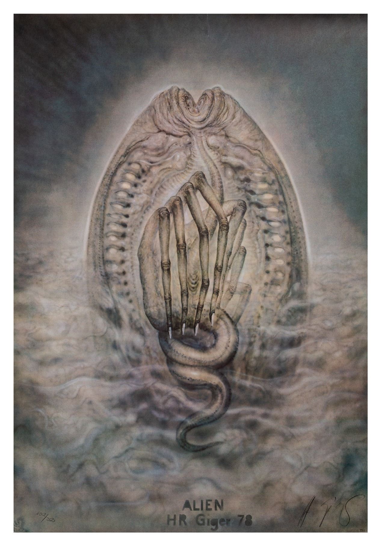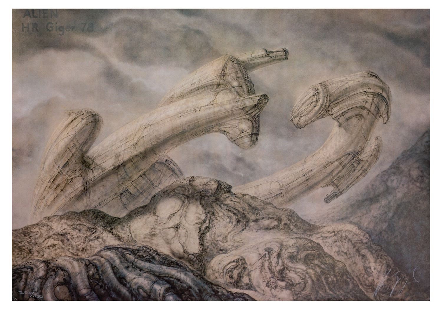 (20th Century Fox, 1979) A very rare set of (6) large concept art prints featuring the stunning artwork of H.R. Giger. Each print is signed and numbered by Giger, and the reverse of each print bears the 20th Century Fox logo. Each print is numbered out of only 350 pieces, and together, this set wonderfully represents Giger's hauntingly beautiful artwork which contributed so greatly to the overall mood and visuals of the film. Each print measures 27.5"x39.5" and the set is in fair condition overall, with varying amounts of wear to each print including some creases and small tears along the edges, and some surface scuffs of scratches to a few of the prints. The print depicting the alien cockpit has three small holes in the center of the imagery. No outer folder is included.