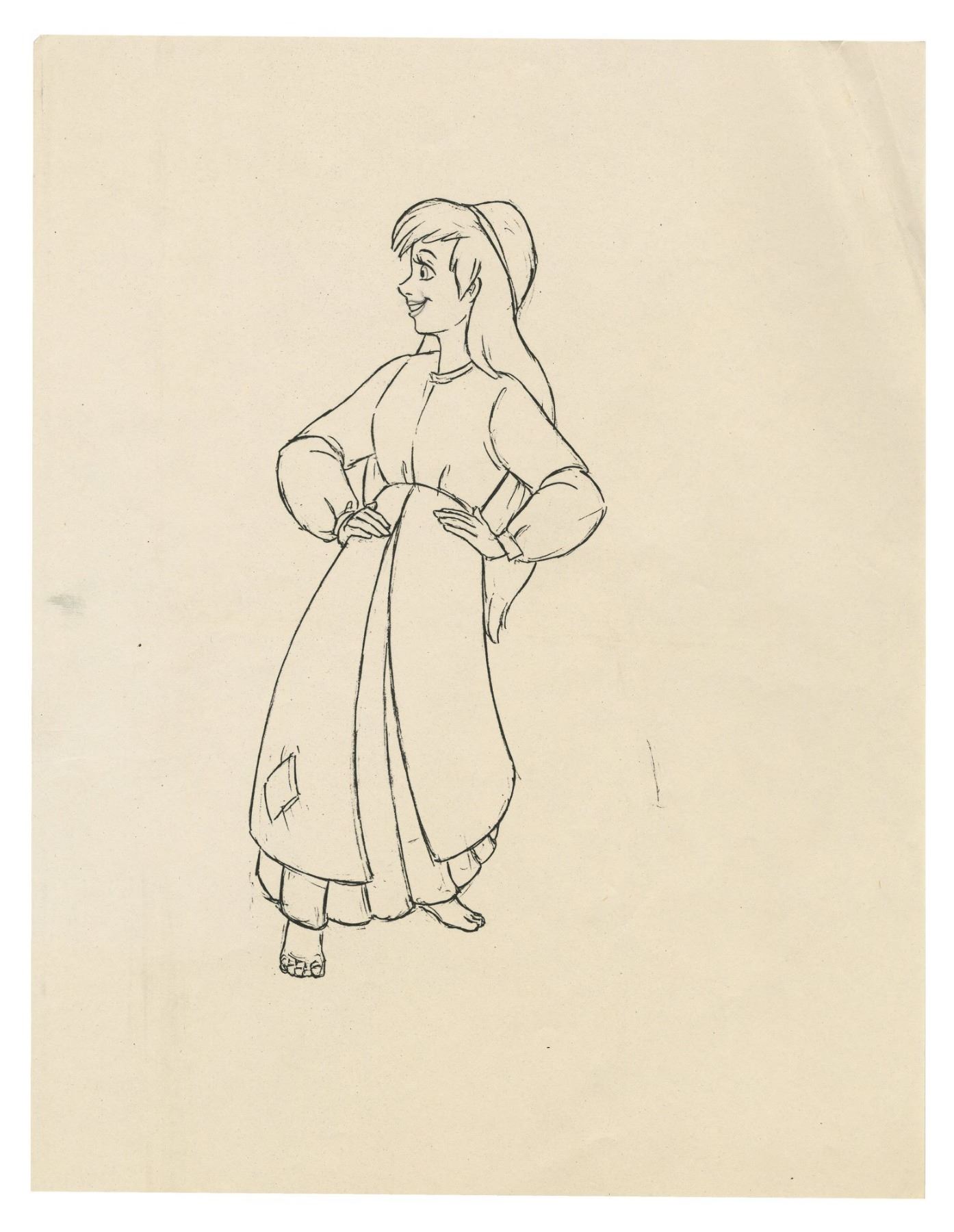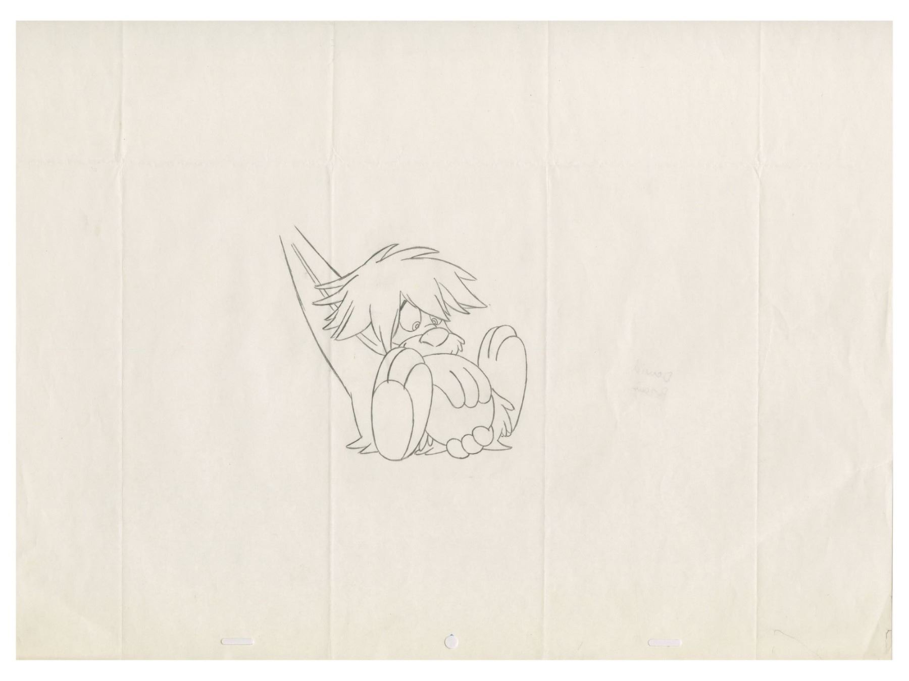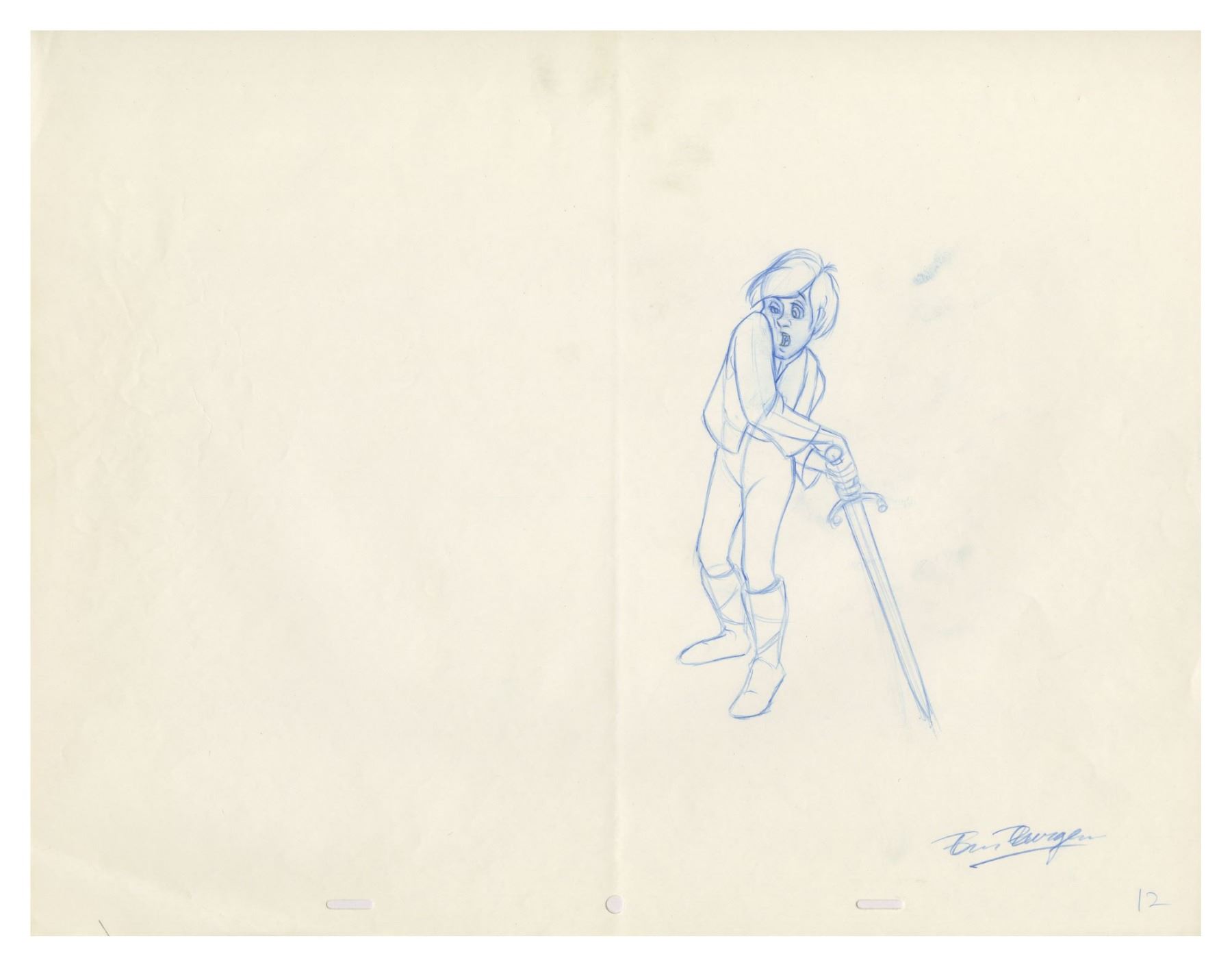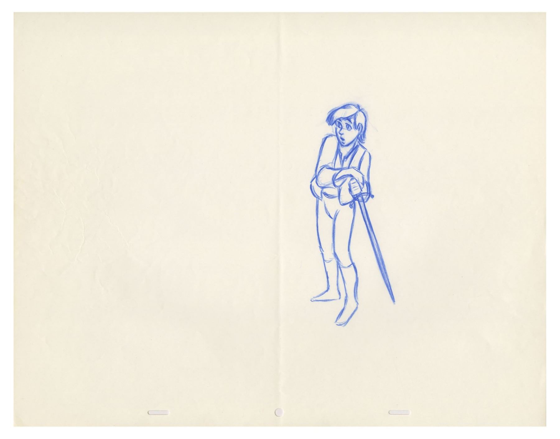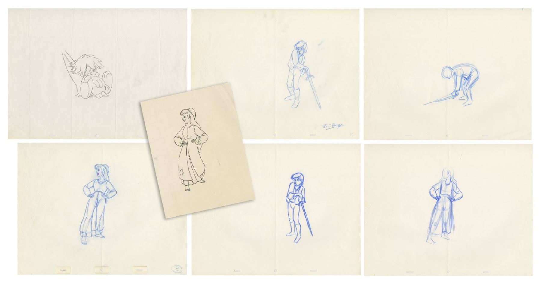 (Walt Disney Studios, 1985) A collection of (6) original rough animation drawings used during the production of The Black Cauldron. Depicting the characters Taran, Princess Eilonwy, and Gurgi, these drawing are accomplished in blue, red, and black pencils on 3-hole animation paper. Attributed to assistant animator Ben Burgess who signed one of the Taran drawings, these drawings range in size from the 12.5"x15.5" sheets to the largest 13.6"x16.5" Gurgi sheet. The condition is very good overall with minor wear from use and some fold-creases to the Gurgi sheet. Also included is a Xeroxed sheet depicting Princess Eilonwy.