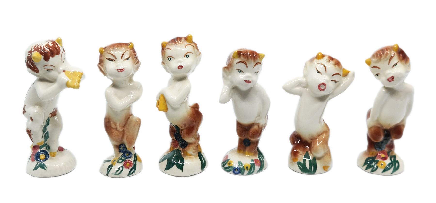 (Vernon Kilns, 1940) A rare collection of (6) Centaur ceramic figurines created by Vernon Kilns and inspired by Disney's Fantasia. Measuring between 4.25" and 5" tall, the set features the centaurs in various charming poses. The collection is in very good condition with minor wear from use including two figures with small chips near their base, and one with a chip on his horn.