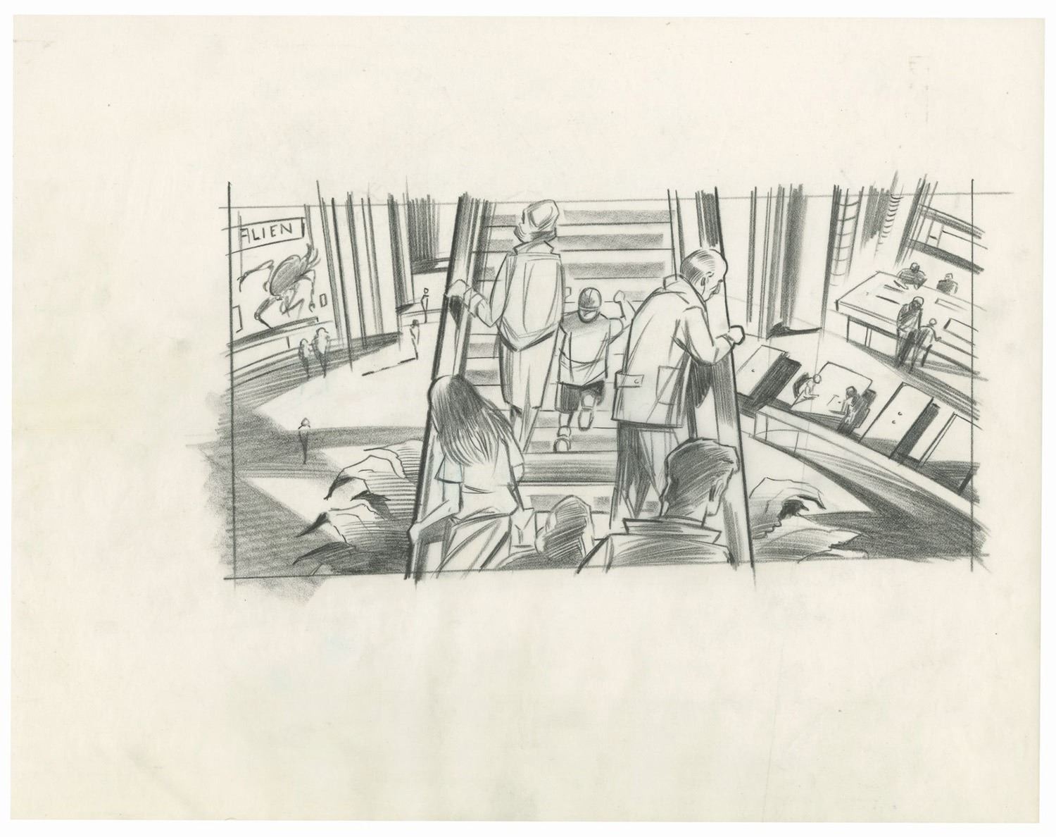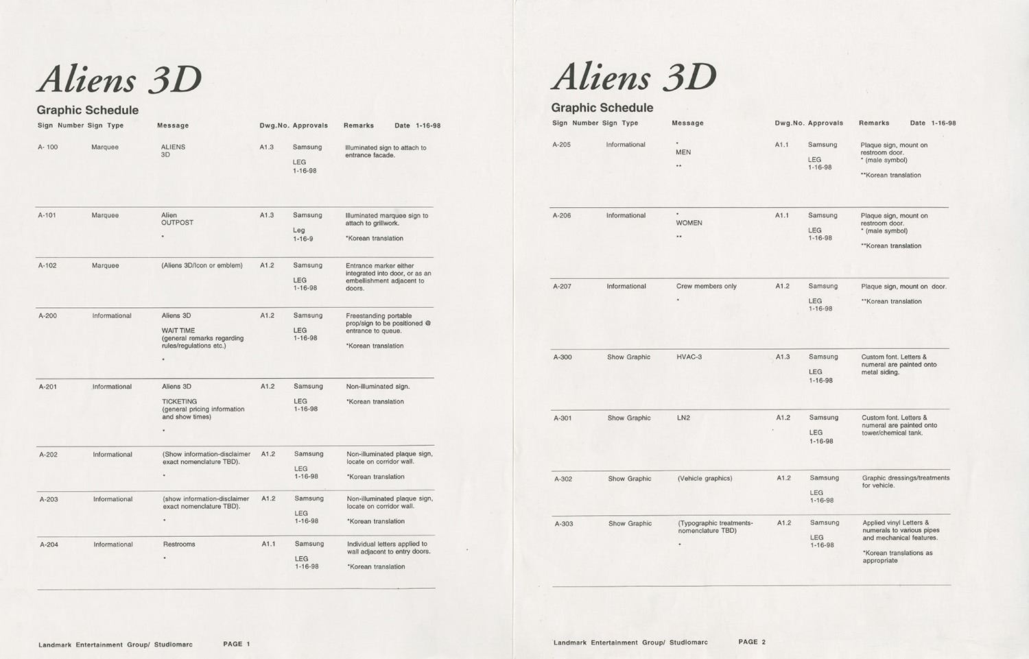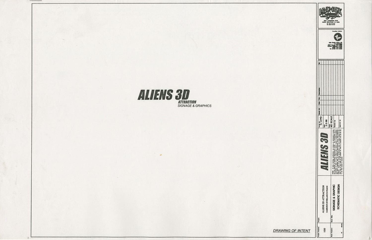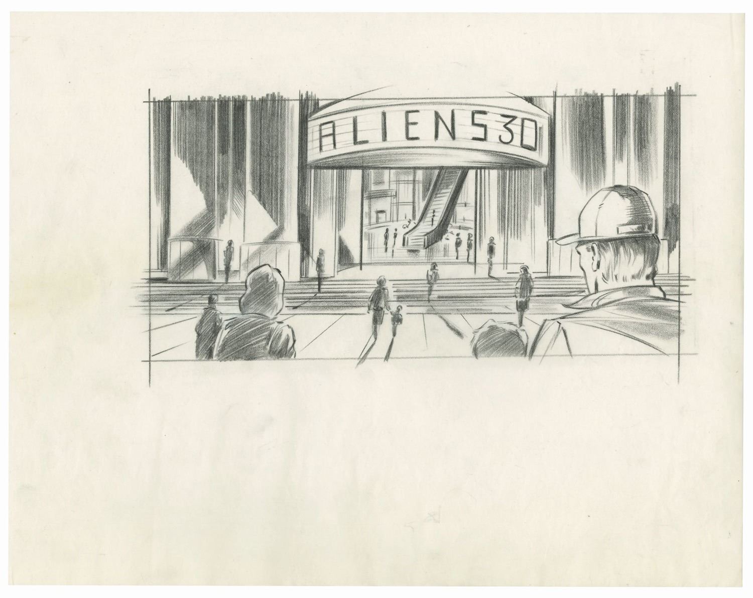 (Landmark Entertainment, c.1990s) A collection of storyboards, graphics schedule, and a graphics packet for a proposed Aliens 3D attraction at Everland Park in South Korea. The proposed attraction would have been part 3D movie and part live-action show, and the uncompleted attraction was famously featured in the extras of the Alien Anthology Blu-ray box set. The concepts are accomplished in pencil and range in size from approximately 11"x8.5" to 11"x17". The collection is in good to very good condition with expected edge-wear from age and use. There is a torn off section along the bottom of one of the storyboards, but this does not affect the image.