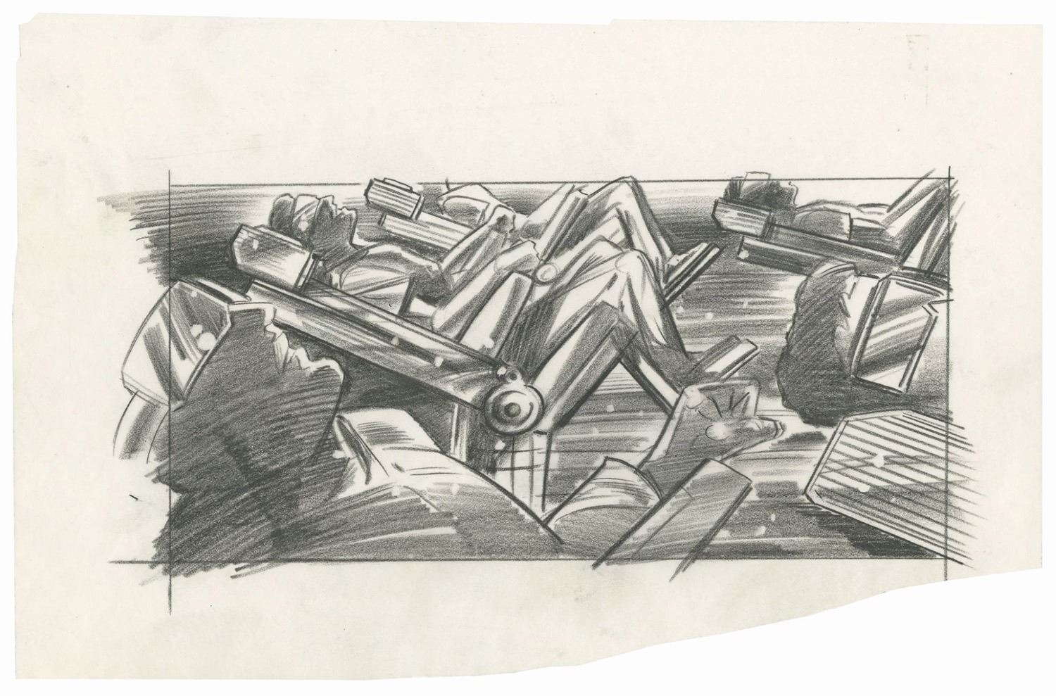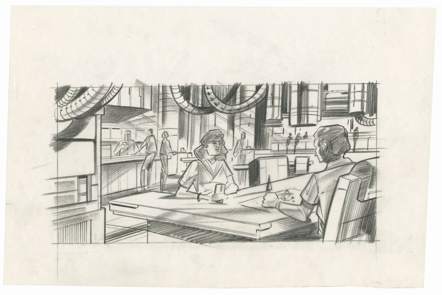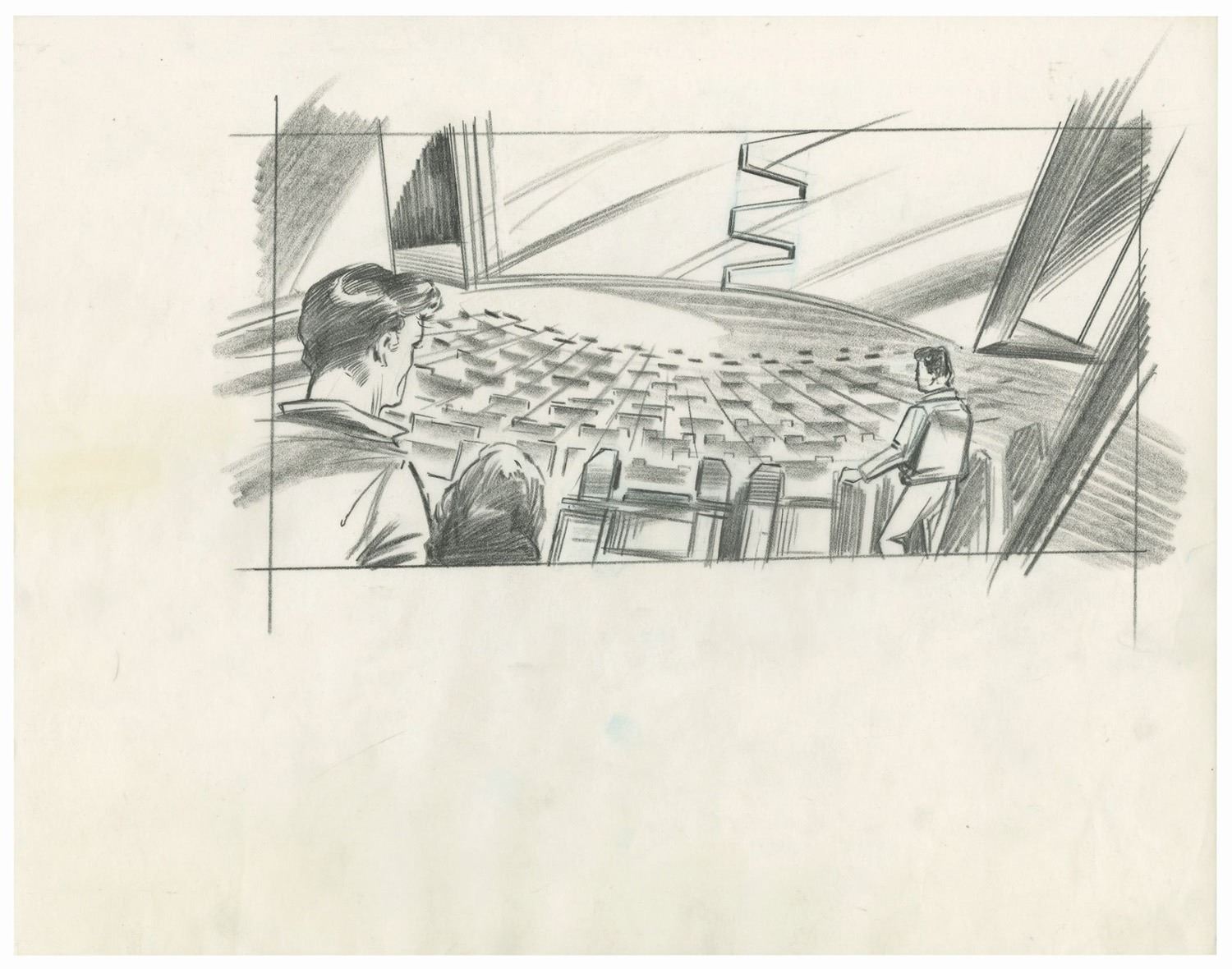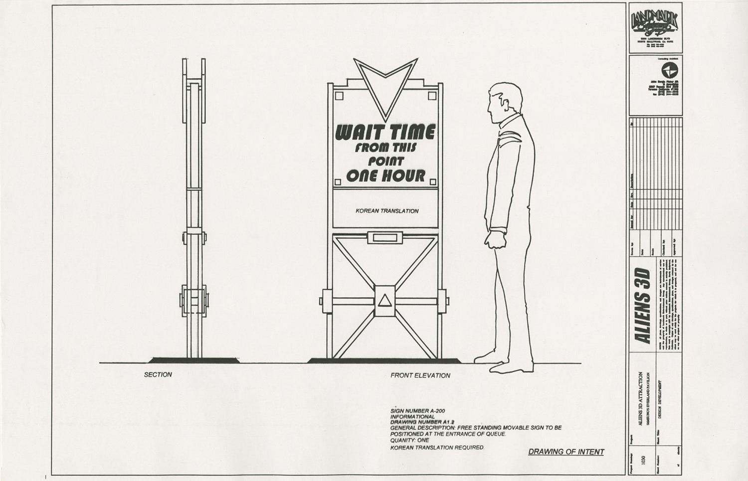 (Landmark Entertainment, c.1990s) A collection of storyboards, graphics schedule, and a graphics packet for a proposed Aliens 3D attraction at Everland Park in South Korea. The proposed attraction would have been part 3D movie and part live-action show, and the uncompleted attraction was famously featured in the extras of the Alien Anthology Blu-ray box set. The concepts are accomplished in pencil and range in size from approximately 11"x8.5" to 11"x17". The collection is in good to very good condition with expected edge-wear from age and use. There is a torn off section along the bottom of one of the storyboards, but this does not affect the image.