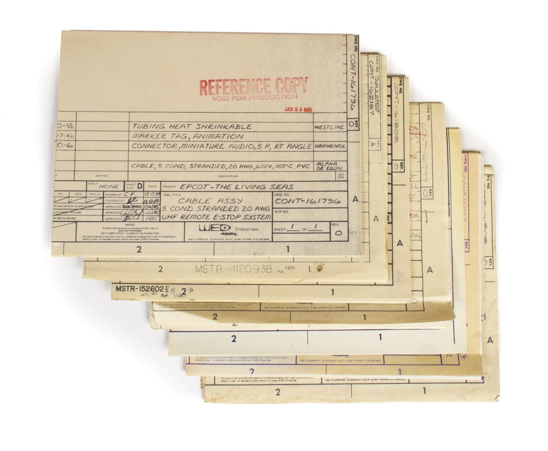 (EPCOT, 1984-88) A set of (7) brownlines used during the development of "The Living Seas" attraction at EPCOT. These brownlines primarily deal with the attraction's ride control systems, and feature scarcely seen information from the attraction as well as hand-written notes and highlighted sections. These brownlines measure approximately 22"x34" and the set is in overall good condition with some expected wear from use include some fold-wear and creases. The brownlines are stamped in red ink with the WED "Reference Copy" stamp and date stamp.