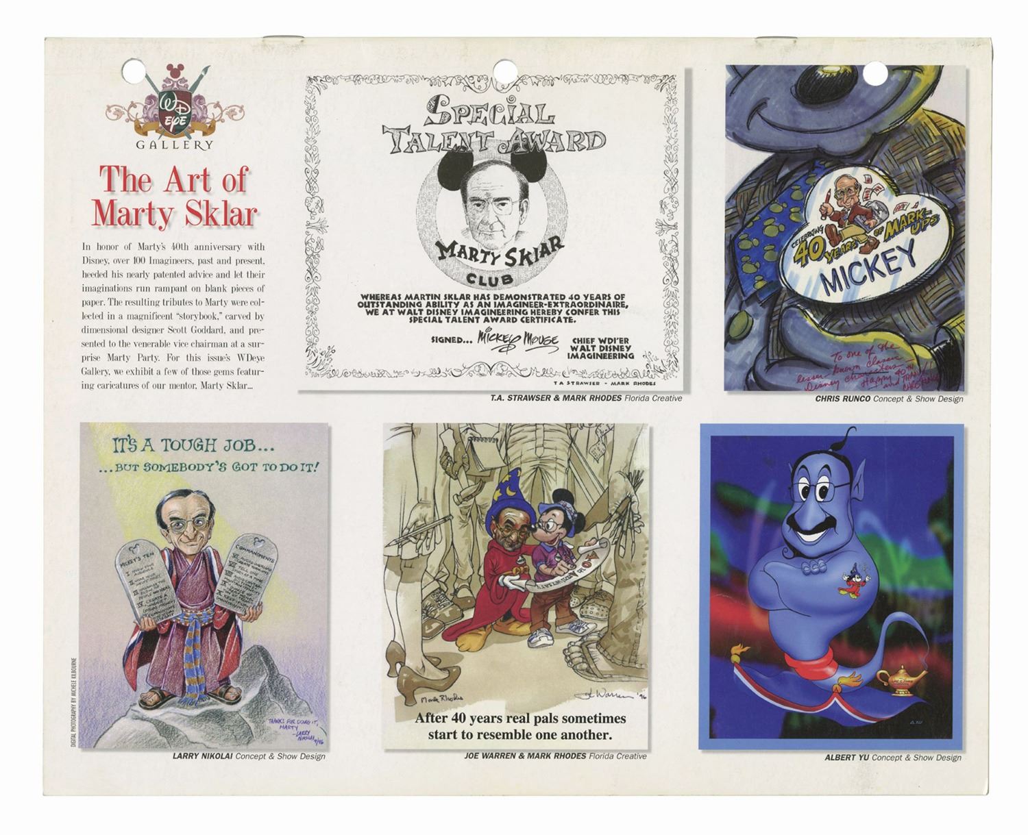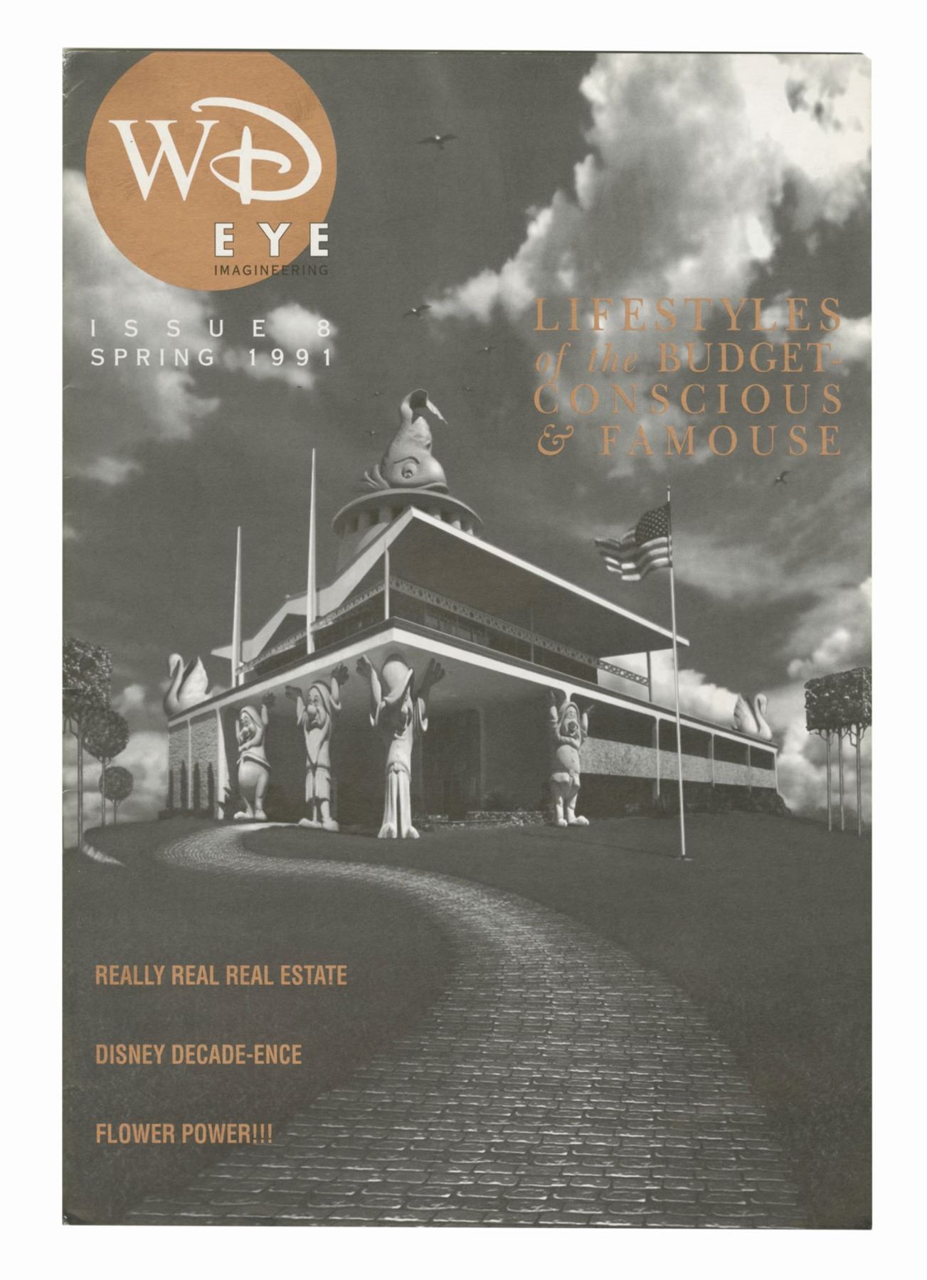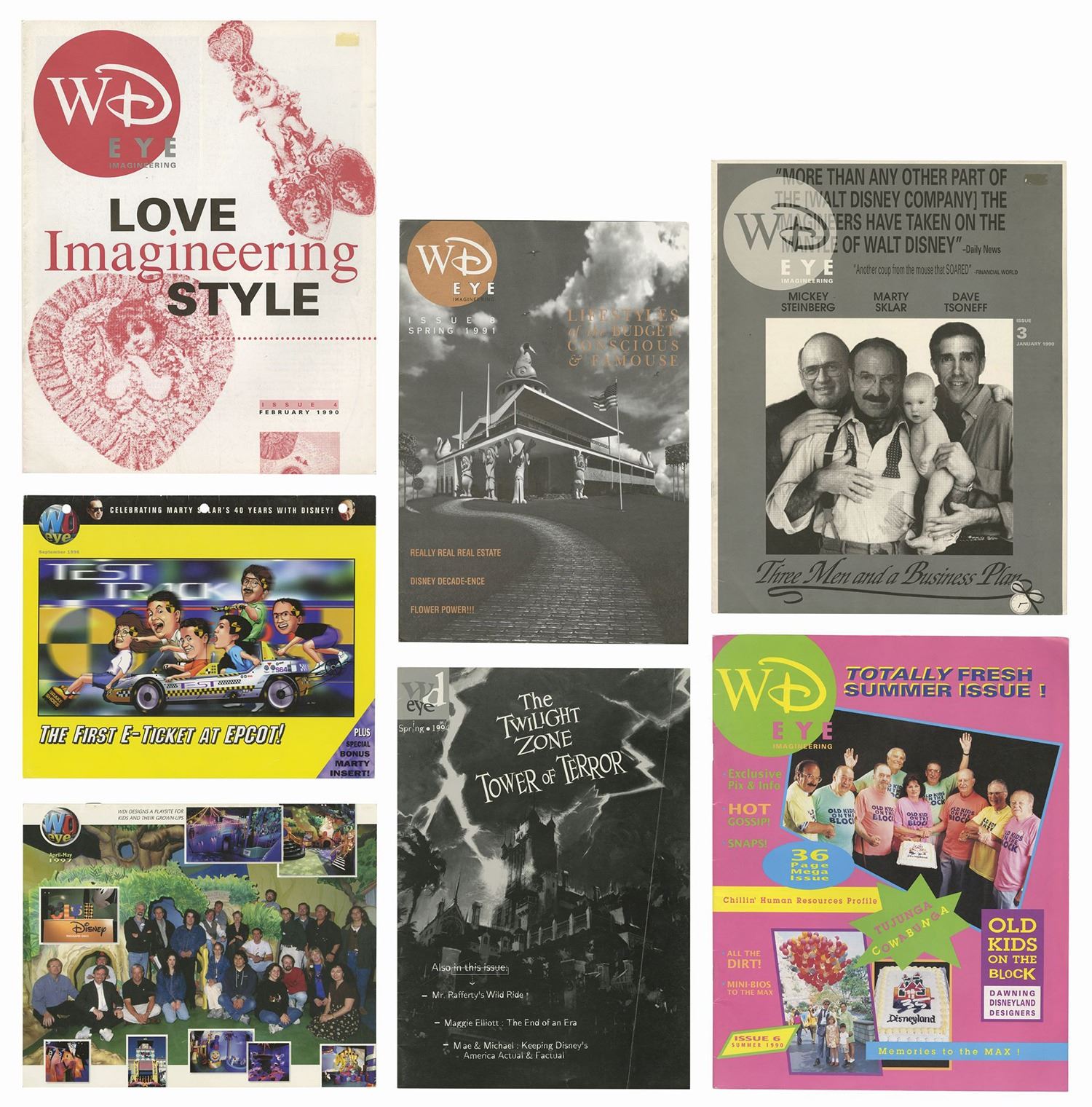 (Disneyland, 1990-97) A set of (7) WD Eye magazines that were made for Walt Disney Imagineering employees. The issues featured in this set are 1990 issues 3, 4, 6, the 1991 issue 8, the spring 1994 issue, the September 1996 issue, and the April-May 1997 issue. These issues feature articles about Imagineers and their lives inside and outside of working for Disney. The magazines measure between 10.75"x8.75" and 14"x11". They are in very good condition with minor wear and creasing to edges from use over time.