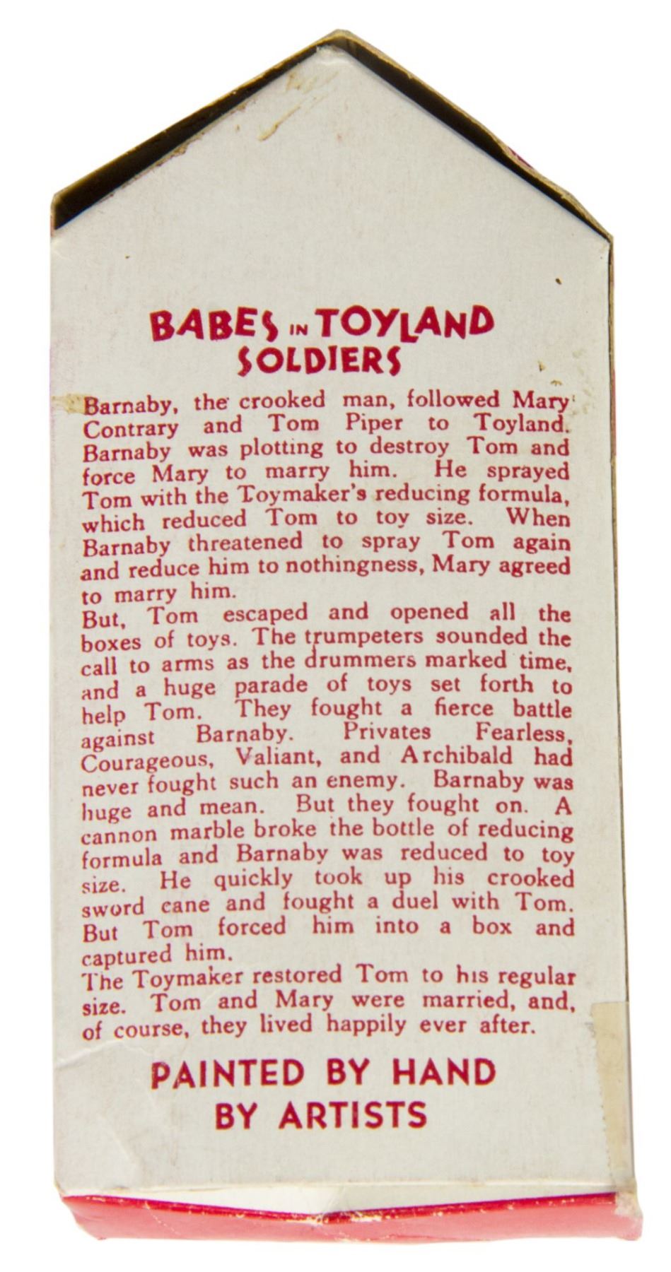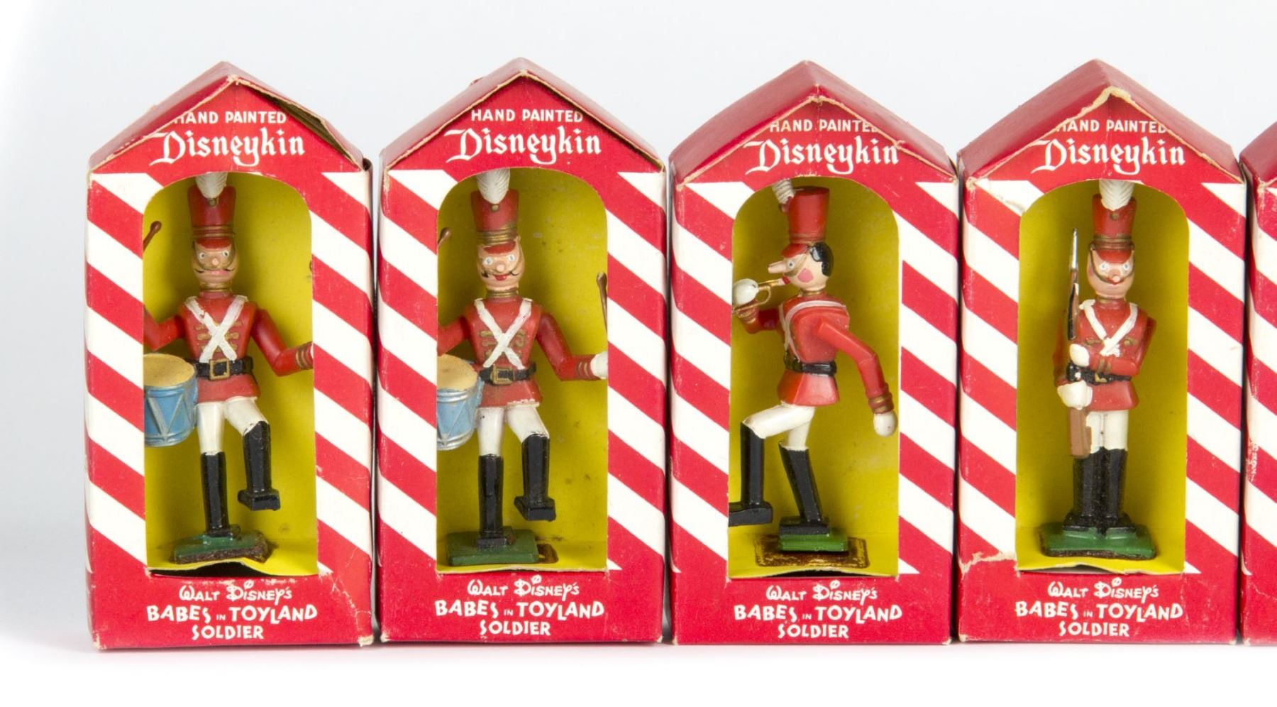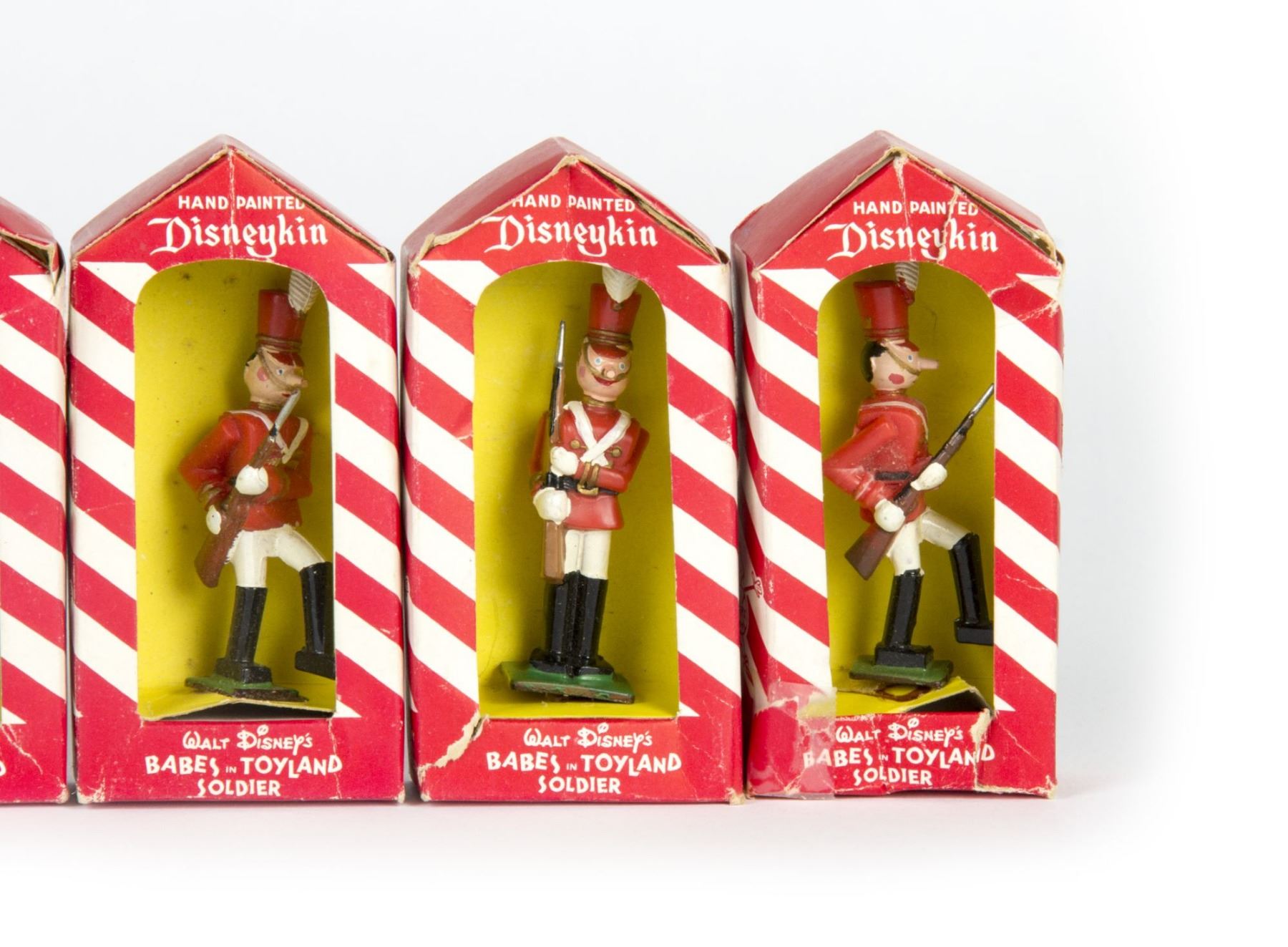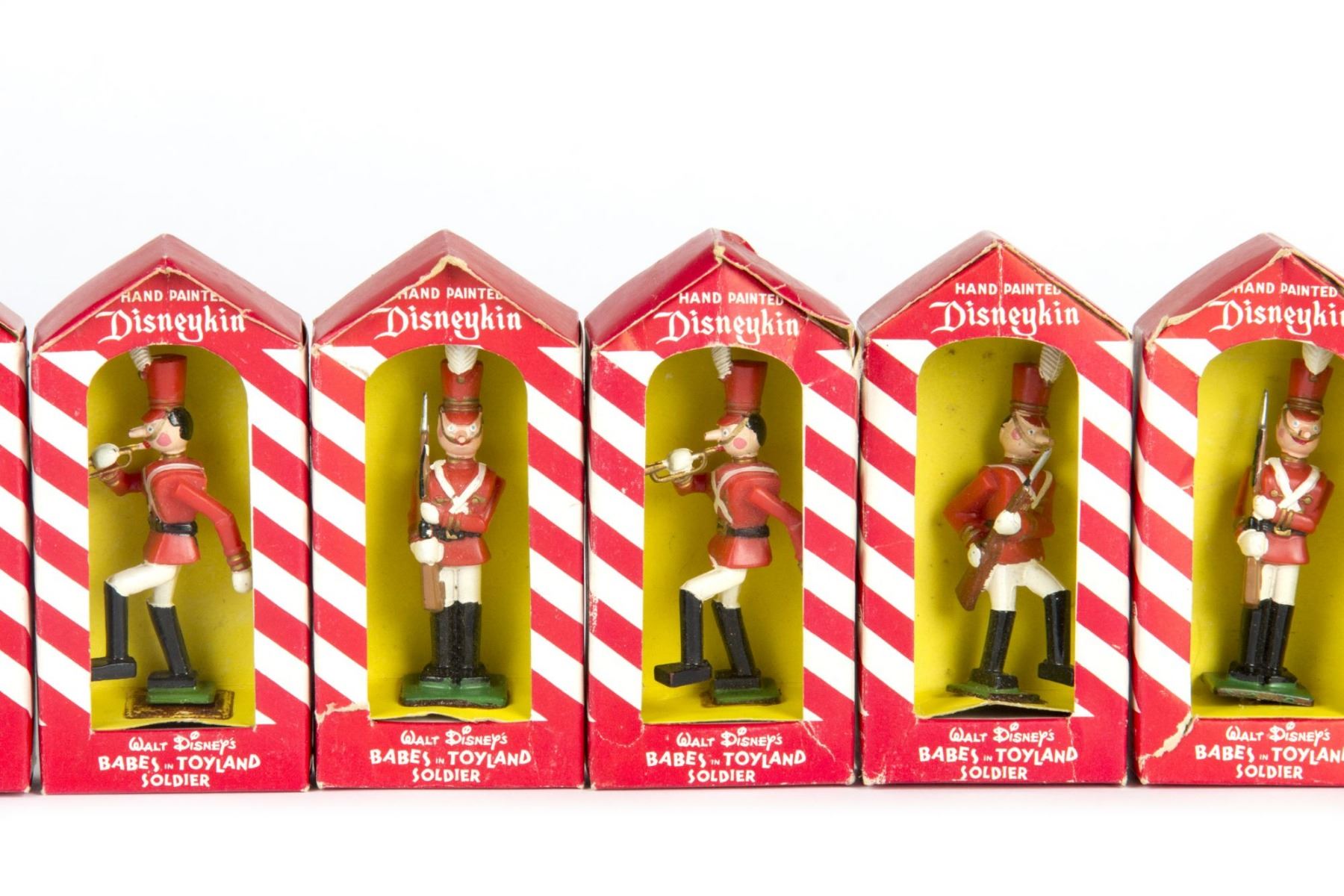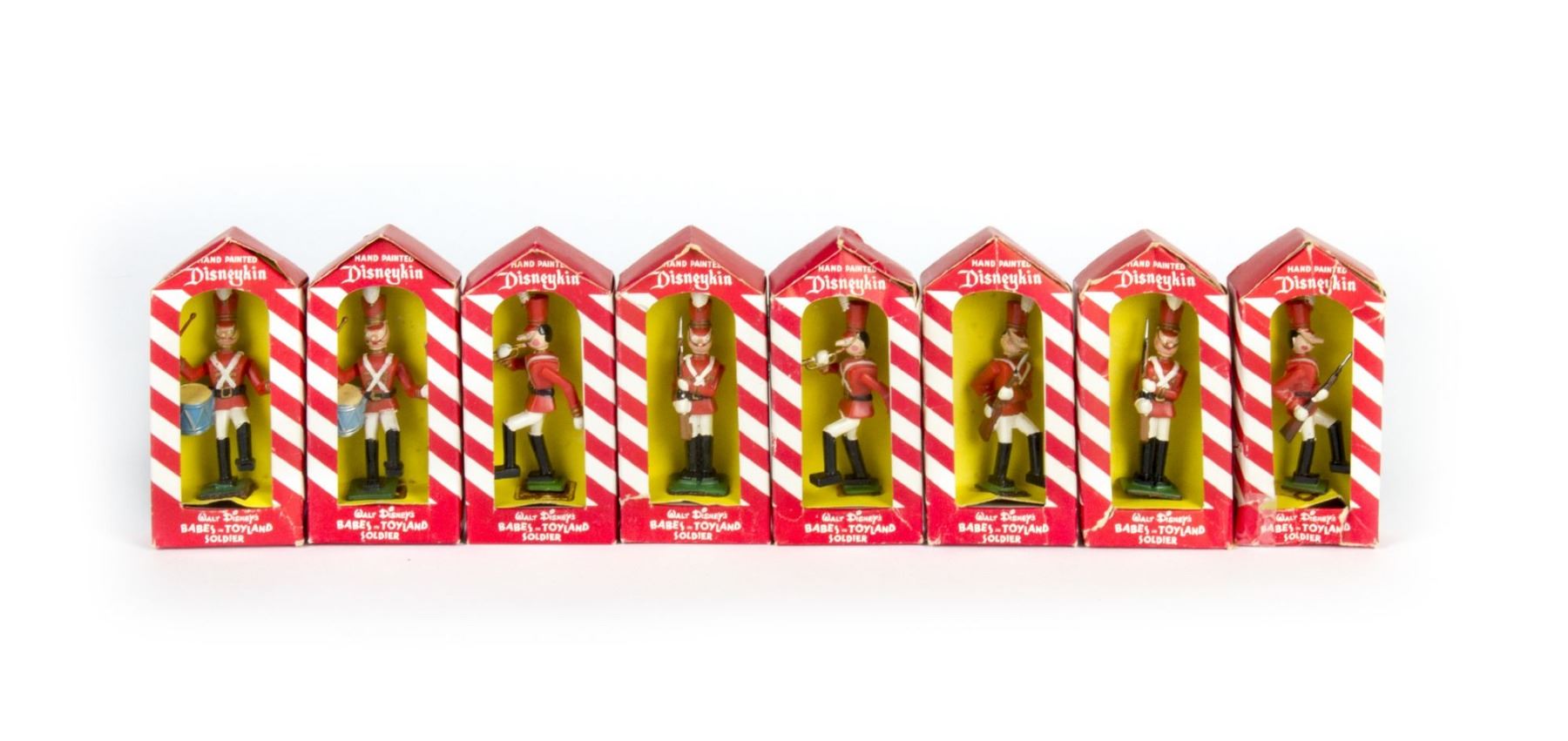 (Disneyland, 1961) A collection of (8) hand-painted Disneykins by Marx themed after the toy soldiers from the Walt Disney feature film, "Babes in Toyland". These soldiers were such memorable characters that they were included in numerous Disneyland parades over the years. This collection includes (2) drumming soldiers, (2) marching soldiers, and (2) soldiers at attention. Each Disneykin comes in its original box and measures 4.25" tall. The condition is good overall with some small spots of wear throughout.