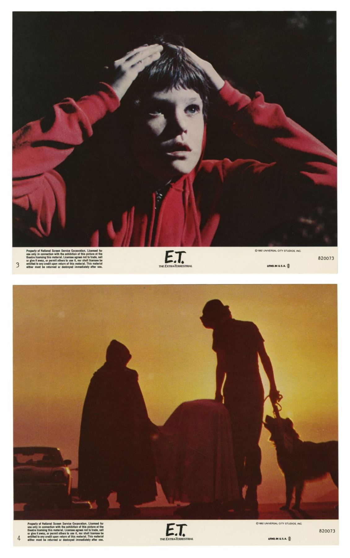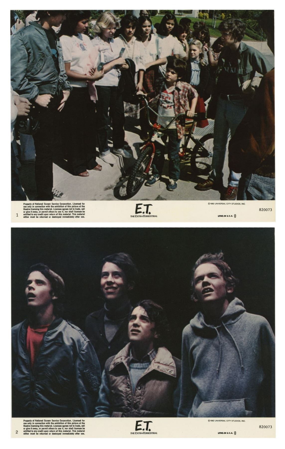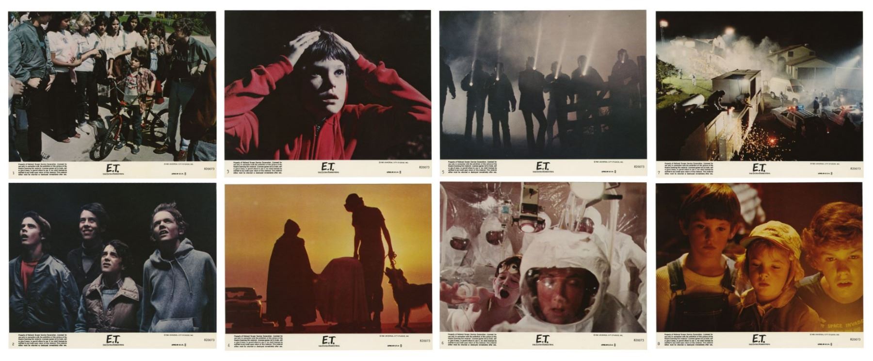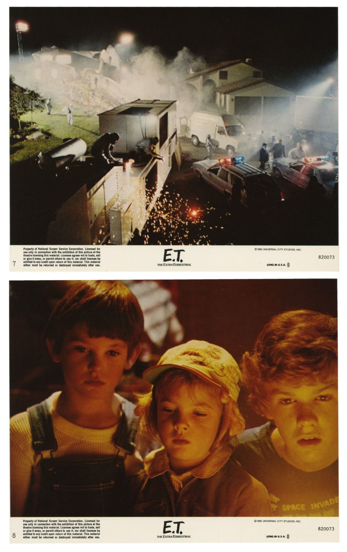 (Universal, 1982) A set of (8) lobby cards featuring imagery and information from "E.T. the Extra-Terrestrial". Issued by the National Screen Service, the set includes all cards numbers 1-8 and are lithographically printed. This is the smaller sized set of lobby cards which measure 8"x10" each. The condition is very good overall.