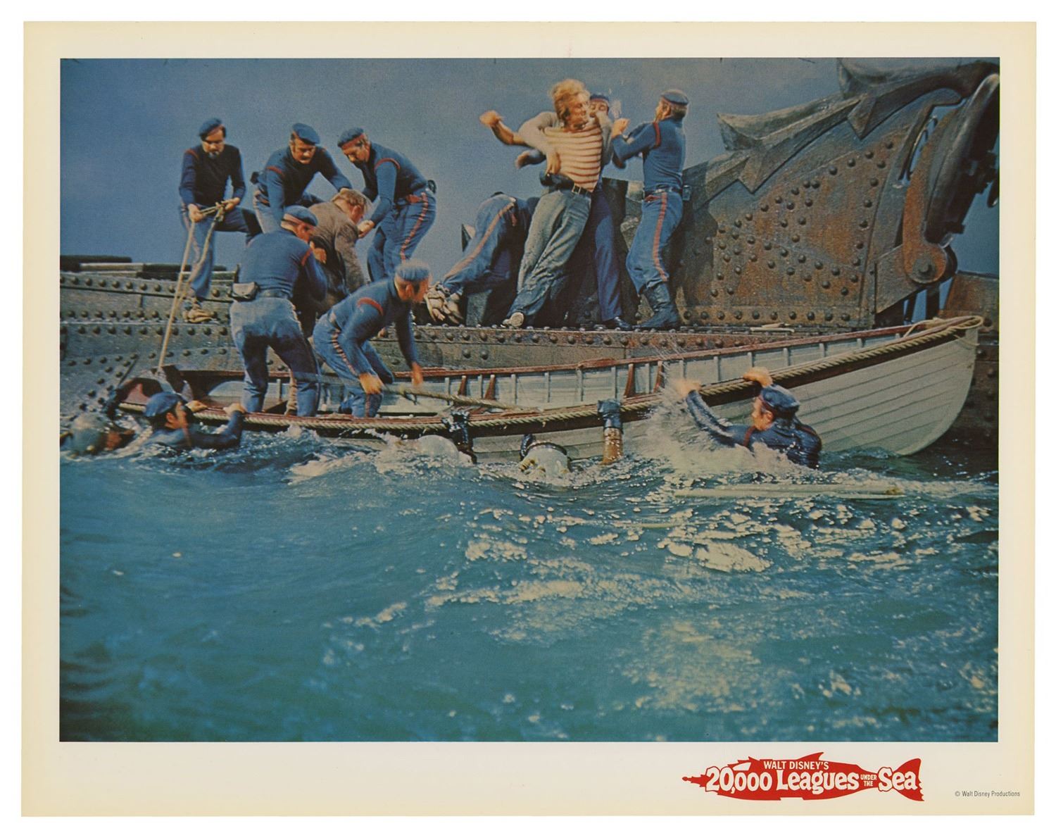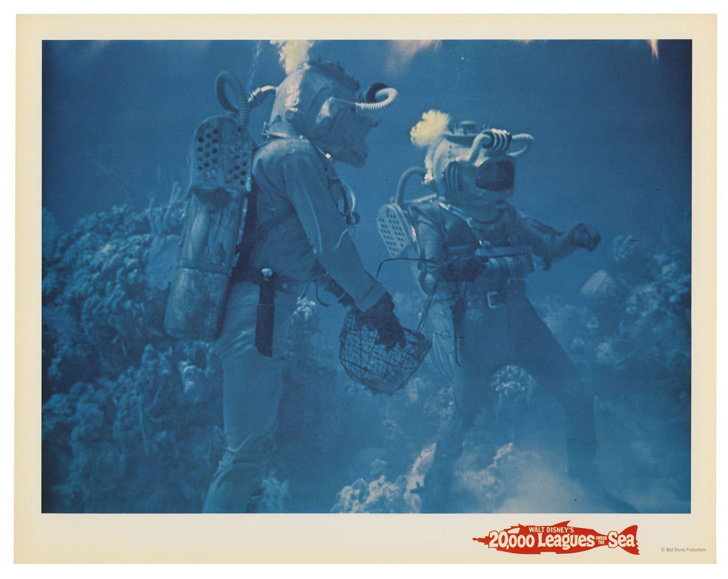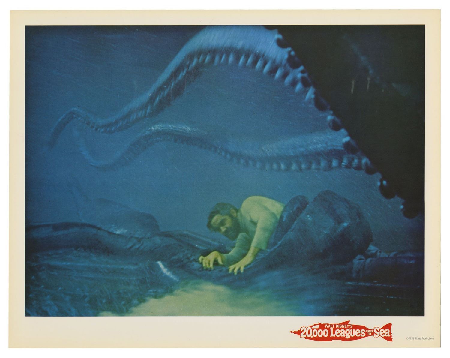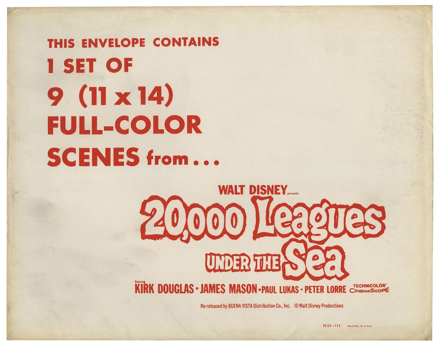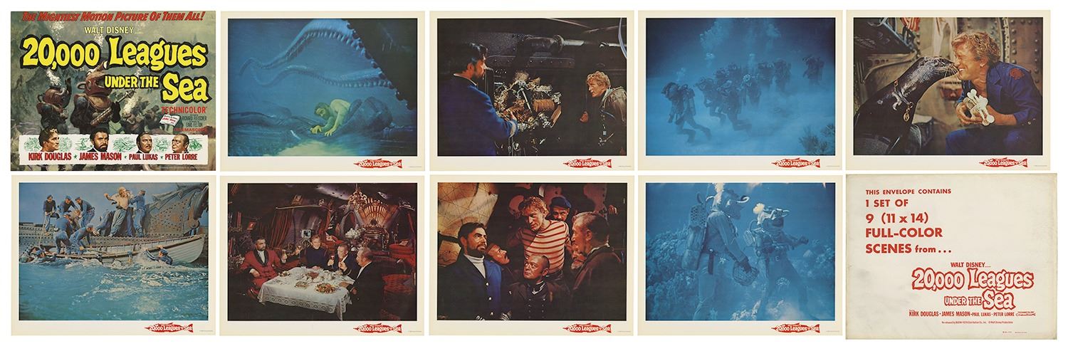 (Disney, 1963) A complete set of (9) lobby cards from the theatrical re-release of 20,000 Leagues Under the Sea. These printed lobby cards feature excellent full-color imagery from the film and measure 11"x14" each. The cards come in their original envelope and the set is in very good condition with minor wear, including some surface scuffs to the envelope and some writing on the back of the envelope.