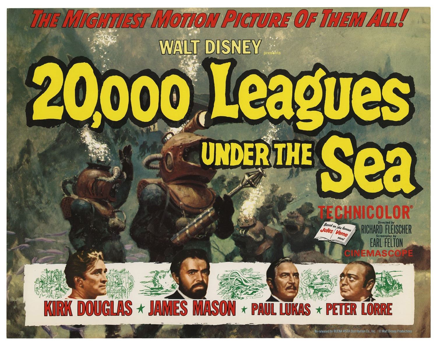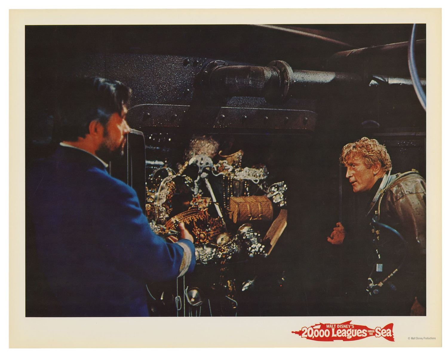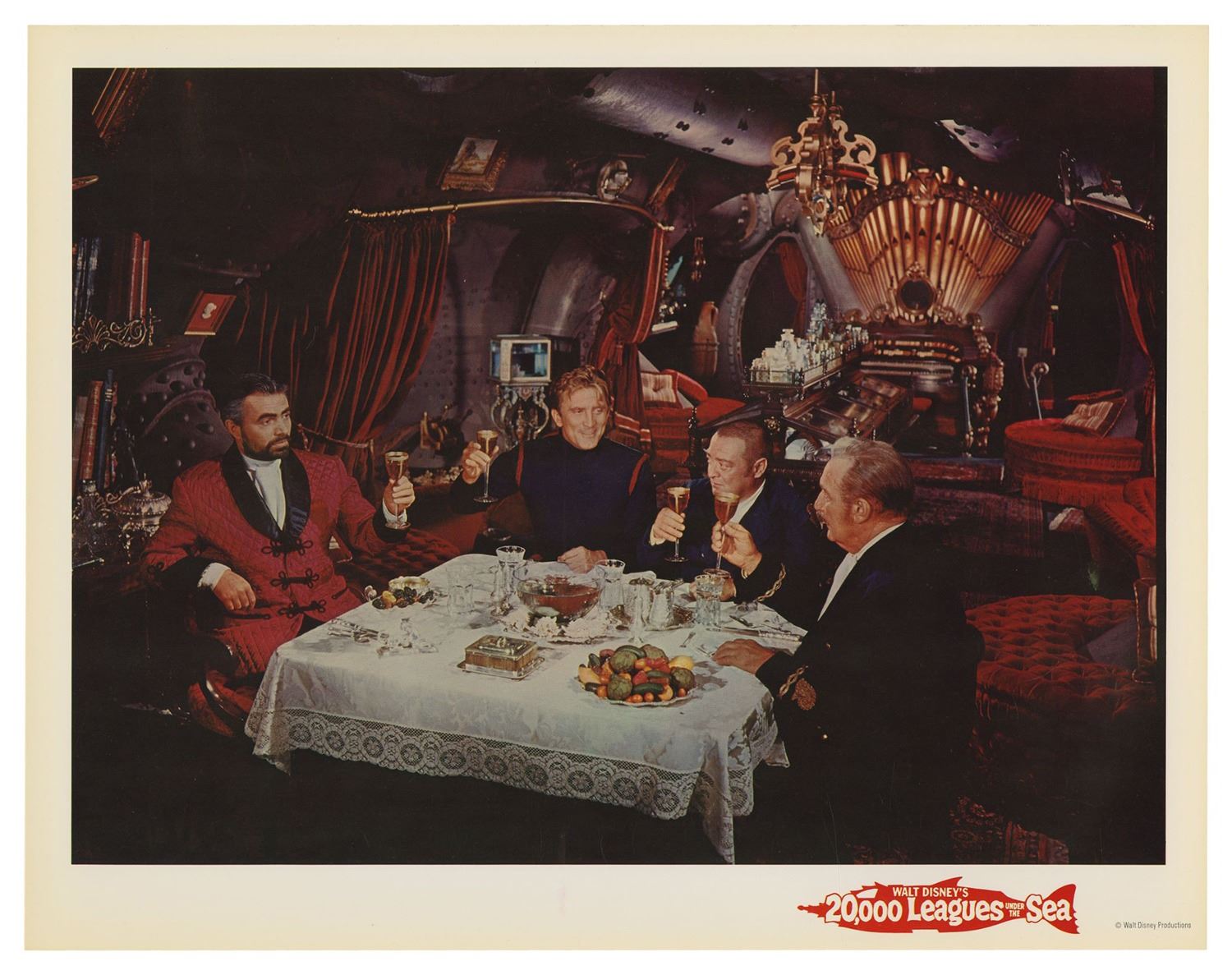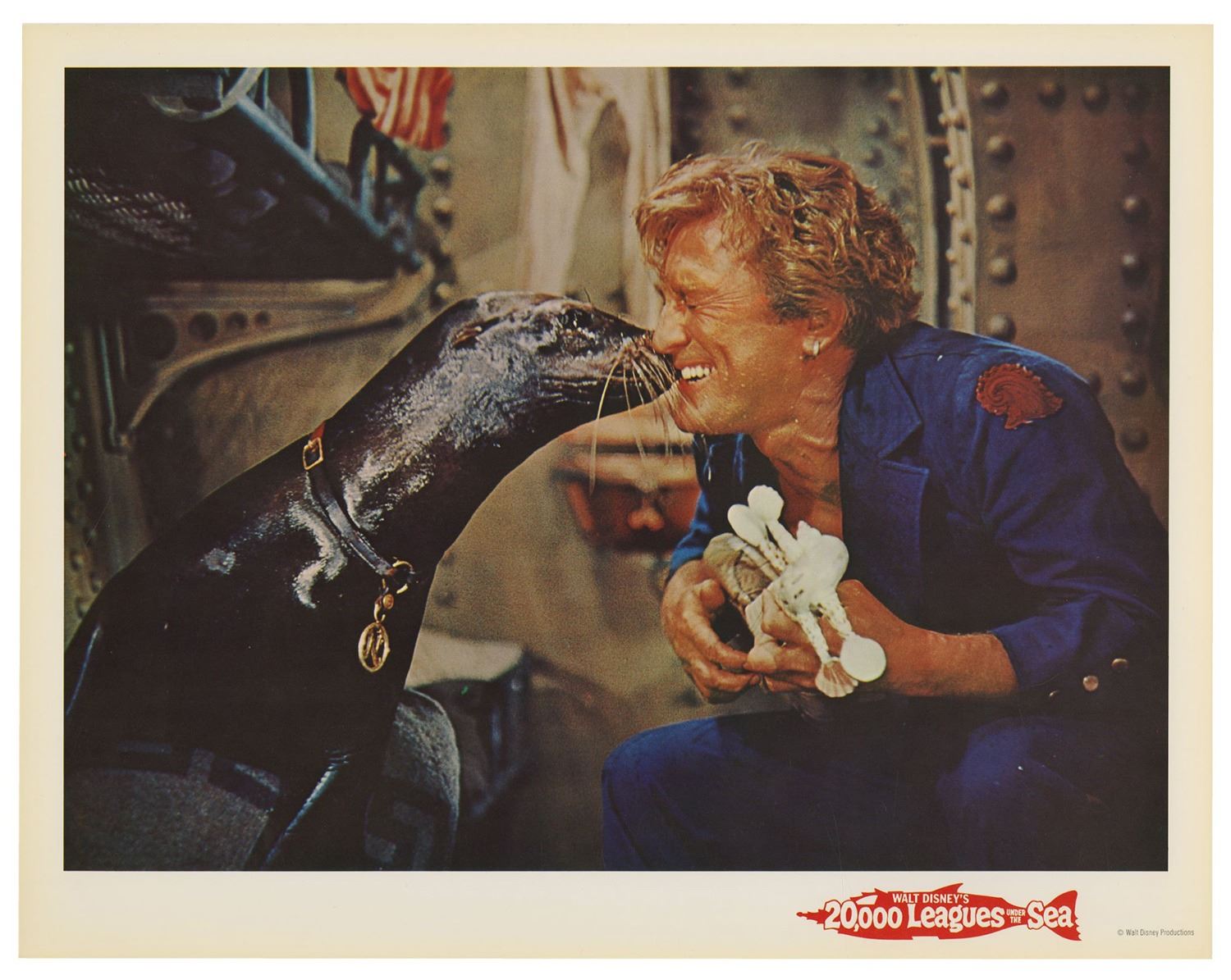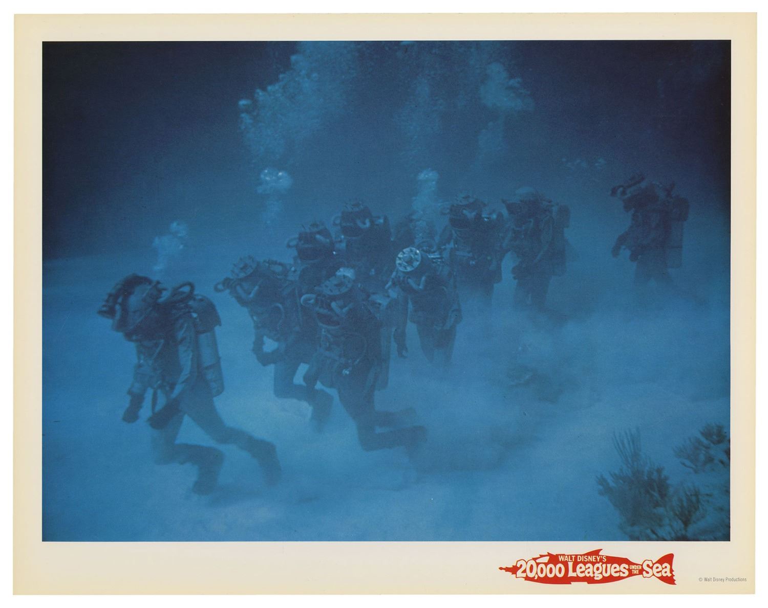 (Disney, 1963) A complete set of (9) lobby cards from the theatrical re-release of 20,000 Leagues Under the Sea. These printed lobby cards feature excellent full-color imagery from the film and measure 11"x14" each. The cards come in their original envelope and the set is in very good condition with minor wear, including some surface scuffs to the envelope and some writing on the back of the envelope.
