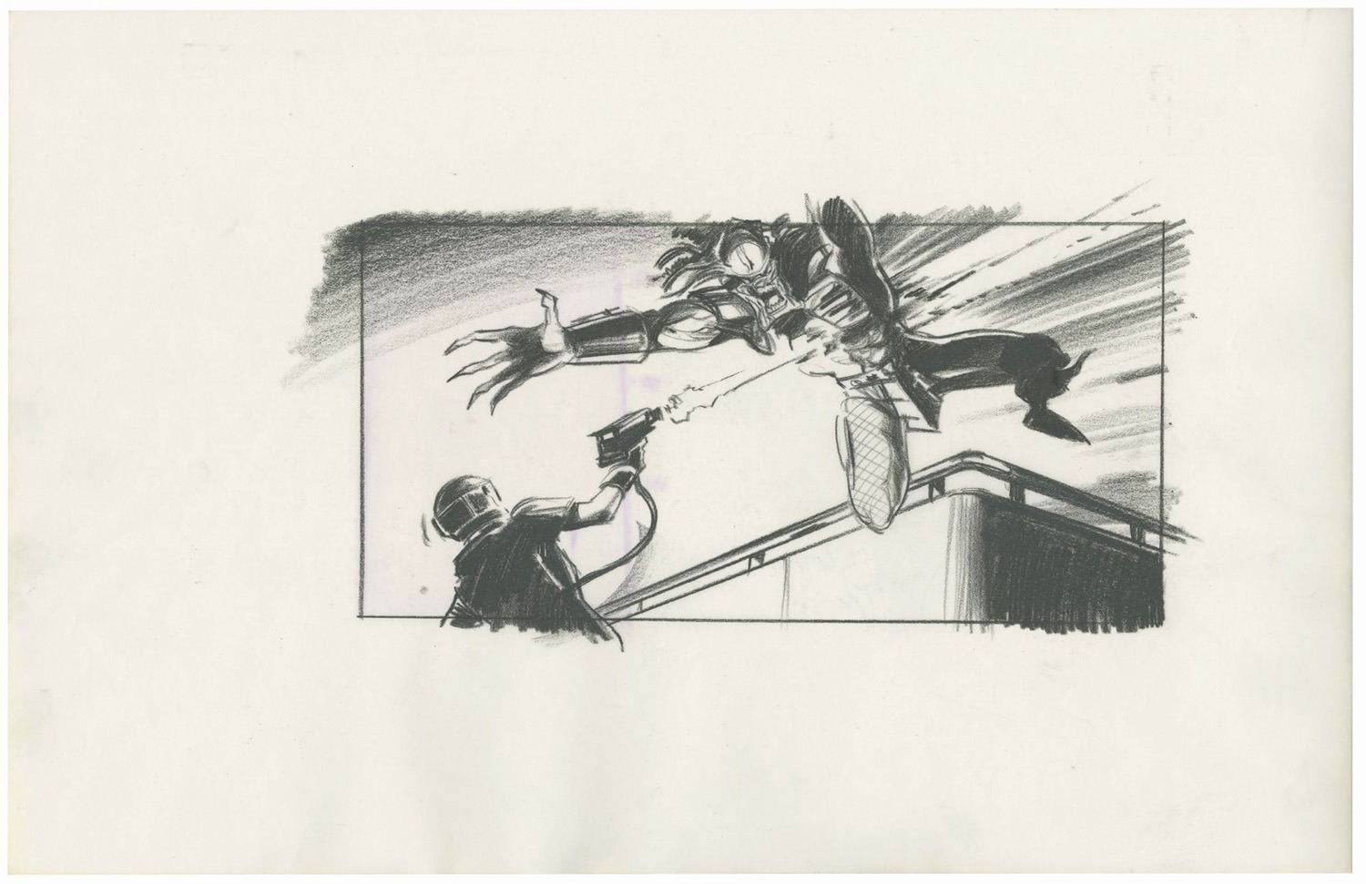 (Landmark Entertainment, c.1990s) A collection of (9) storyboards for The Predator Adventure attraction at FutureZone. The storyboards depict both the interior and exterior of FutureZone, as well as scenes from the attraction, and they are accomplished in pencil with marker. One of the storyboards measures 9"x13.75", while the rest measure 11"x17". All are in very good condition with expected edge-wear from age and use, including some small tears and creases, as well as a few spots of discoloration.