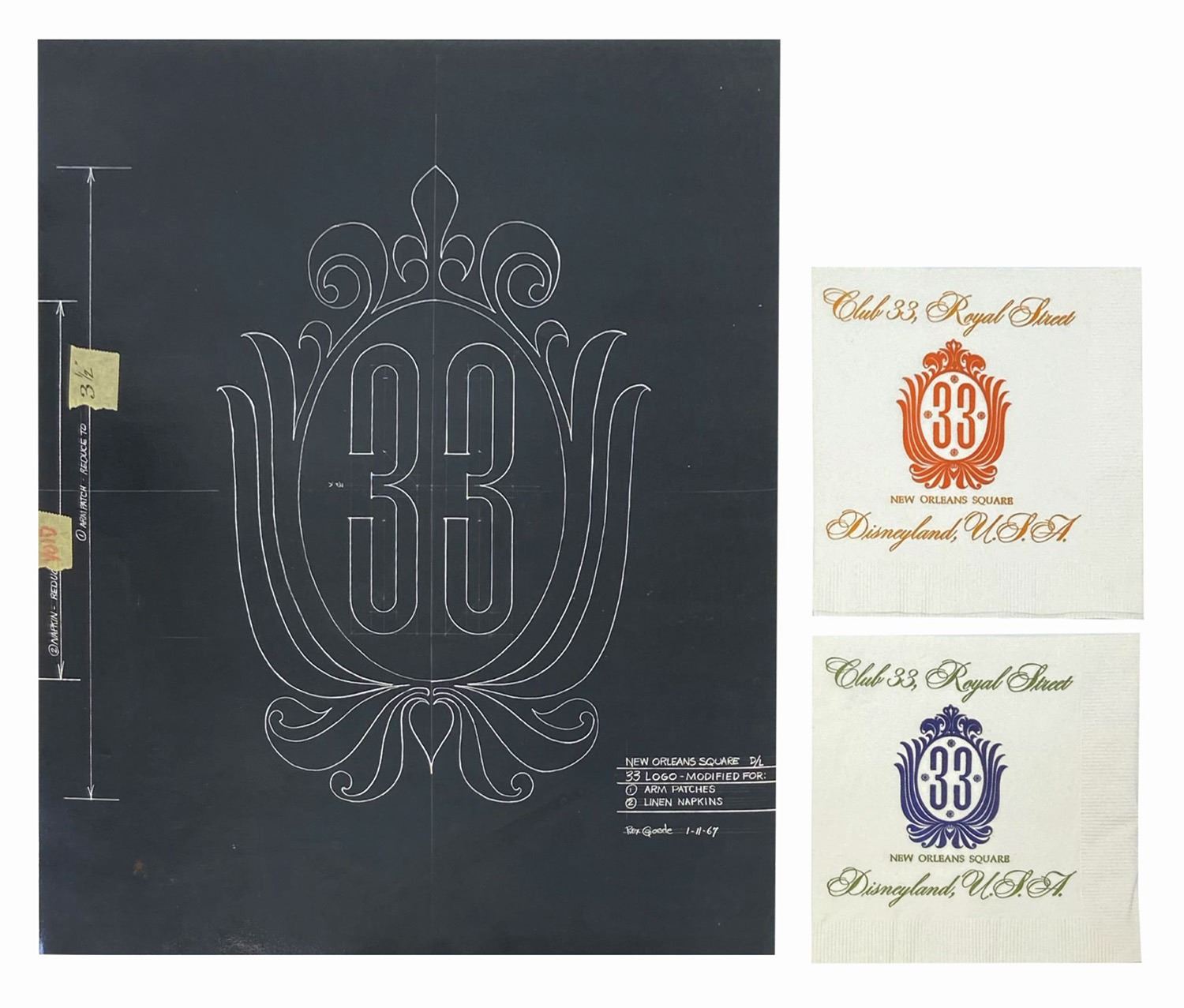 (Disneyland, c.1967) A collection of (2) napkin samples and logo printing artwork from Club 33. The photographic negative logo print features a large image of the Club 33 logo that was used to develop linen napkins and cast member arm patches. The two napkins feature the same logo imagery printed in two different color variations. Measuring 13.5"x11.25" and 5"x5" respectively, the print and napkins are in very good condition with slight discoloration, minor edge wear, and wrinkles in areas near the corners.