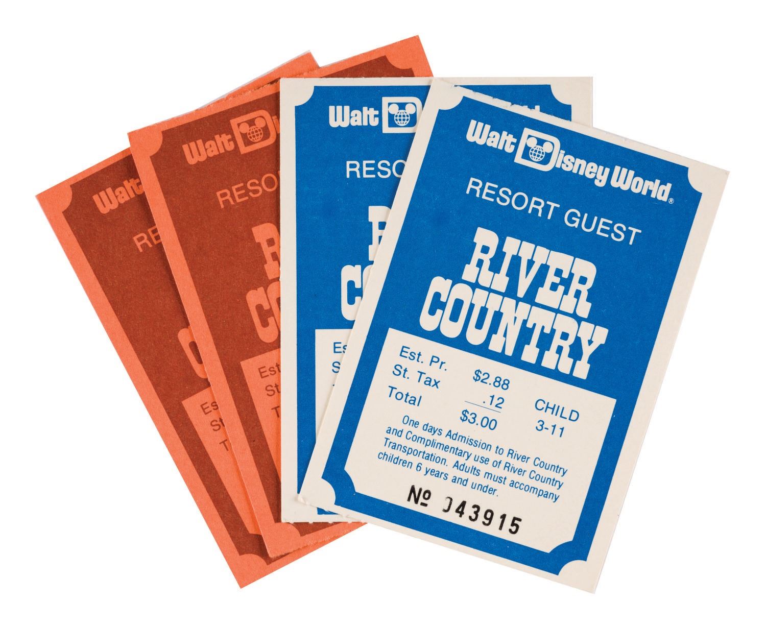 (Walt Disney World, 1978-79) A pair of Adult ticket stubs and a pair of Child ticket stubs to River Country at Walt Disney World. Stamps on the back of one child's tickets indicate it was used on March 31, 1979. Measuring 3.25"x2.25", the ticket stubs are in fine condition.