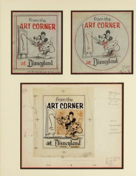 (Disneyland, c.1956) A beautiful set of (3) illustrations used in the creation of a logo for Disneyland's "Art Corner". This logo design was used on some of the early shopping bags and merchandise from the "Art Corner" and features a charming image of Mickey Mouse as a painter. This set includes two illustrations used in the creation of the logo, with one in a square shape and the other circular. These illustrations are framed above the more finalized logo below, which features a cel layer with text placed over the inked illustration on paper, and shows the image as it appears on the "Art Corner" shopping bags and merchandise. The illustrations feature notes throughout, and list the extension number for Disney animator Ken Peterson, who likely aided in the creation of this artwork. This set measures 30.25"x25.5" framed, and is in very good condition.