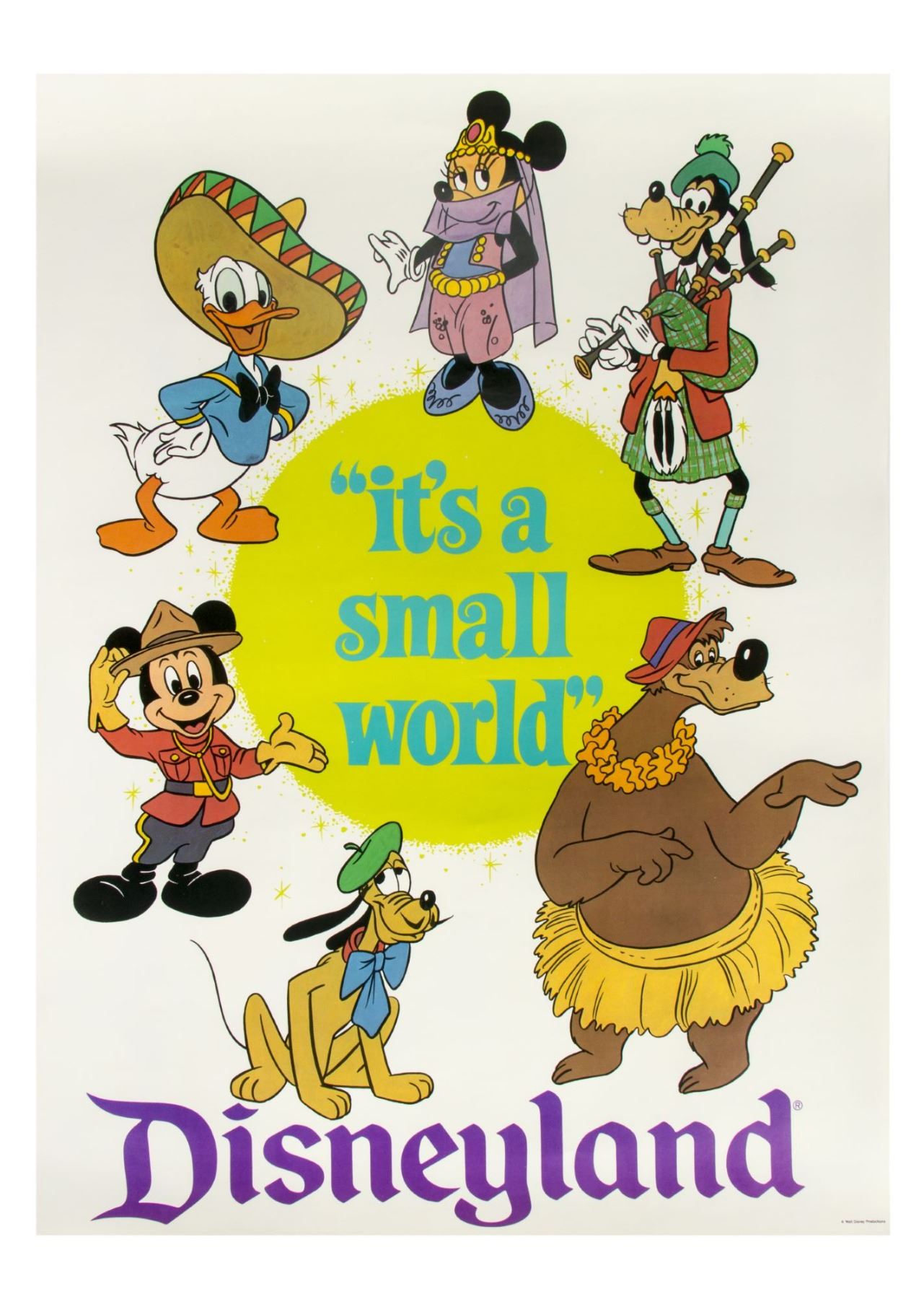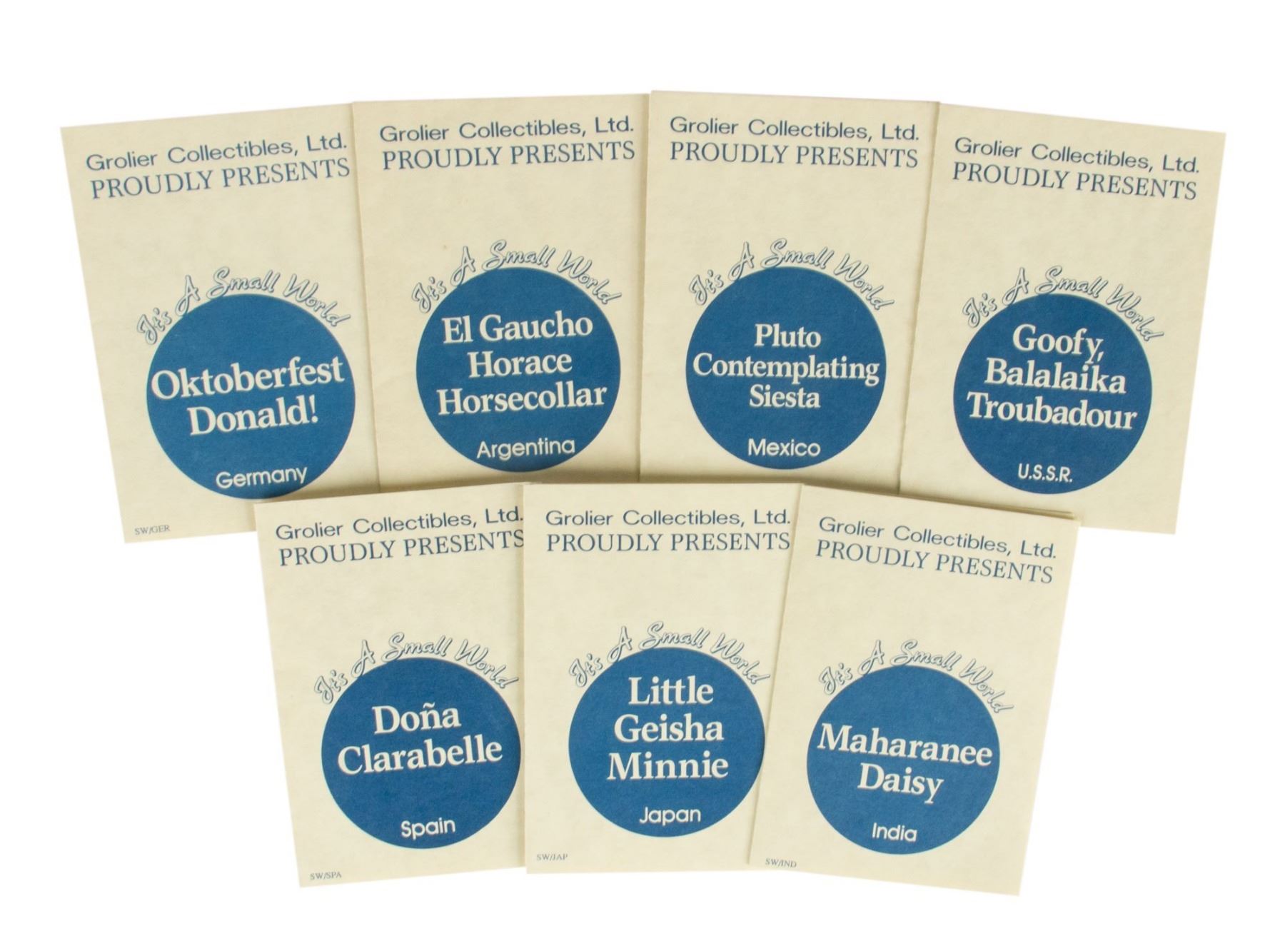 (Disney, 1994) A set of eight figures depicting popular Disney characters themed after the children seen in Disneyland's "It's a Small World". These figures come with wood bases and their original Certificate of Authenticity. The figures vary in size with most measuring approximately 4.5" tall, not including the bases. The set is in very good condition, and includes an "It's a Small World" poster.