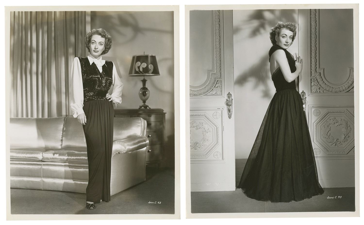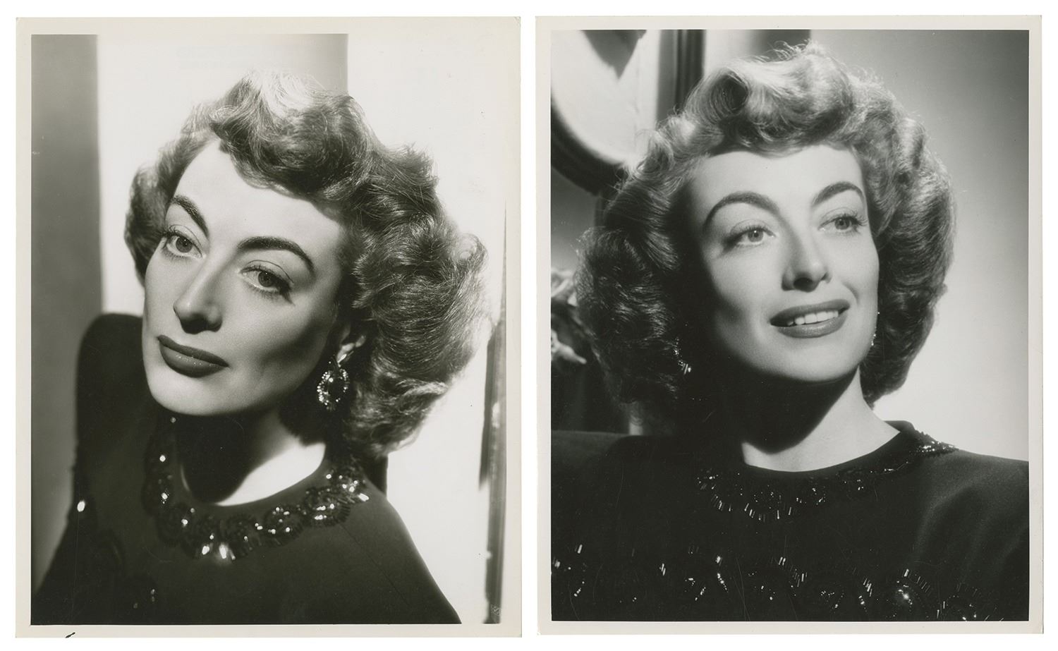 (Goff, c.1940s) A set of (10) Joan Crawford publicity photos from the collection of Harper Goff. These publicity stills capture Crawford throughout the 1940s. Goff worked as a set designer for a wide variety of films and studios between the 1940s-70s, so it is uncertain whether he worked on a Joan Crawford project in an uncredited role or if these photographs were simply kept for Goff's personal reference. Measuring 10"x8.25", the photos are in good condition with some edge-wear and spots of surface wear.