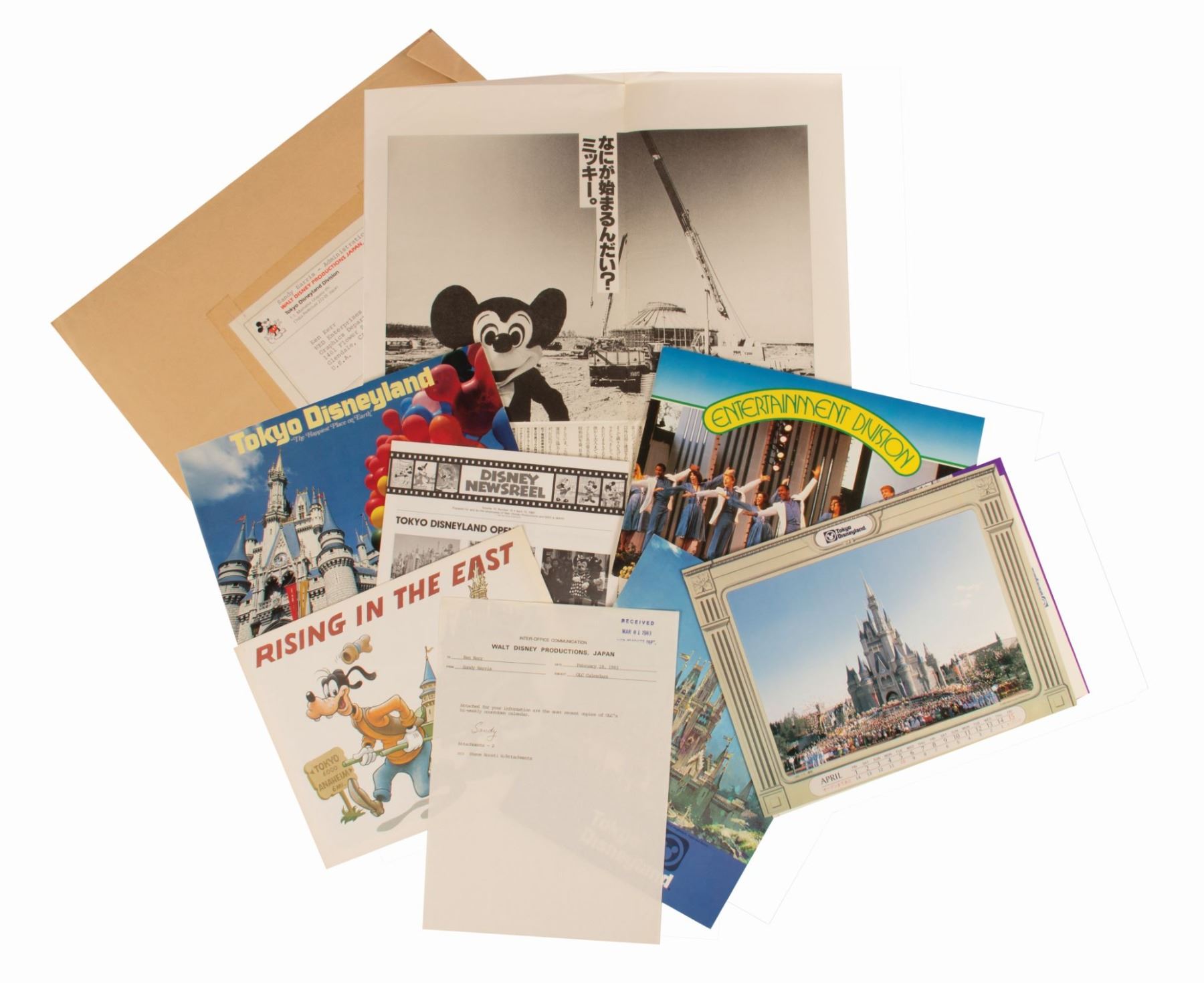 (Tokyo Disneyland, 1981-83) A collection of WED Imagineering materials relating to the construction and grand opening of Tokyo Disneyland. The collection includes a Tokyo Disneyland Division envelope mailed to a member of WED Imagineering, an Inter-Office Communication, a 5-sheet bi-weekly countdown calendar for the opening of the park, Japanese construction poster, Tokyo Disneyland guidebook, Disney Newsreel magazine, Tokyo Disneyland Entertainment Division guidebook, Tokyo Disneyland 1981 brochure, and a 1982 copy of WED/Mapo Imaginews. The set provides a fantastic archive of information on the creation and opening of this beloved park, and the items range in size from 11"x8.5" to the 24.5"x17.5" poster. The collection is in good condition overall with some creases and surface wear throughout from use.