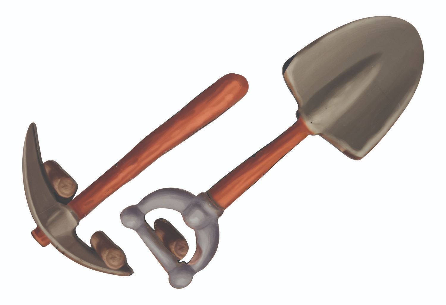 (Walt Disney World, 2013-14) A pair of rare Dwarf’s pick and shovel display pieces from The Seven Dwarf’s Mine Train construction wall in Fantasyland at The Magic Kingdom. Measuring 16.75” x 11.5” and 21.75” x 8”, these pieces are in very good Park-used condition with light wear from exposure, handling, and age.