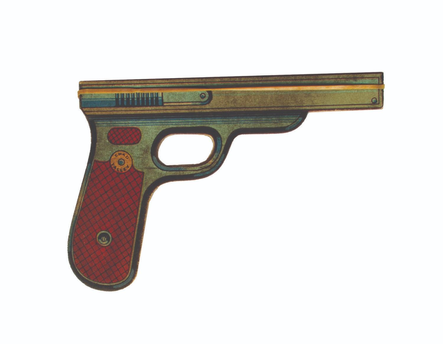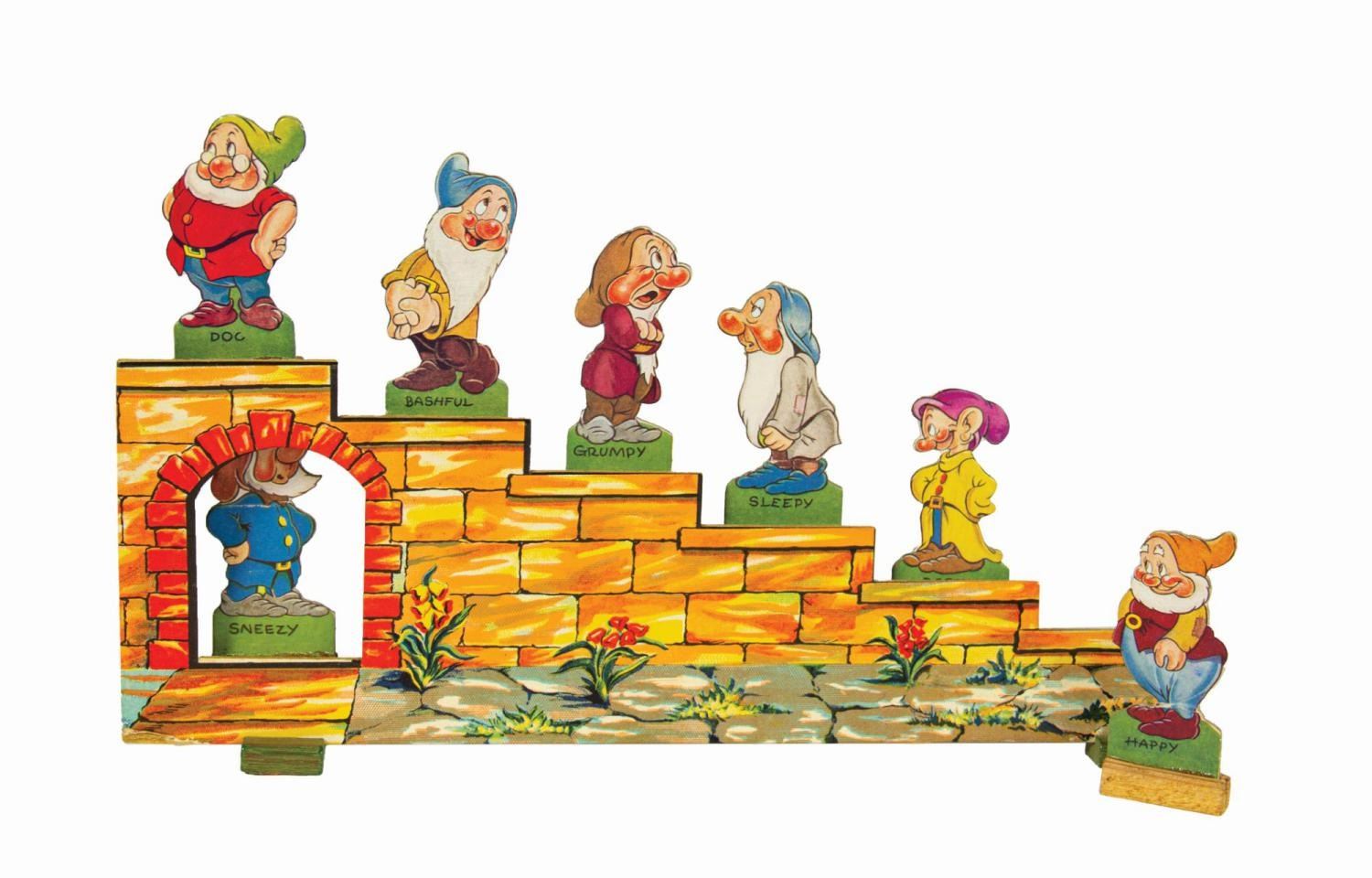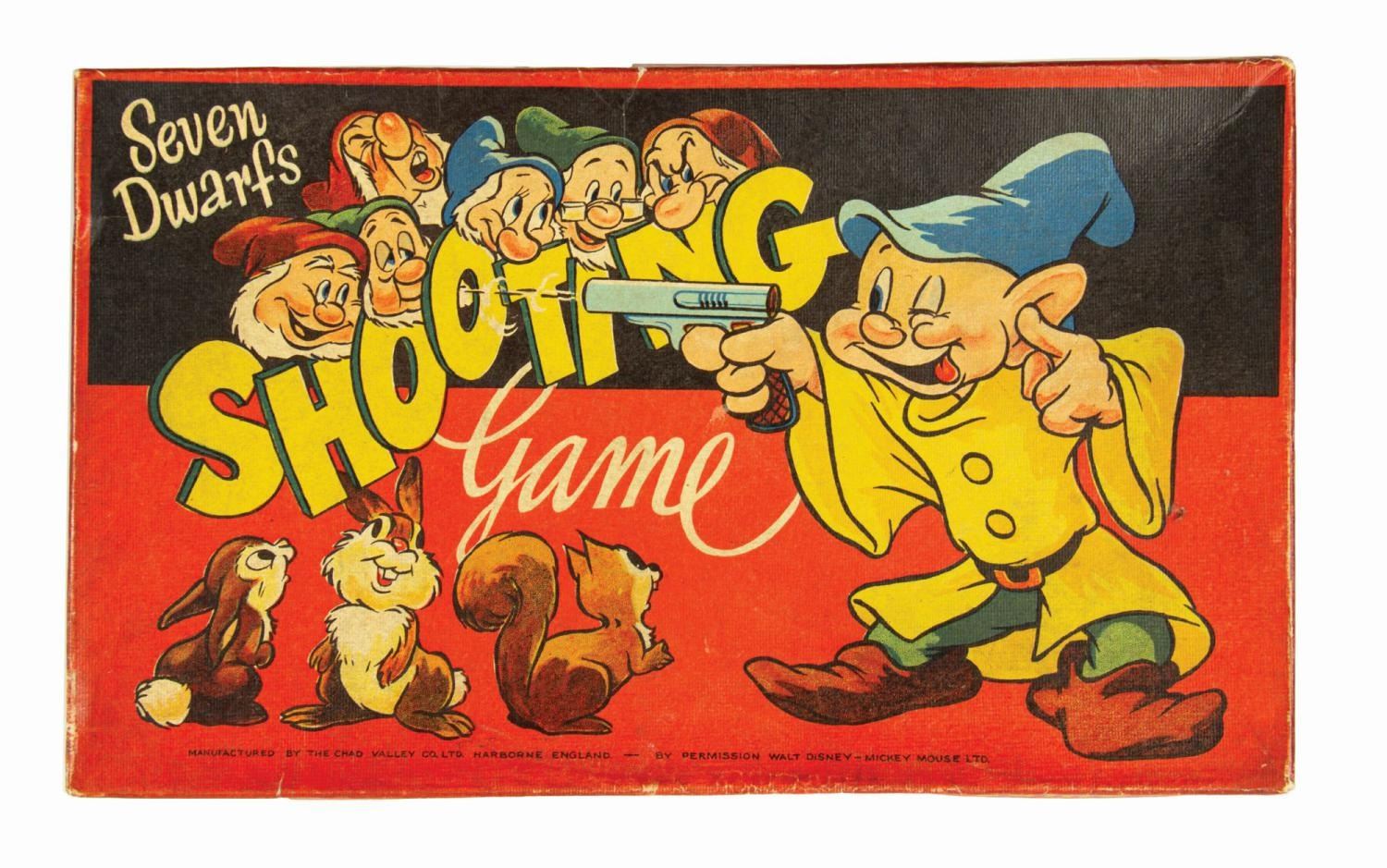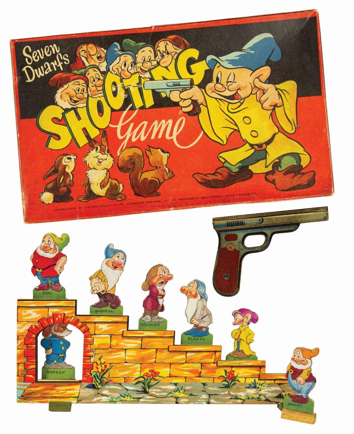 (Chad Valley, c.1940) A Seven Dwarfs Shooting Game manufactured by English toymaker Chad Valley. The set consists of cardboard cutout targets with wood block stands depicting each of the Seven Dwarfs, a cottage facade target stand, and a cardboard cutout pistol used to aim and shoot rubber bands. A vintage rubber band and an extra wooden block stand are also included. All items are assembled in the original cardboard box packaging. The pieces are in generally good condition with surface wear and spots of discoloration. The box measures 7"x12" and 1" deep and exhibits a tear in the top edge, some discoloration, and surface wear.
