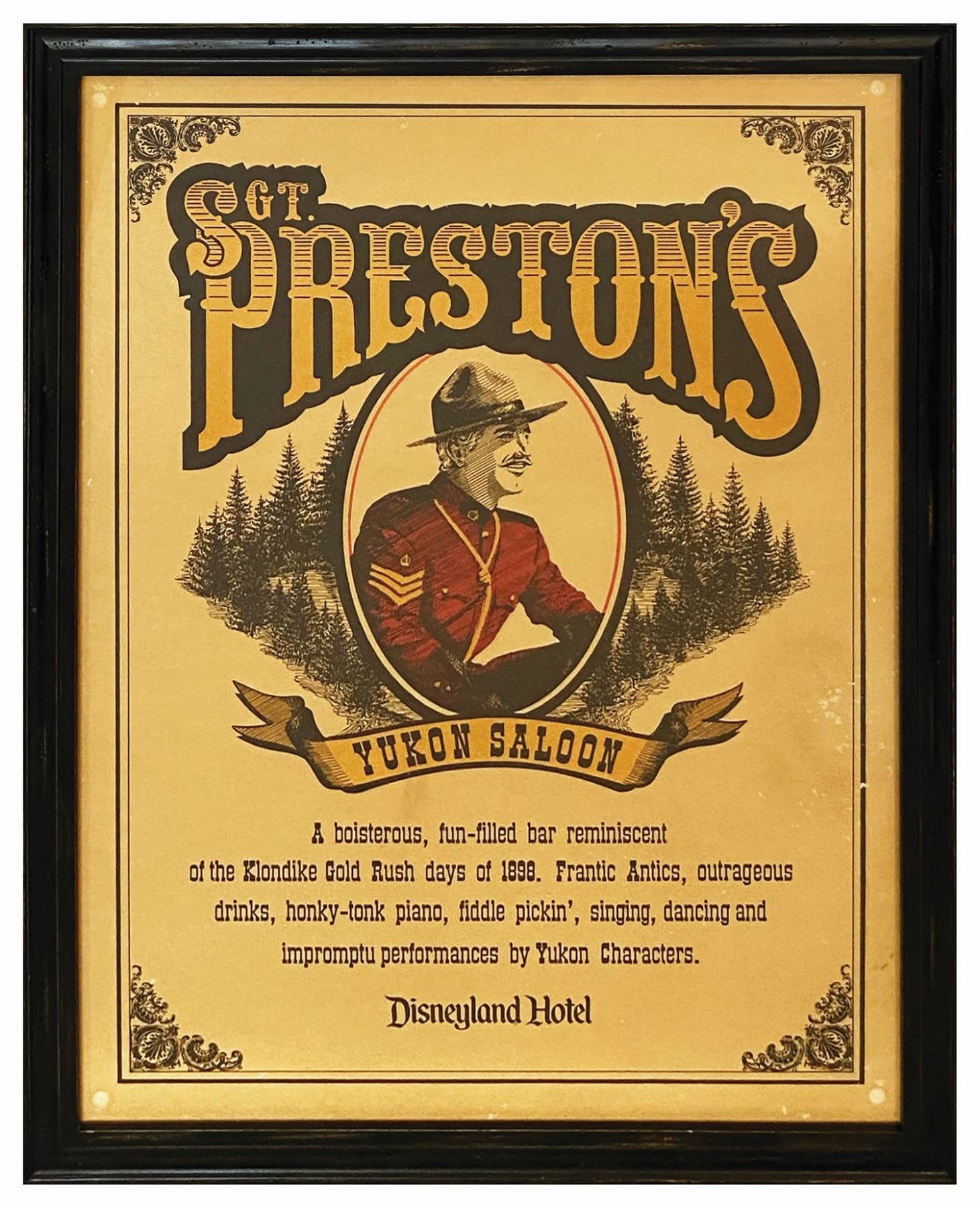 (Disneyland Hotel, c.1990) A wonderful poster created for Sgt. Preston's Yukon Saloon at the Disneyland Hotel. This poster is printed on high-quality paper with an intentionally aged appearance, and is believed to have been created for display within the Disneyland Hotel. Measuring 23.5"x17.5" in the 26"x20" frame, the poster is in fair condition with moderate surface wear throughout. There are pin marks at the corners, with discoloration where the pins were placed.