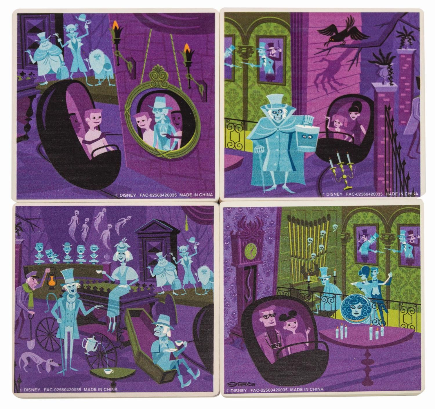 (Disneyland, 2019) A set of (4) coasters with artwork by Shag released in celebration of the Haunted Mansion's 50th anniversary. Each of the cork-backed ceramic coasters features of portion of Shag's commemorative composition, titled "31 Ghosts." Measuring 4"x4", the coasters are in very fine, as-new condition.