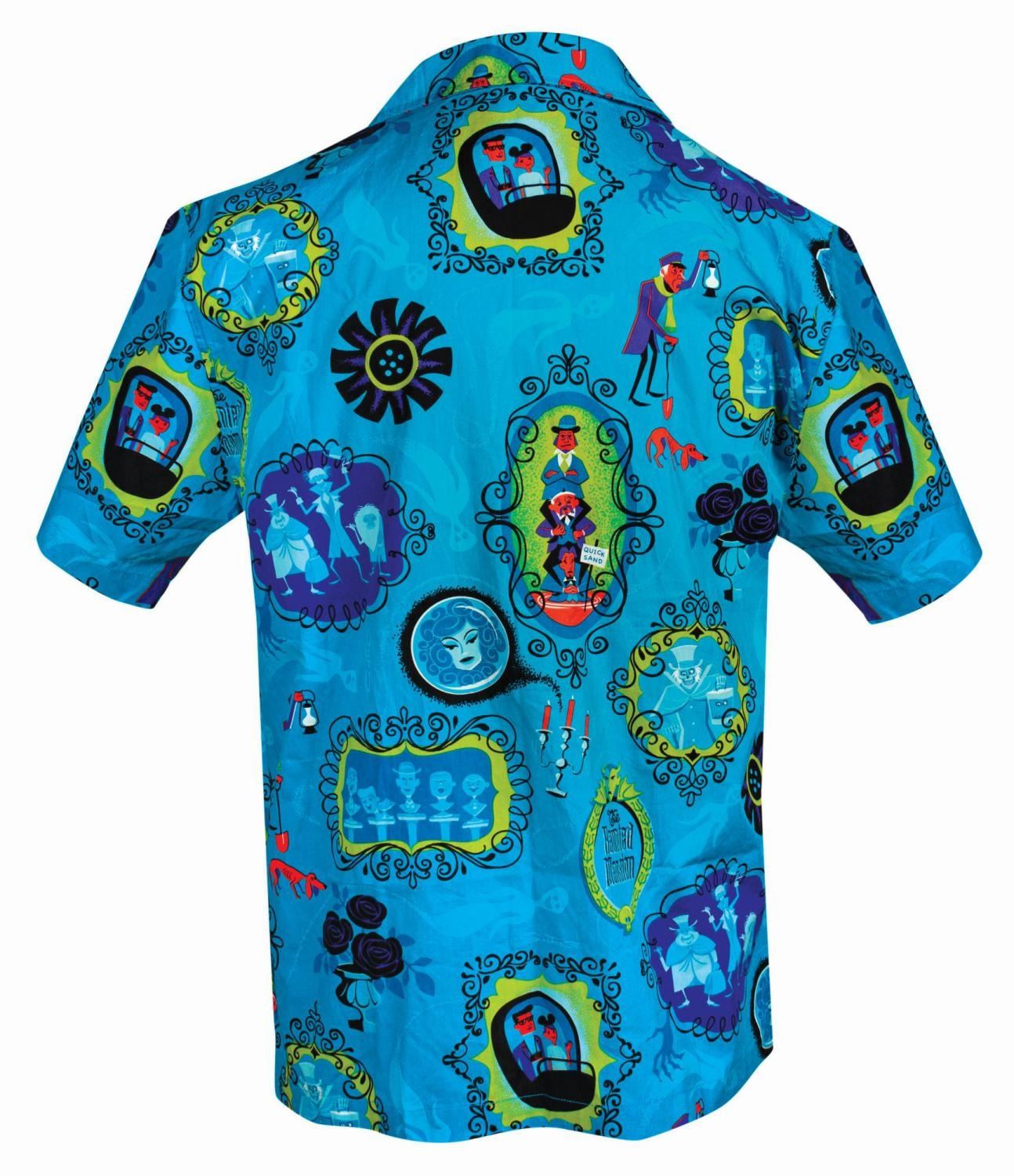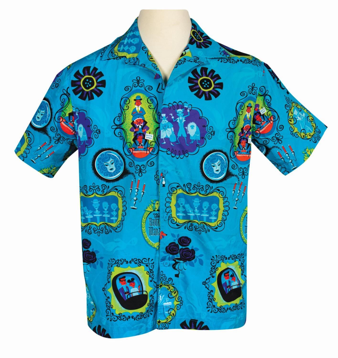 (Disneyland, 2019) A Haunted Mansion-themed Hawaiian-style shirt designed by Shag in honor of the attraction's 50th anniversary. The short-sleeve, button-down collared shirt features a bold graphic print of elements from the ride interpreted in Shag's inimitable retro Mid-Century style, including the Hitchhiking Ghosts, Madame Leota, the Quicksand Men, the Hatbox Ghost, Singing Busts, the gate plaque, floating candelabras, and more. A size large, the shirt retains its original internal Disney Parks tag and remains in very fine, un-worn condition.