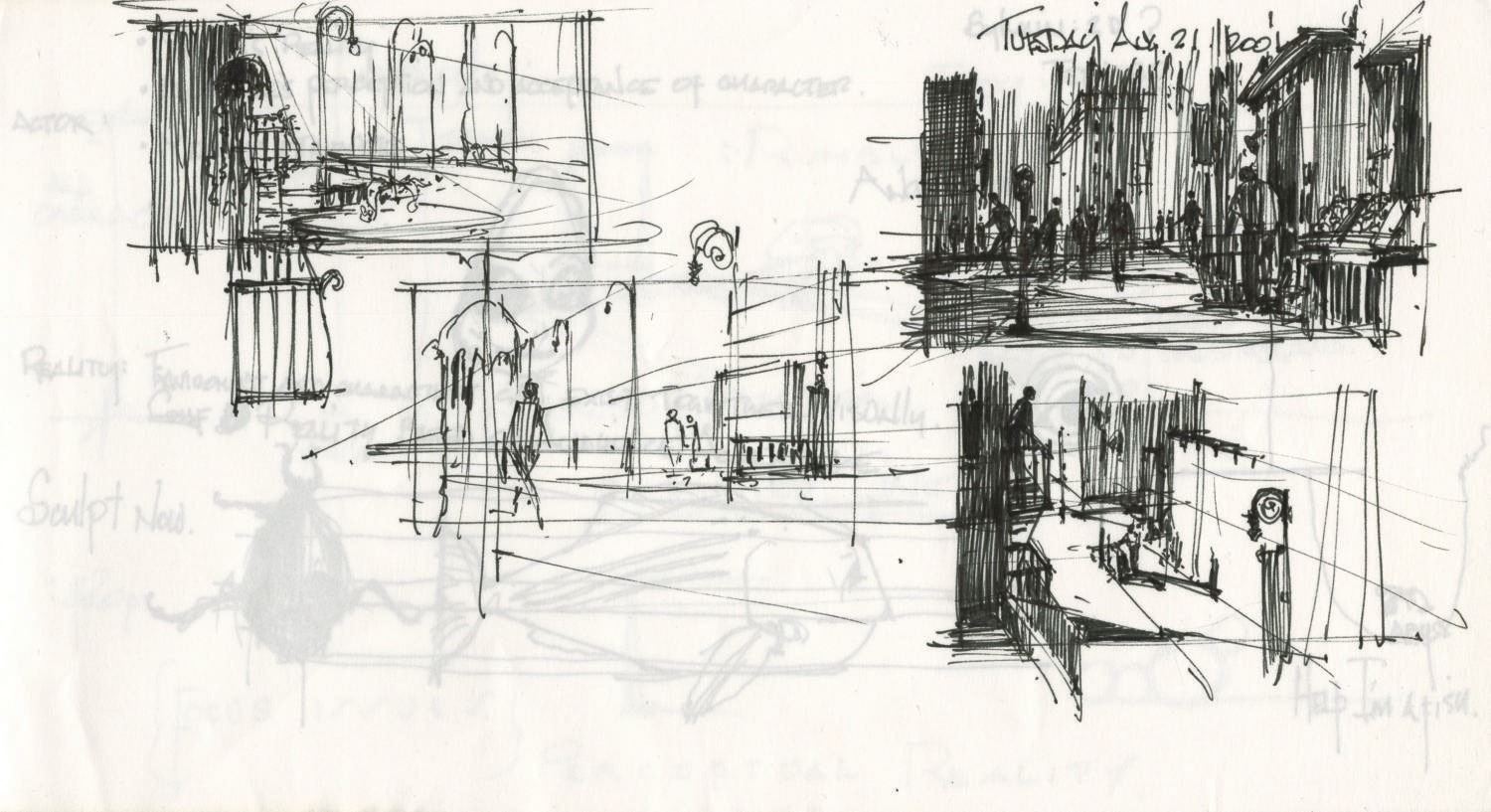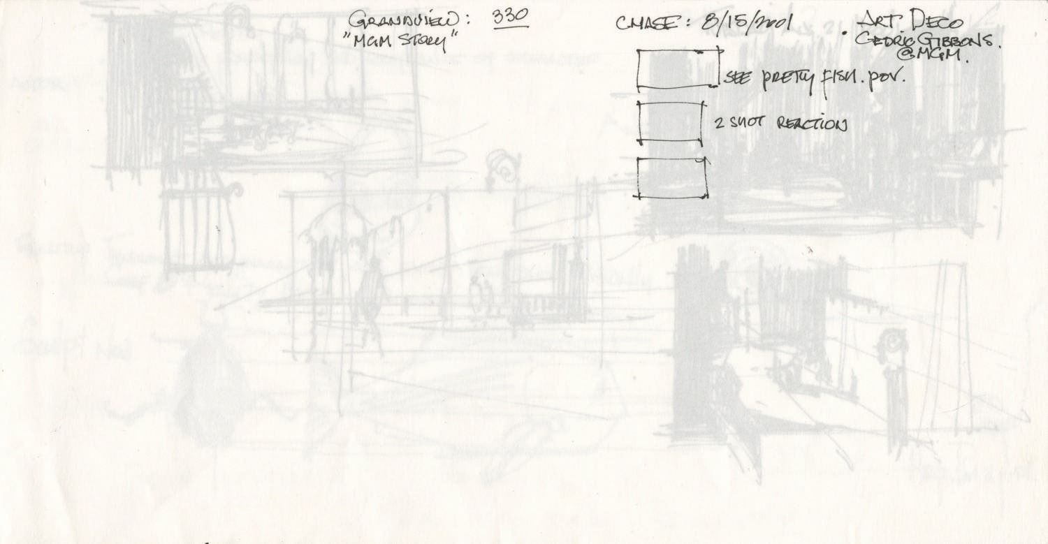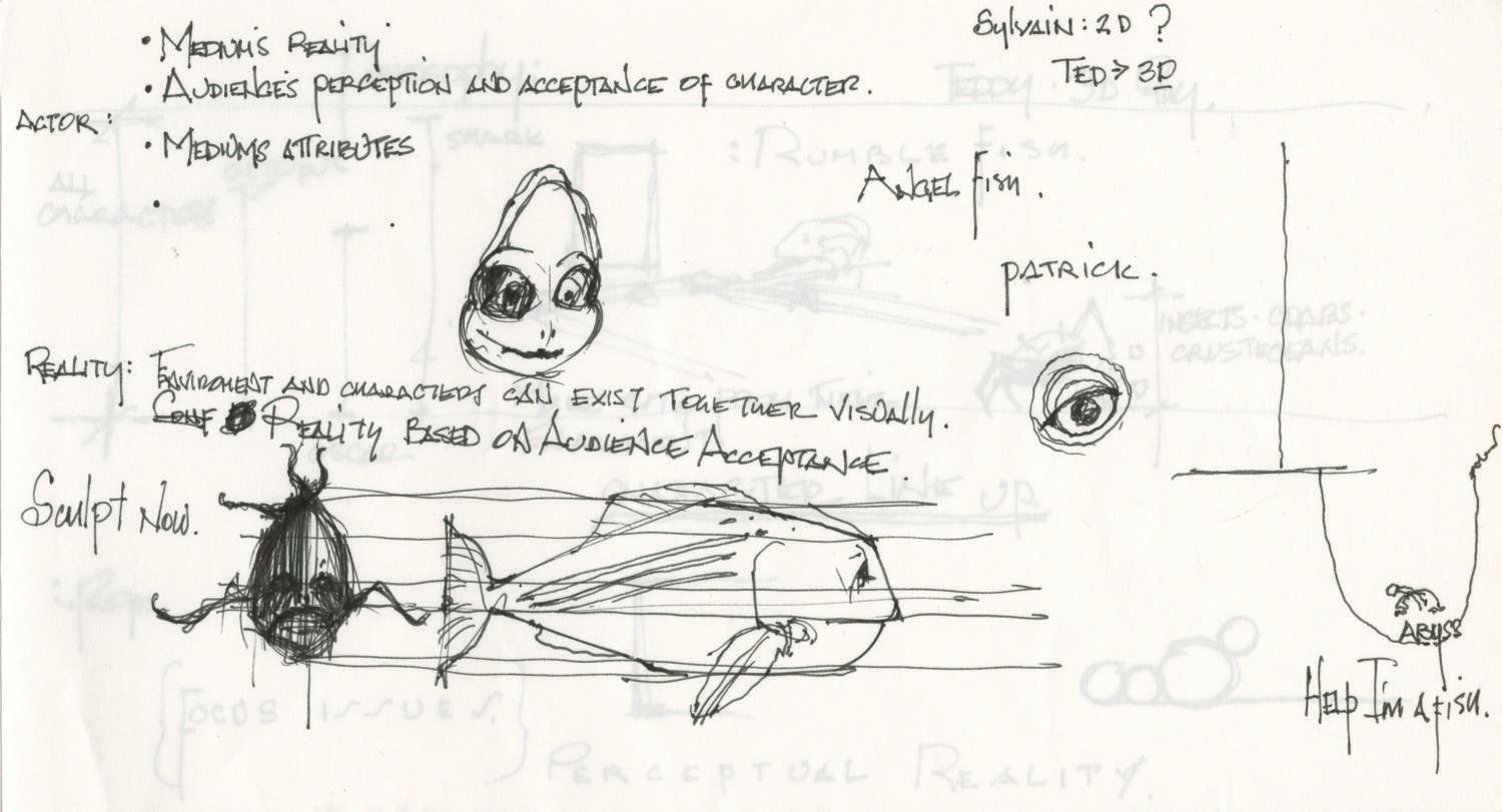 (DreamWorks, 2001) A collection of (5) pages of pre-production concept artwork, notes, and diagrams for the animated underwater gangster comedy, Shark Tale. Consisting of 5-pages attached at the left edge, the artwork includes scenic and storyboard drawings, shot lists, character models, scale diagrams for ocean inhabitants, and assorted philosophical notes on making the characters and setting believable for the audience. Dated between August 15 and August 21, 2001, these pages are among the earliest conceptual documents created for the film, which officially began production in April of 2002. Each page measures 5.5”x10” and the collection is in fine condition with only minimal handling.