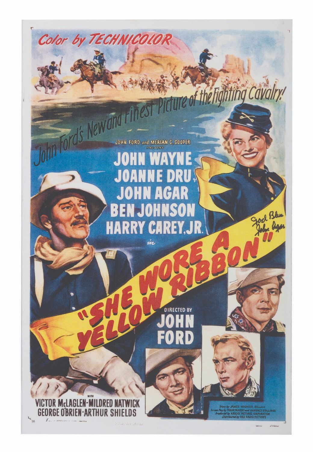 (John Agar, 1980s-1990s) A reproduction of the She Wore a Yellow Ribbon movie poster, signed by actor John Agar. Measuring 11"x17", the poster with autograph is in fine condition.