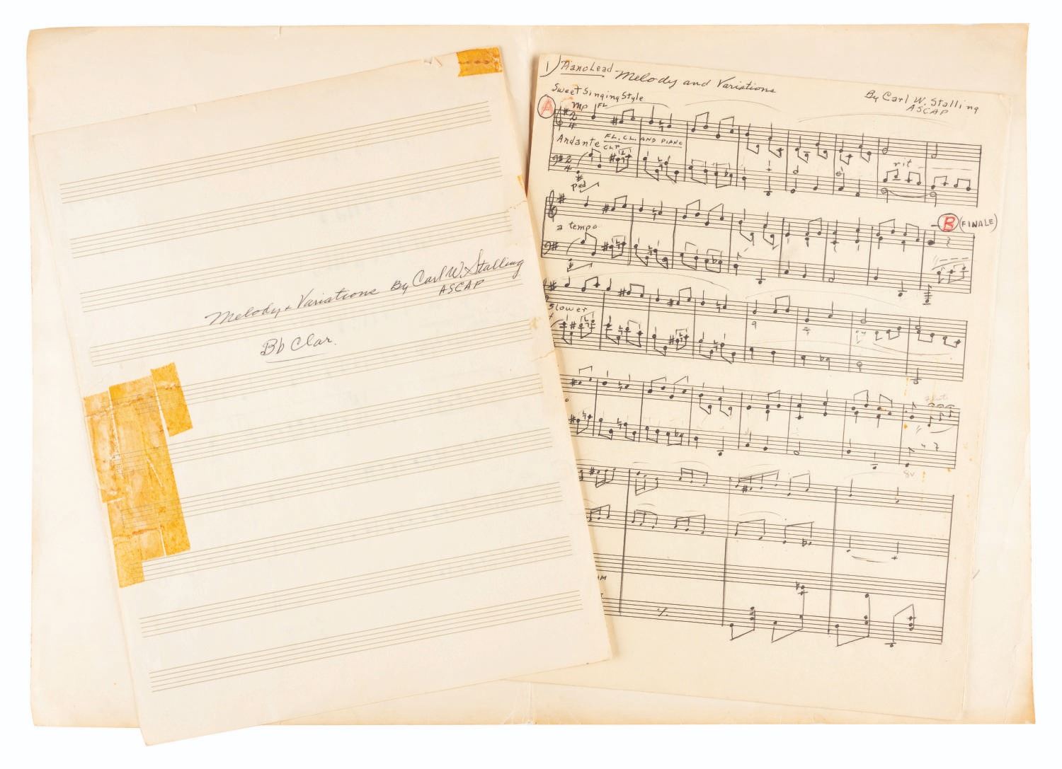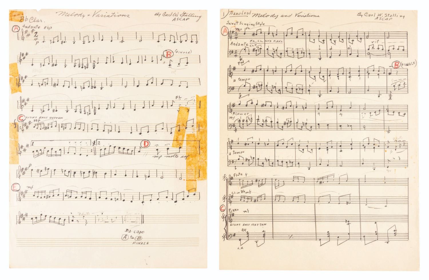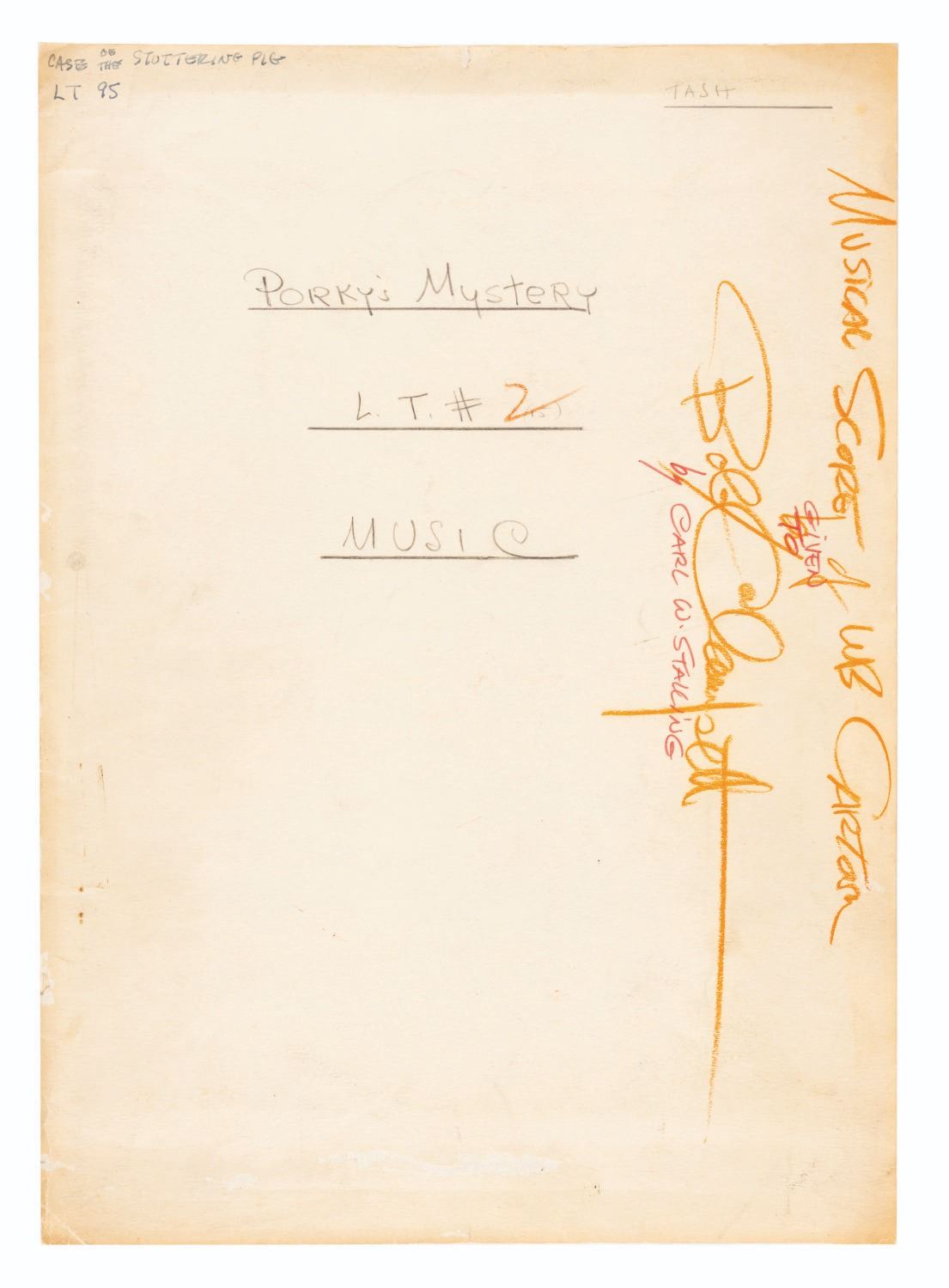 (Schlesinger, 1937) Three pages of handwritten sheet music by Carl Stalling for the Looney Tunes short “The Case of the Stuttering Pig,” directed by Frank Tashlin. Handwritten with notations by Stalling in graphite, ink, and colored pencil on staff paper, the 12” x 9” sheet music is in fair condition with light creasing and edge wear from production use, light stains and discoloration from age, and yellowing tape along the edges of one sheet. The sheet music comes in the original production-used 14” x 10” folder inscribed and signed by Bob Clampett. The piece is in good condition with wear and tear and light discoloration from age.