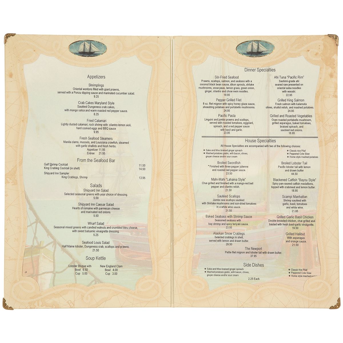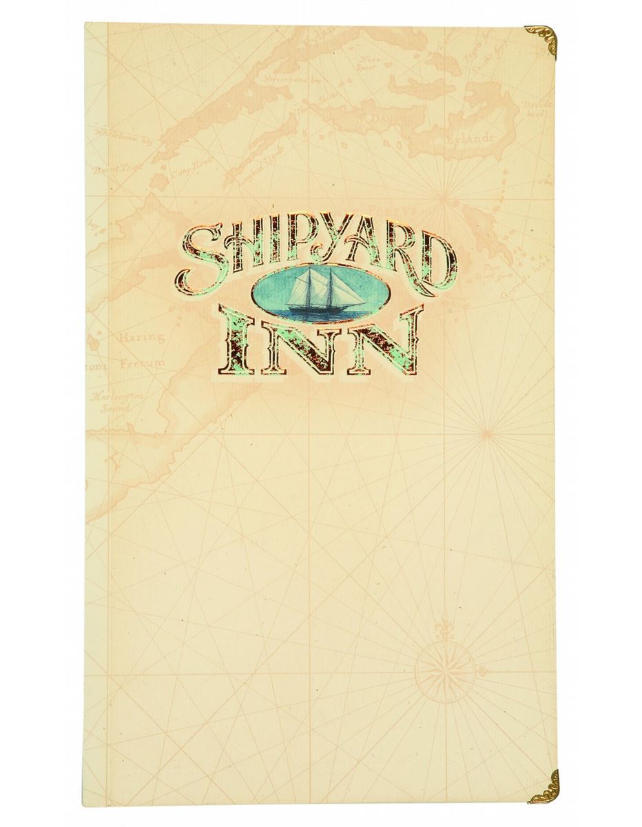 (Disneyland, 1990s) A nautical themed dining menu from The Shipyard Inn at the Disneyland Hotel. Features the restaurant logo in the center of the stylish map-themed menu. Measures 14.25"x8.75" closed and 14.25"x17.5" opened. In good condition with minimal wear from use.