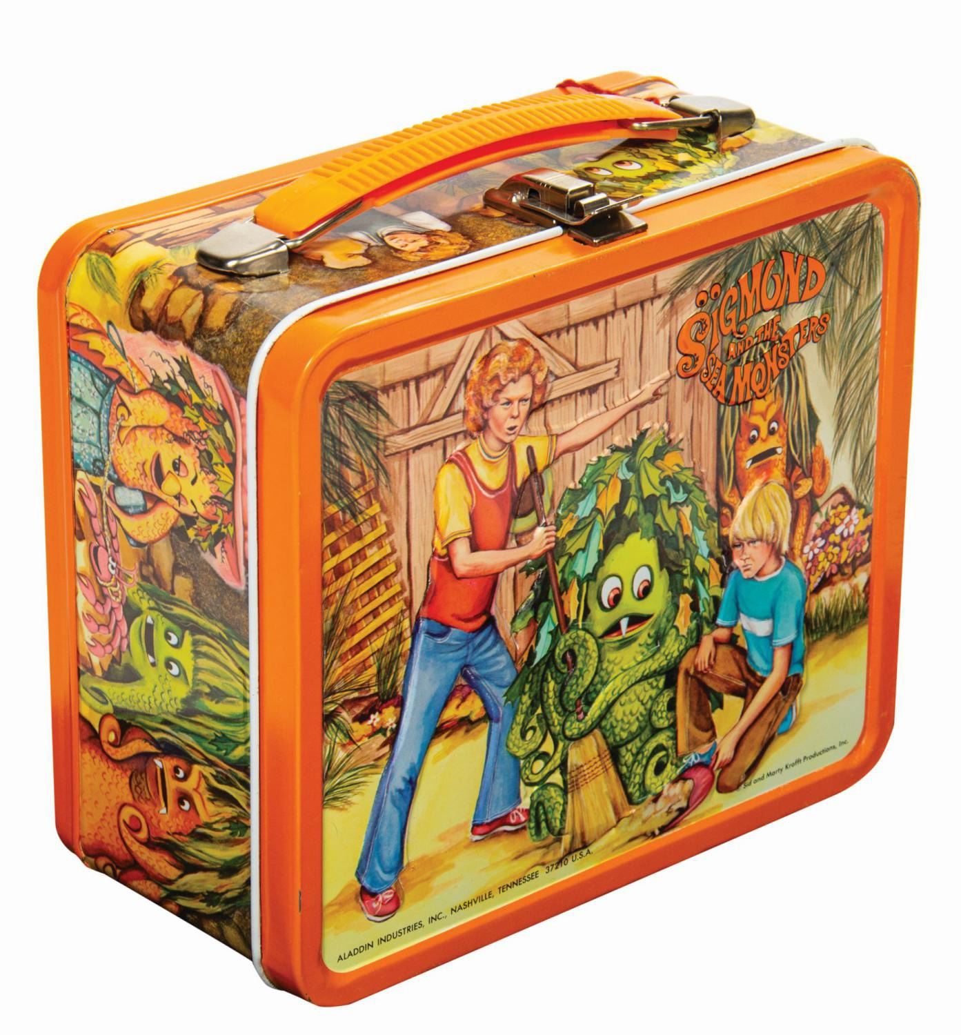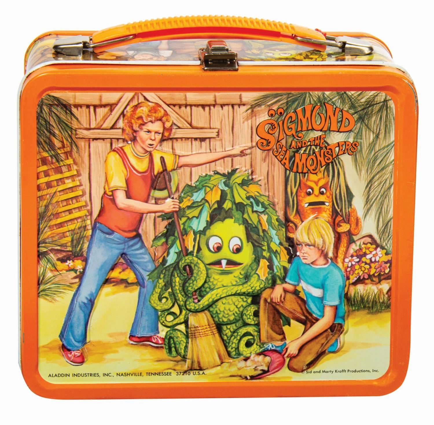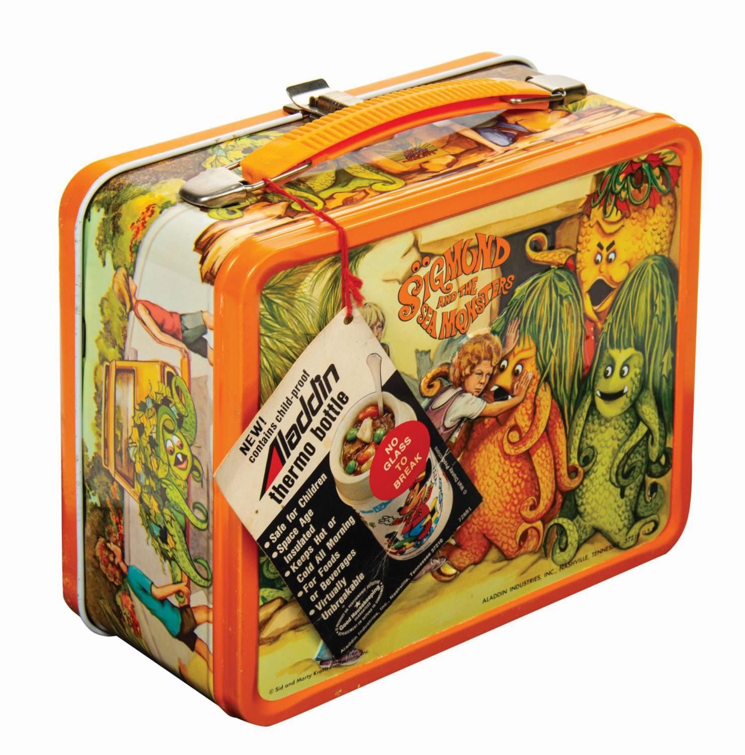 (Aladdin, 1974) A vintage Sigmund and the Sea Monsters tin lithographic embossed lunch box and plastic thermos manufactured by Aladdin. It retains the original manufacturer's advertising hang tag. The lunch box measures 7"x8" and 3.75" deep and the thermos is 6.5" tall and 3.5" in diameter. Both are in very good condition. The lunch box exhibits minor wear and scattered nicks. There is some rubbing to the graphics on the thermos. The piece displays beautifully.