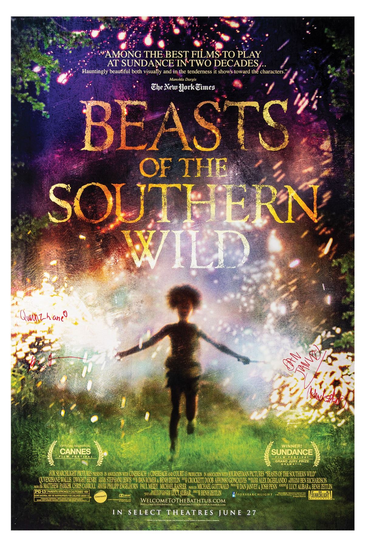 (Cinereach, 2012) An original one sheet poster for Beasts of the Southern Wild that is signed by actor Quvenzhane Wallis, producer Michael Gottwald, producer Dan Janvey, and one unknown member of the production cast or crew. The poster was used and signed at a Broadcast Film Critics Association event, and measures 40"x27". The poster is backed with foamcore and is in very good condition with surface scuffs and edge-wear, particularly at the lower corners.