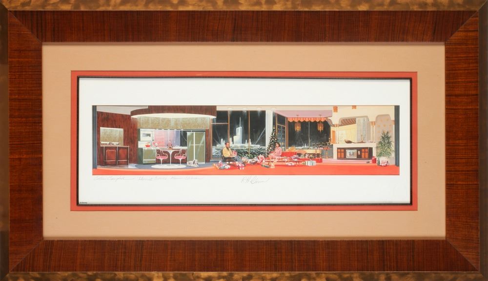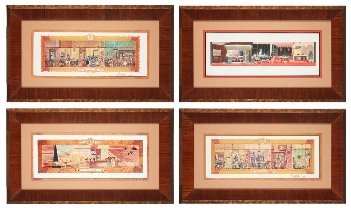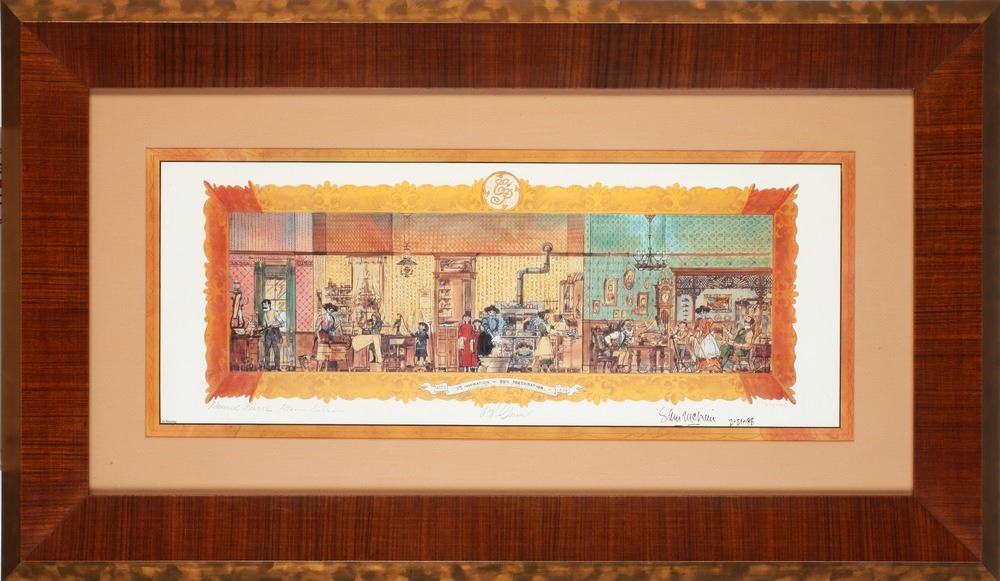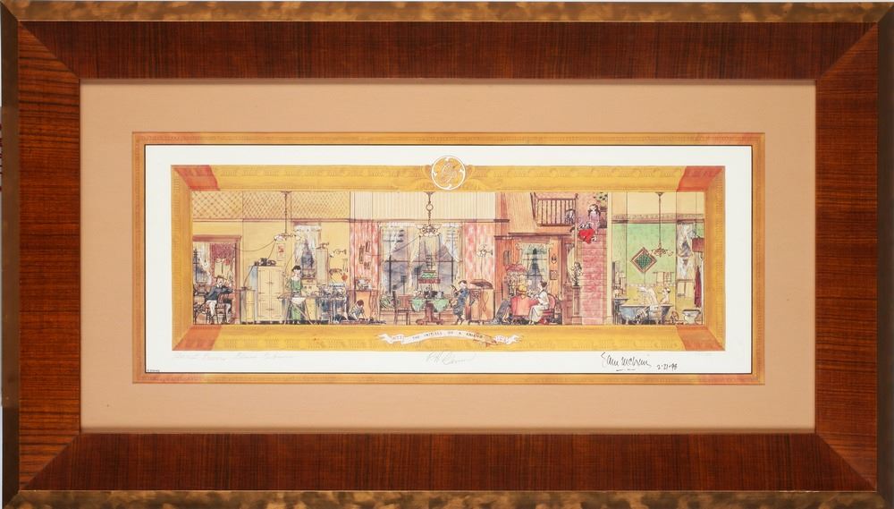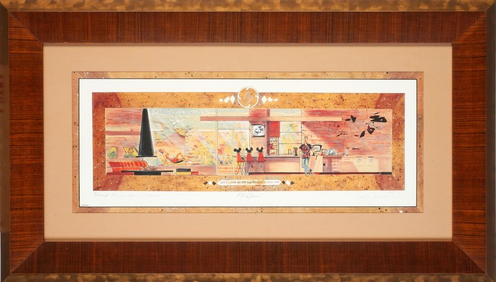 (Disneyland, 1998) A special release by the "Disney Gallery" in 1998 of concept artwork for the "Carousel of Progress". The portfolio consists of (4) large prints featuring different stages of the show and sheet music for the "Great Big Beautiful Tomorrow" theme song. Signed by Collin Campbell, Sam McKim, and John Hench on their respective artworks with the sheet music signed by Richard Sherman. Limited to only 150 sets. The prints measure 9.75"x25.5" each with the sheet music measuring 14"x11". In fine condition, beautifully framed.