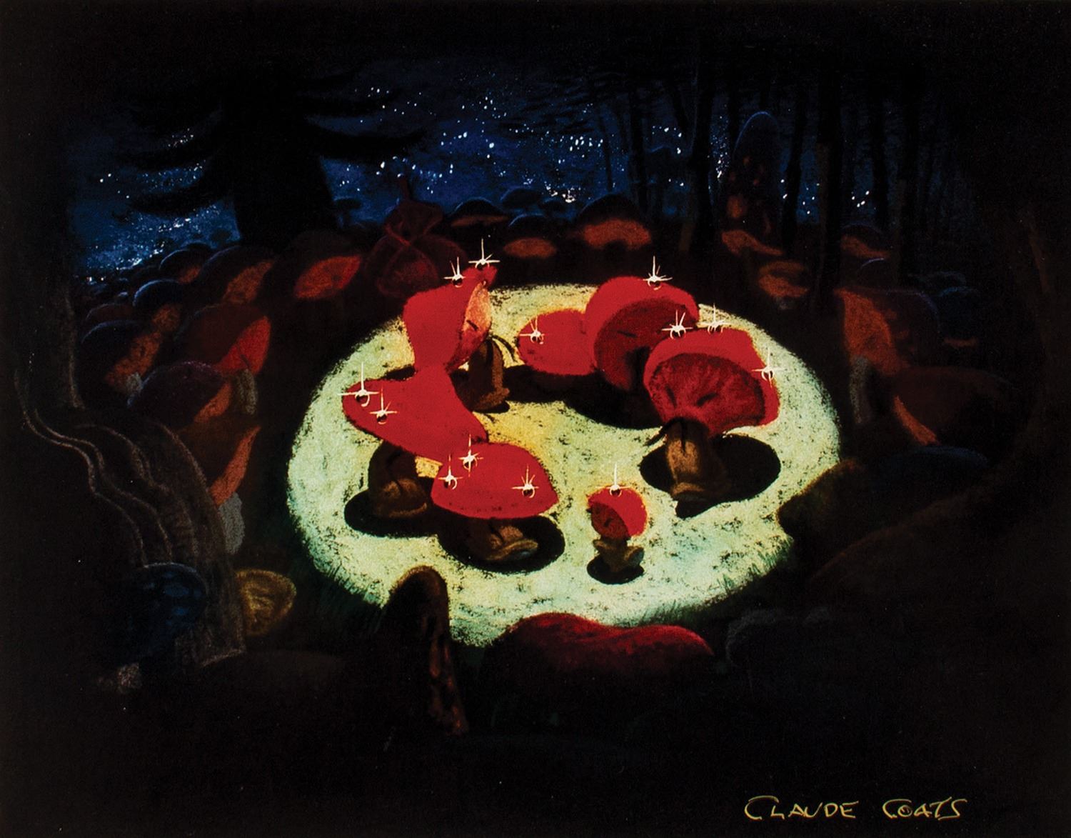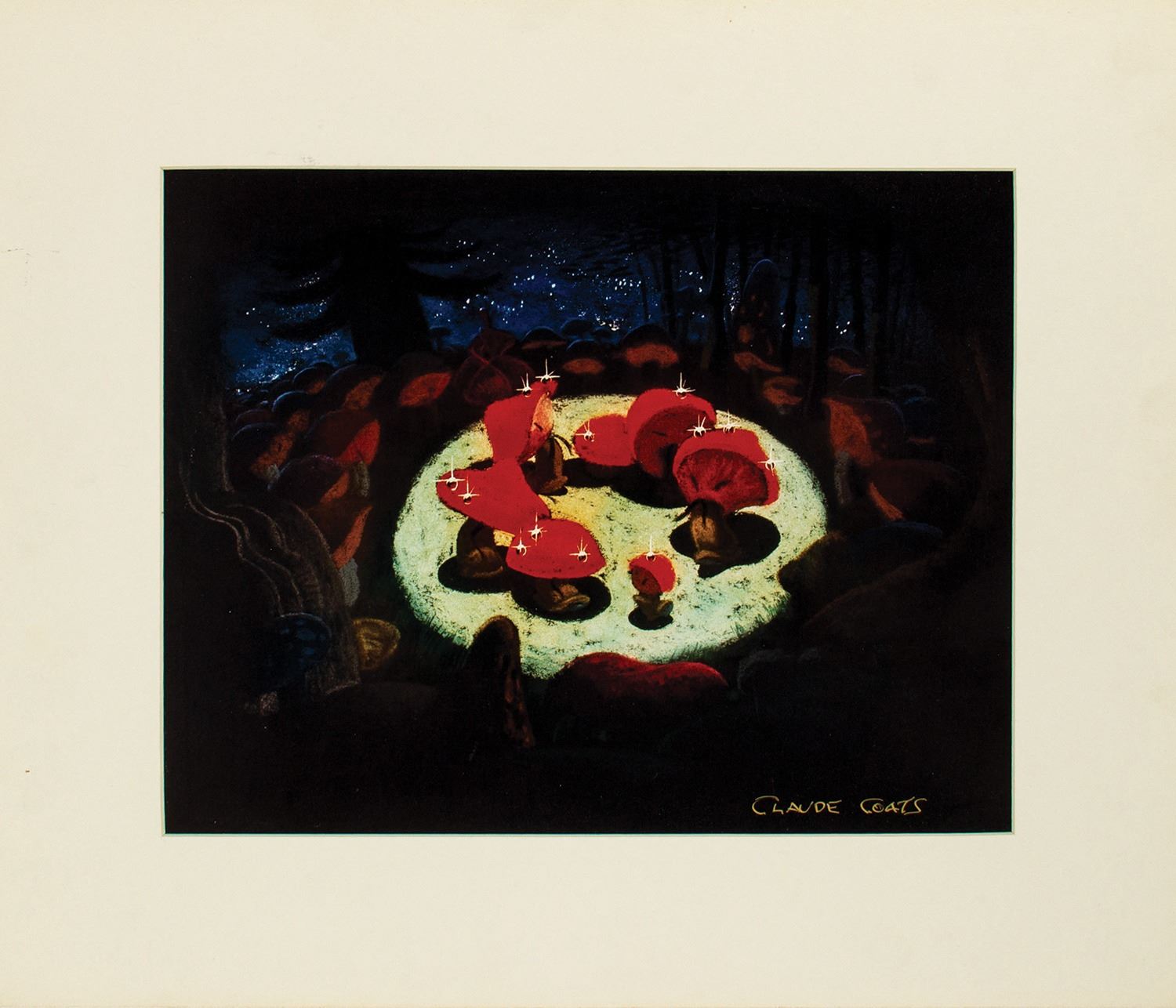 (Disney, 1990) A limited edition concept art print signed by Disney Legend Claude Coats. The print was released for the 50th anniversary of the animated film Fantasia, and depicts Coats' concept for the Dance of the Mushrooms. Offered through the Disney Gallery, the print is signed by Coats in the lower-right in gold ink. Measuring 10.5"x13.5" in a 16"x19" mat, the print is in very good condition with a small scuff near the lower center, and some spots of discoloration on the mat.