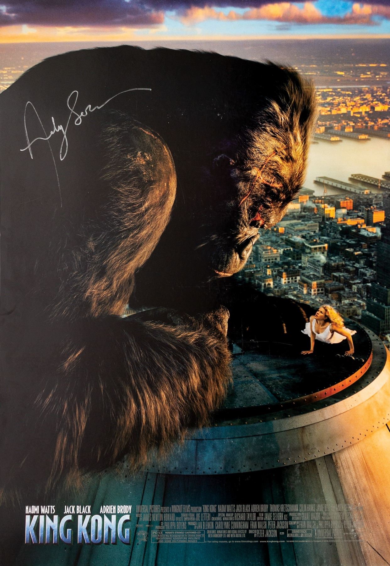 (Wingnut, 2005) An original one sheet poster for King Kong that is signed by Andy Serkis, the motion capture actor for Kong. The poster was used and signed at a Broadcast Film Critics Association event, and measures 39.75"x26.75". The poster is backed with foamcore and is in good condition with a few creasing and minor wear around the edges, particularly in the bottom corners.