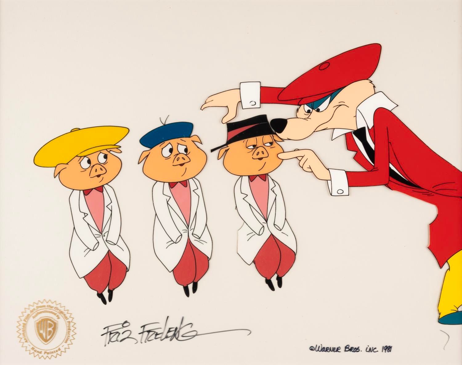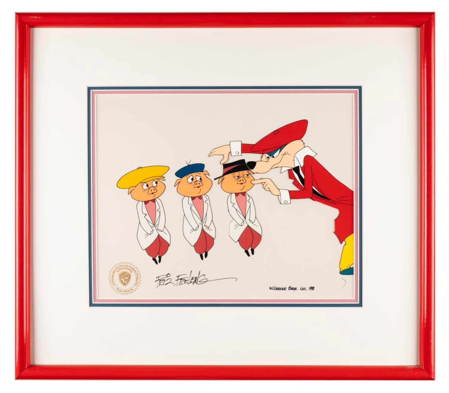 (Warner Bros., 1981) Signed original production cels from "The Looney Looney Looney Bugs Bunny Movie." Featured on the cels are the Wolf and Pigs from the 1957 short film "Three Little Bops." Friz Freleng directed both the movie and the original short and has signed the art in black marker. With a character image size of 7.25" x 11" in a 9.5" x 12" visible window of a 17" x 19" framed matte, the art is in very good condition with scratches and light wear.