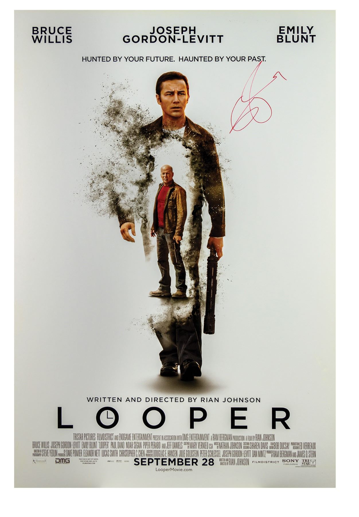 (TriStar, 2012) An original one sheet poster for Looper that is signed by Emily Blunt, who stars as Sara in this sci fi classic. The poster was used and signed at a Broadcast Film Critics Association event, and measures 40"x27". The poster is backed with foamcore and is in very good condition with some edge-wear at the corners and scuffing to surface along the edges.