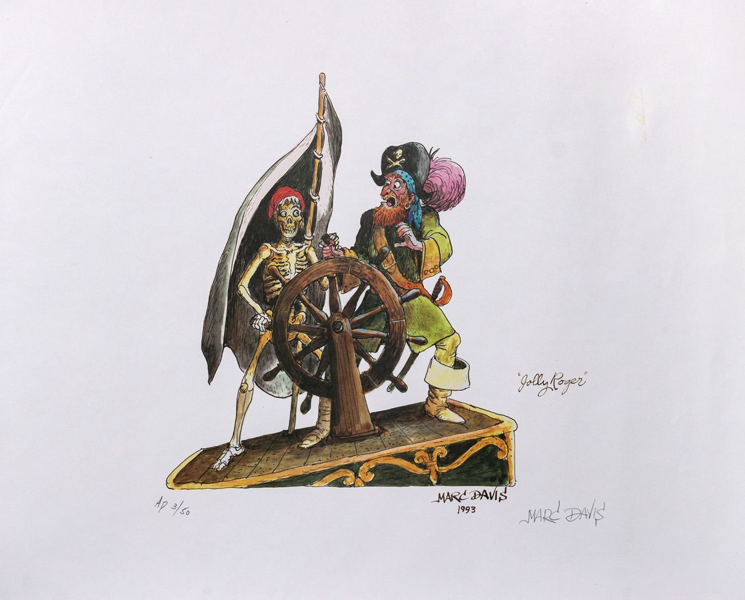(Disneyland, 1993) A limited edition print by Disney Legend Marc Davis titled "Jolly Roger." The artwork was created in an edition of 5,000 and was only available to members of the Marc Davis Collector's Society. This particular print is an Artist's Proof of the edition that is hand-numbered AP 3/50. Measuring 17"x22", the print is in very good condition with minor wear.