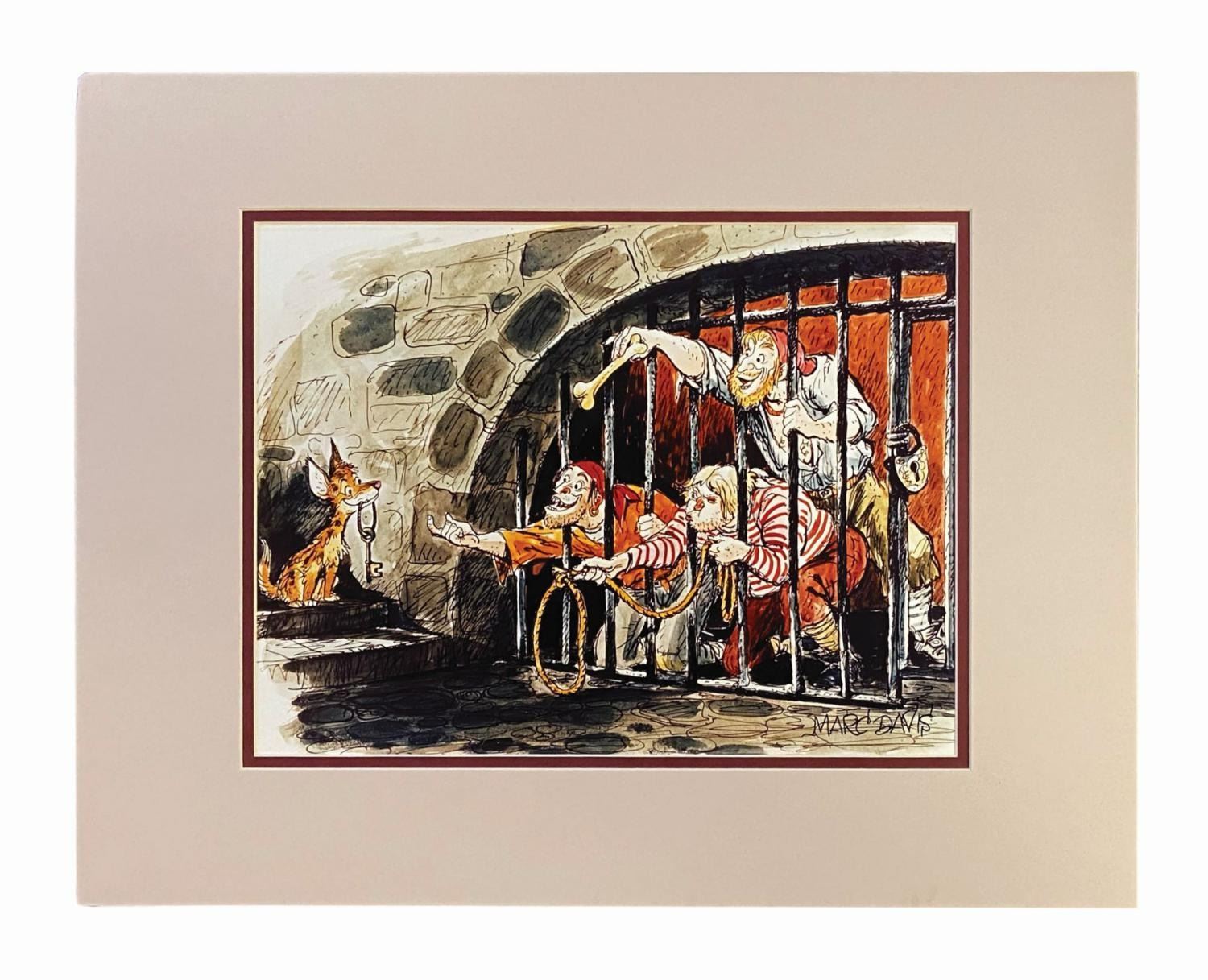 (Disneyland, c.1990s) A high quality concept art print featuring Imagineer Marc Davis' design for the Pirates of the Caribbean attraction. Depicting the humorous jail scene with the jail dog and key just out of reach, the print is signed by Davis in ink in the bottom-right corner. It measures 11"x14" and is in very fine condition. The concept art print is hinged within a 16"x20" mat frame for display, which has minor edge and corner wear.