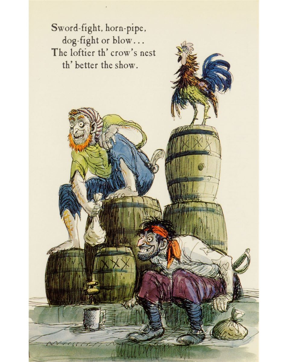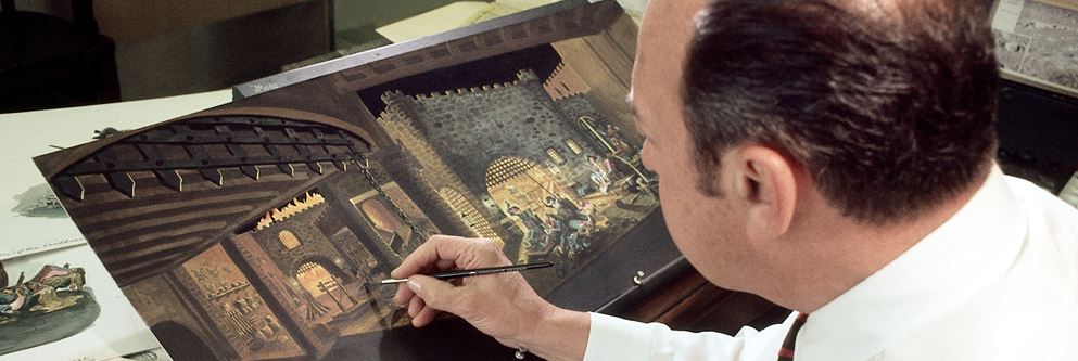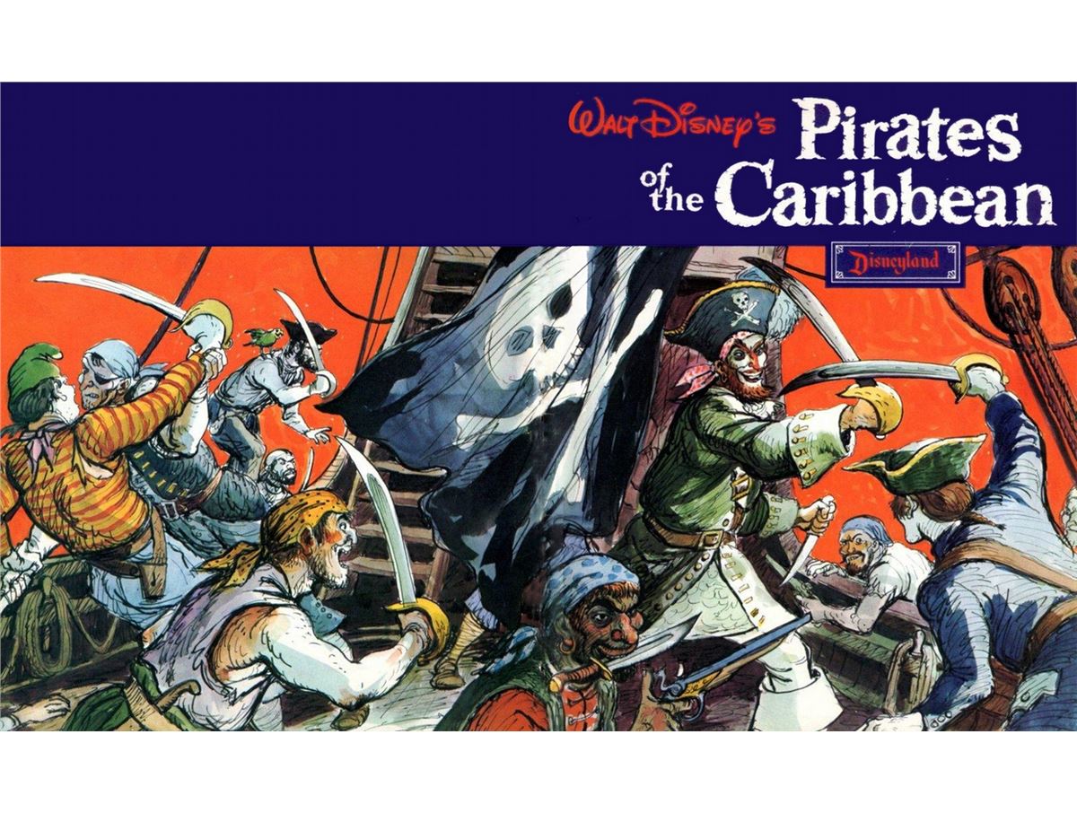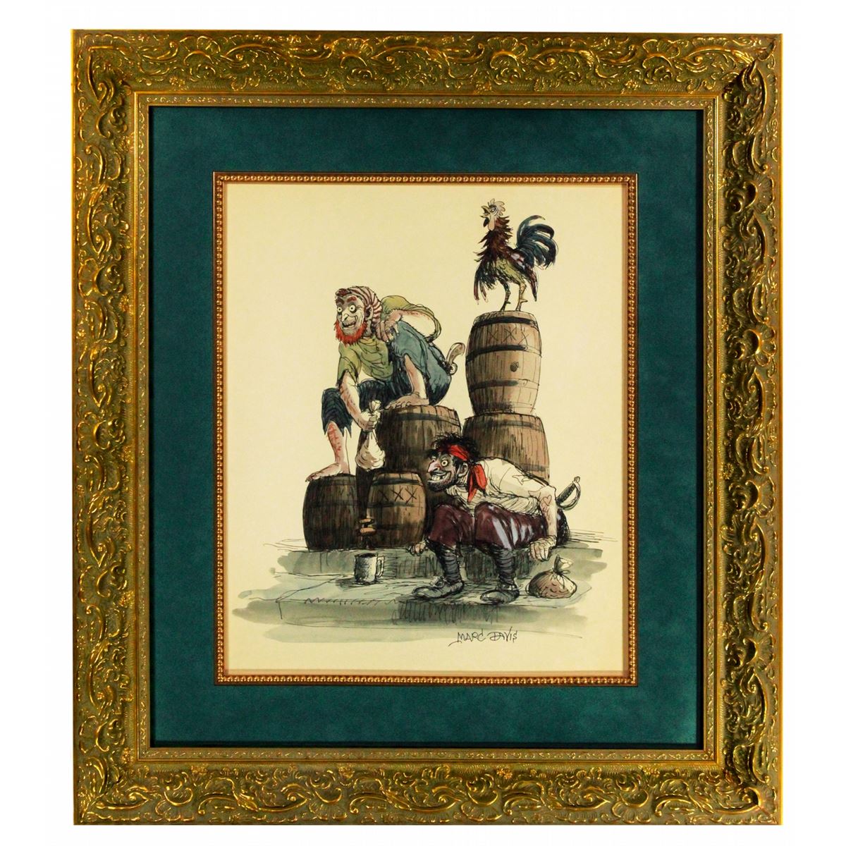 (Disneyland, 1965) An extremely rare original concept painting by legendary animator/Imagineer Marc Davis. This painting was done during the exploratory phase of the attraction. Davis was the lead story man and this painting was part of his work on the tableau scenes. More specifically, the “Bride Auction” scene. These two characters were situated across the channel and were part of the “prospective bidders” of the brides being offered by the auctioneer. Especially noteworthy is that Disney hand-picked this particular image to be used as promotional art for the attraction. It is featured in the preview and post-opening guidebooks for both Disneyland and Disney World. The artwork is also featured in the famous set of (12) postcards issued for sale in the newly-opened Pirate Arcade in 1966. This is one of a handful of Davis concepts that exist outside the Imaginering archives. Accomplished ink and watercolor. In fine condition.