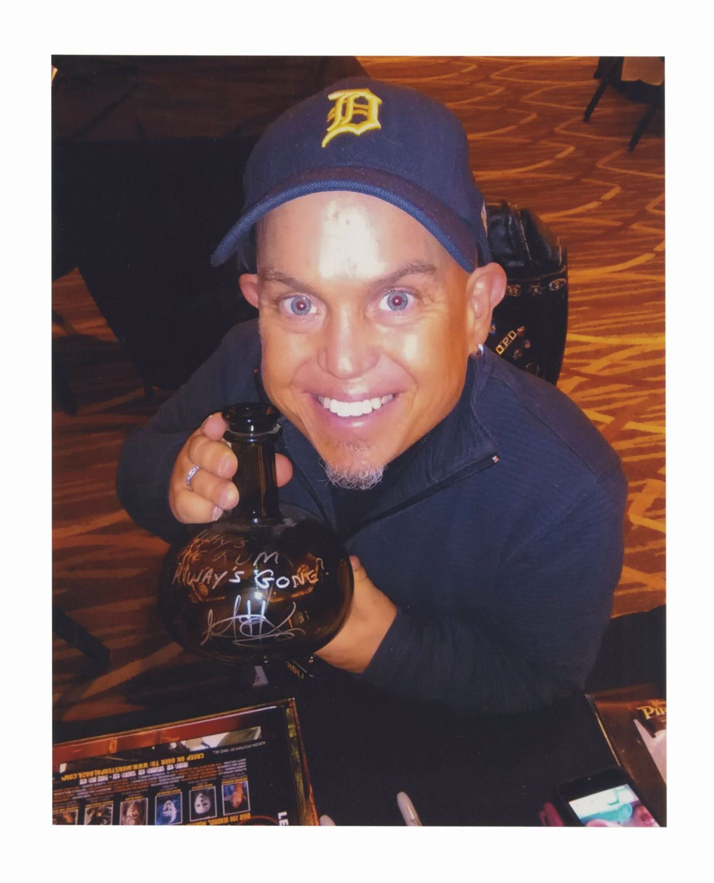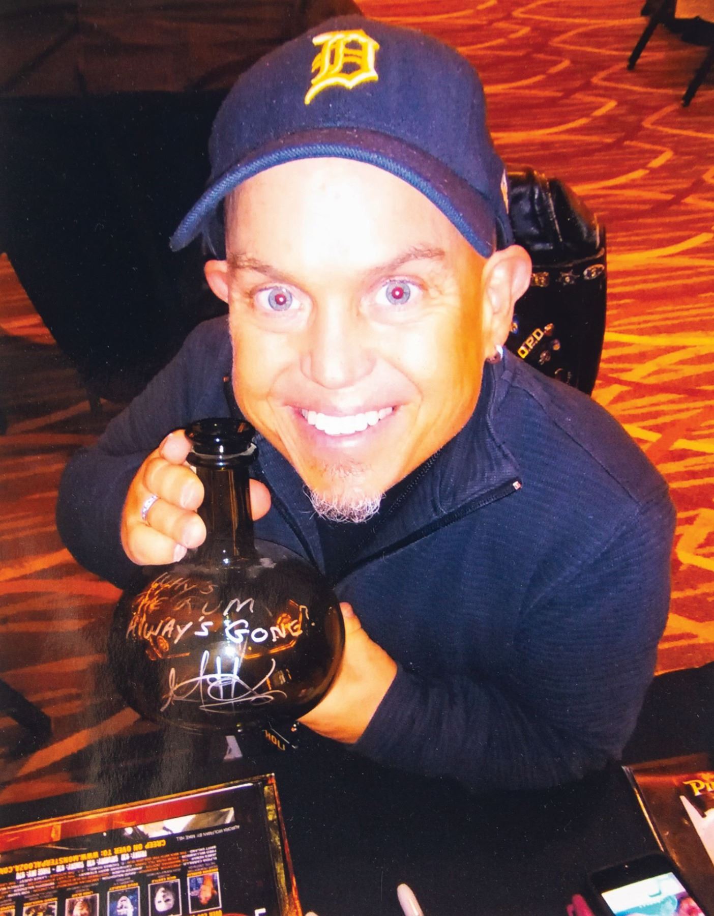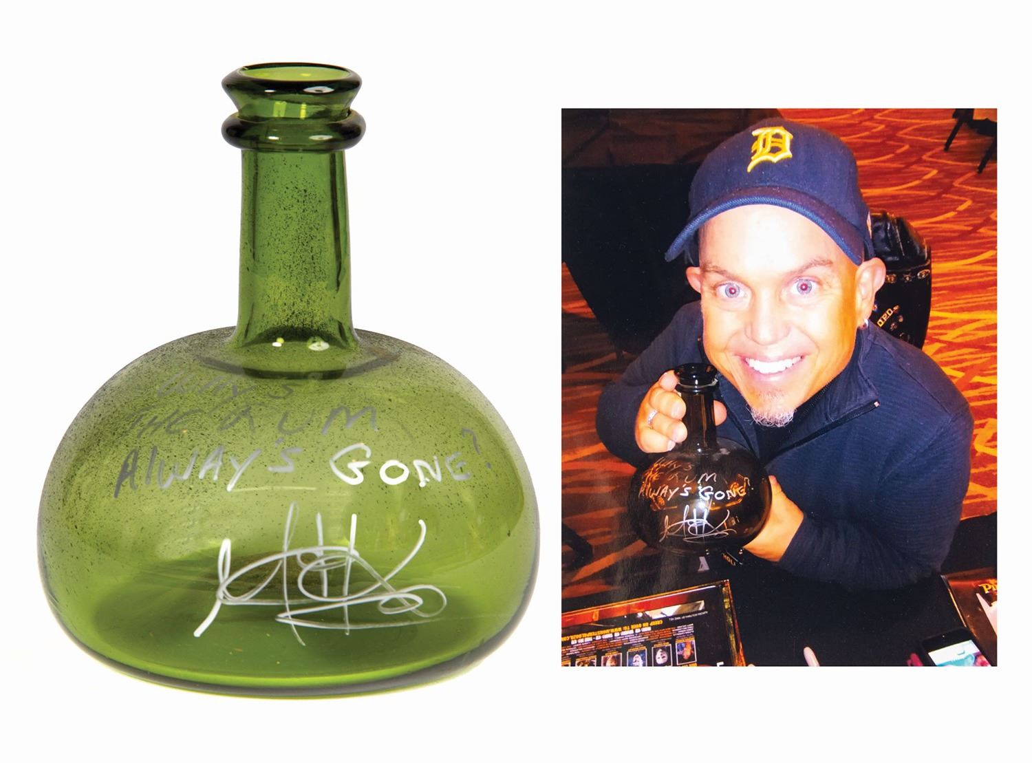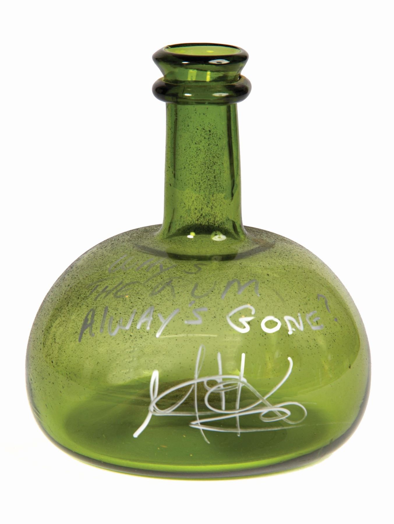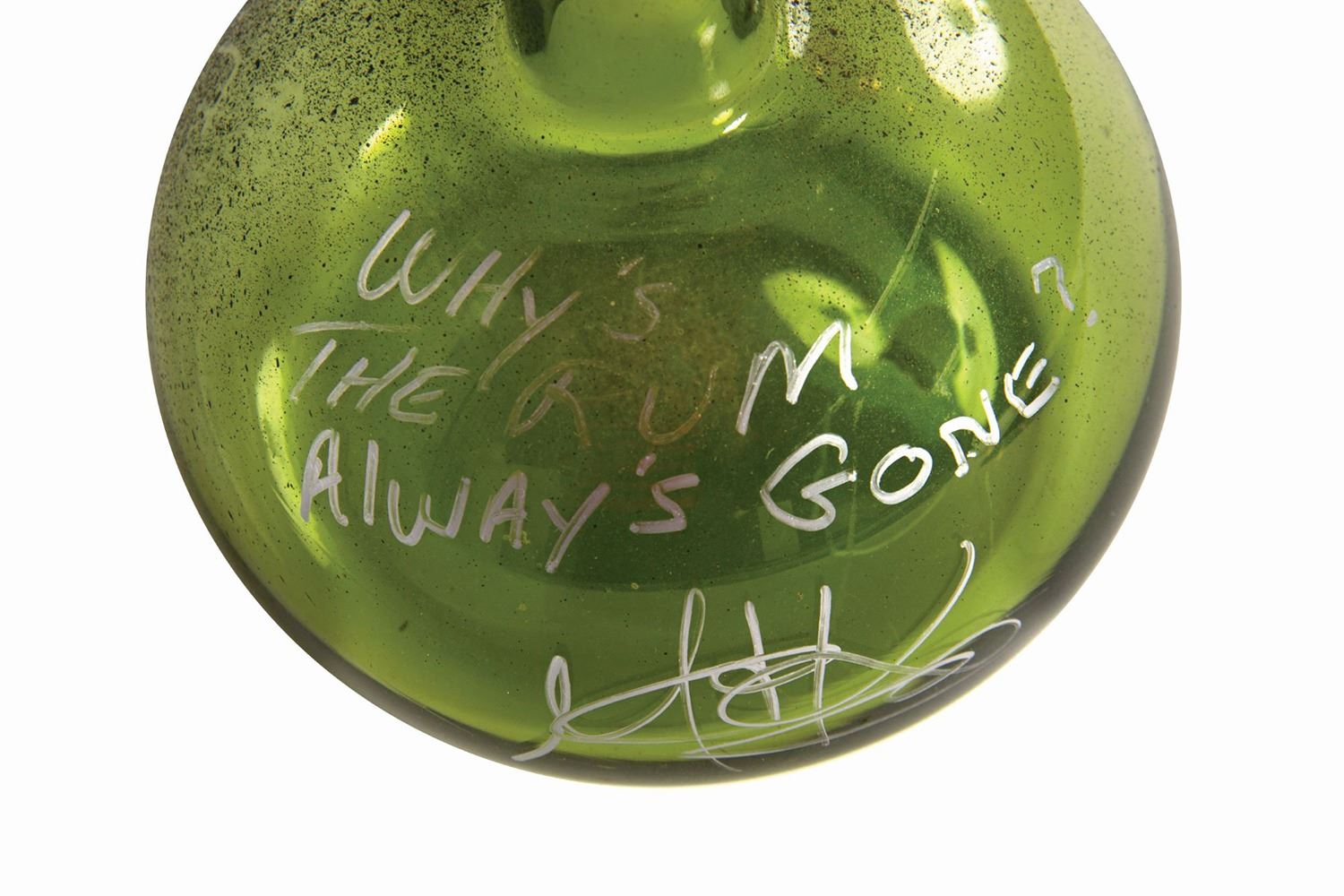(Disney, 2006) A prop rum bottle used in the creation of Pirates of the Caribbean: Dead Man's Chest. The glass bottle was signed by actor Martin Klebba, who played the pirate Marty, and signed the bottle with the phrase "why is the rum always gone?" A photo of Klebba holding this rum bottle after he signed it is included. Measuring 5.5" in diameter and 6.5" tall, the bottle is in very good condition with some intentional distressing to the surface.