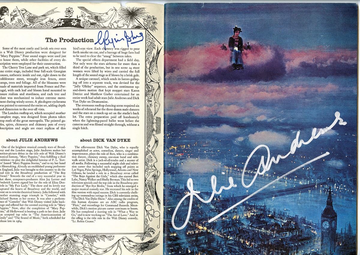 (Golden Press,1964) Signed copy of "Mary Poppins" softcover book. The 9.25"x12.25" book is in good condition with edge wear. It is hand-signed by Julie Andrews and Glynis Johns
