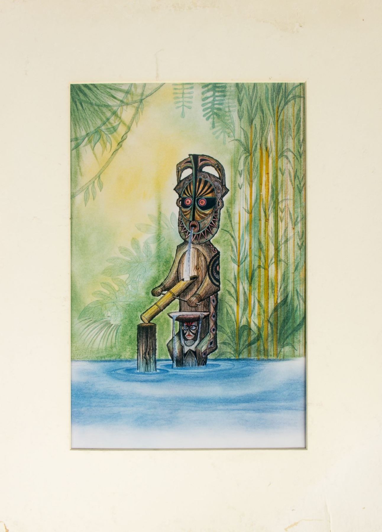 (Disneyland, c.1980s-90s) A color print of Maui from the "Enchanted Tiki Room". This print was created by Rolly Crump for an Imagineering signing event. When Rolly was asked to bring a colored sample of his artwork so that prints could be made for him to sign at the event, Rolly created this colored version of his original Maui design. This print comes from Rolly's personal collection and is signed by Rolly along the mat. The artwork has an image size of 13.5"x8.75" and is in good condition with some worn edges on the mat and some moisture discoloration on the back-side.