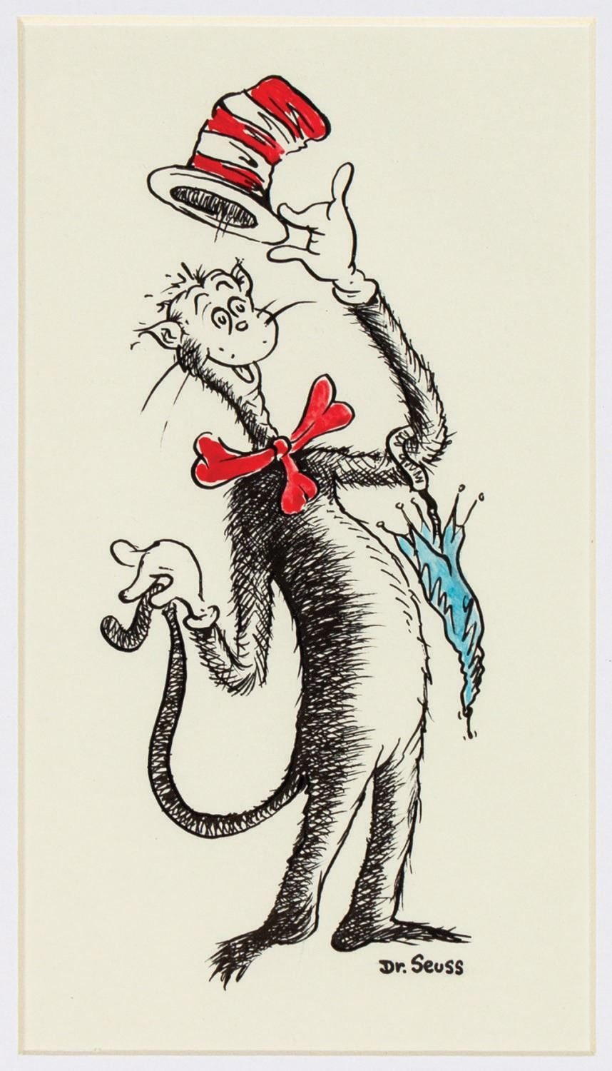 (Dr. Seuss, c.1960s) An original drawing of The Cat in the Hat by Theodor Seuss Geisel, more commonly known by his pen name "Dr. Seuss." This original ink drawing of one of Seuss' most famous characters features hand-colored highlights and is signed "Dr. Seuss" in the lower-right of the image. The drawing has an image size of 9"x5" within its 17"x14" frame. The artwork is in very fine condition. Original artwork by Dr. Seuss is extremely sought after, and this example depicting such a well-known character is exceptionally rare.