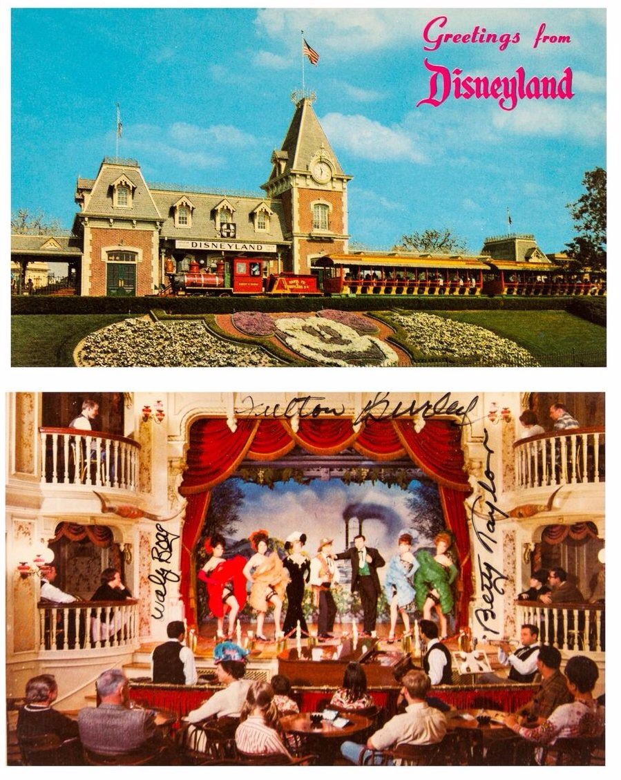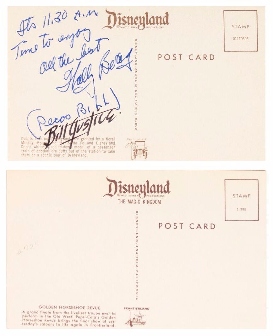 (Disneyland, c.1957-1963) A signed pair of early Disneyland postcards featuring the "Golden Horseshoe Revue" and the Main Street Station. The Golden Horseshoe Revue" postcard is signed by Wally Boag, Betty Taylor, and Fulton Burley who are all well remembered for their many performances in the special show. The second postcard is signed by Boag as well as Bill Justice, and features the message, "It's 11:30 a.m., Time to enjoy all the best - Wally Boag (Pecos Bill)". These postcards measure 3.5"x5.5" and are in very good condition.