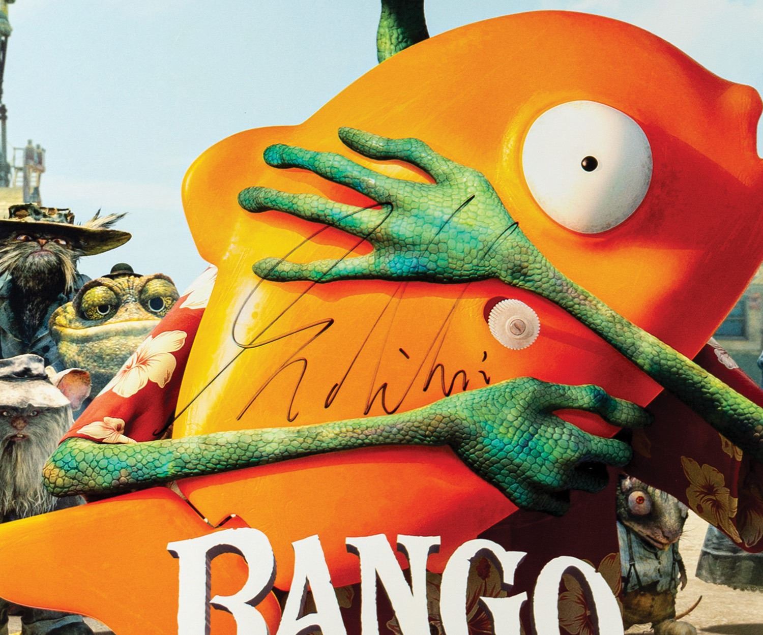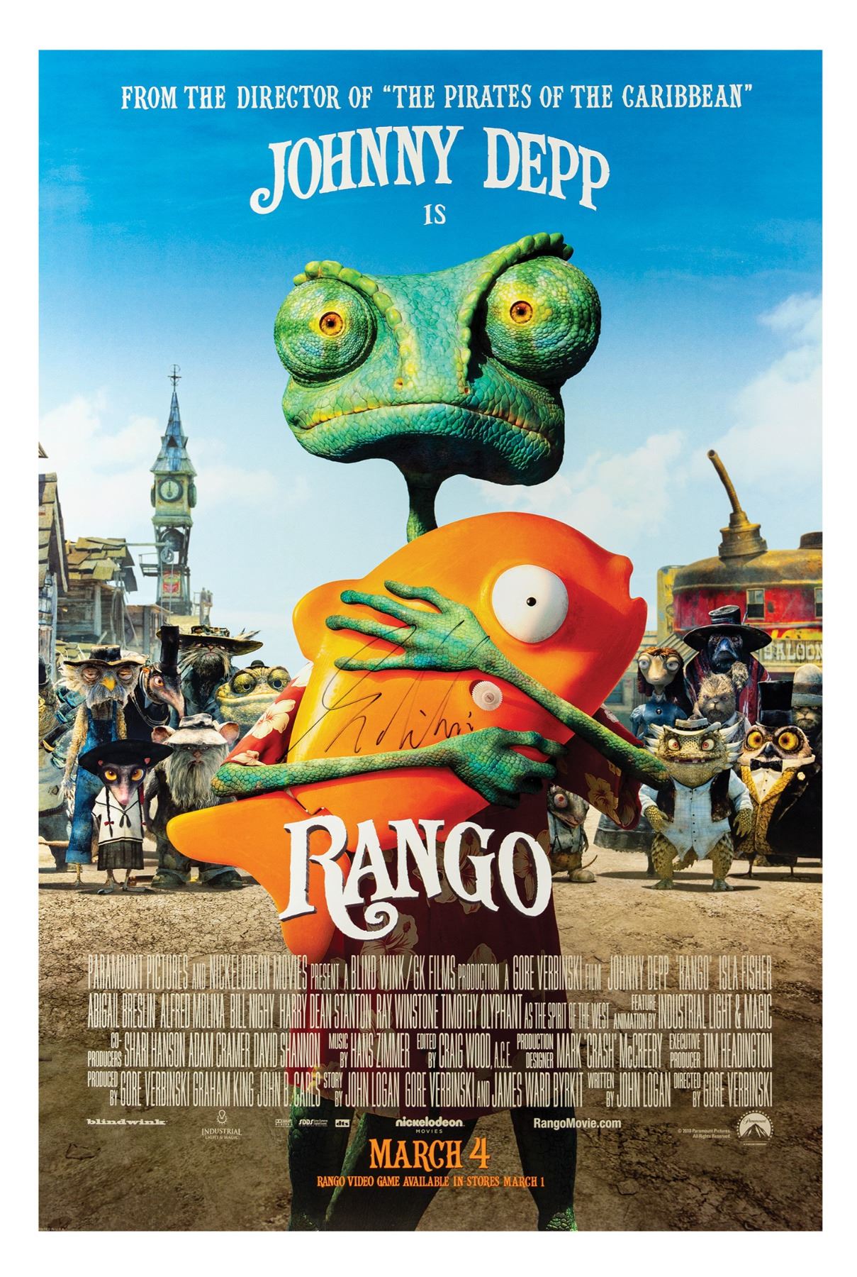 (Paramount, 2011) An original one sheet poster for Rango that is signed by director Gore Verbinski. The poster was used and signed at a Broadcast Film Critics Association event, and measures 40"x27". The poster is backed with foamcore and is in very good condition with some bending to the lower right and left corners, as well as some minor creasing throughout.