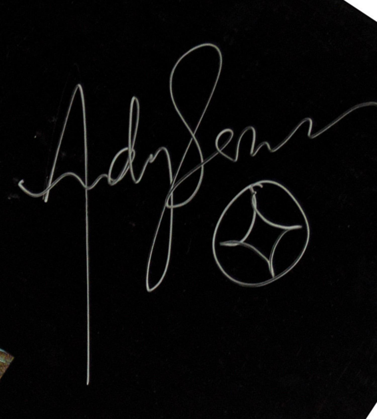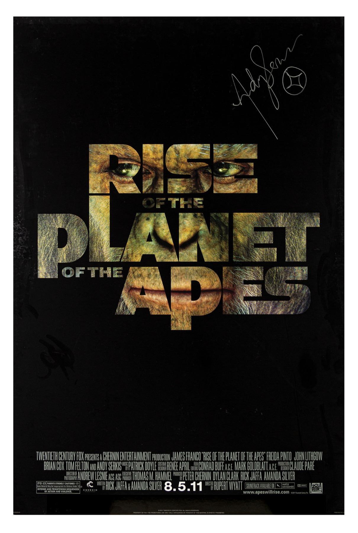 (20th Century Fox, 2011) An original one sheet poster for Rise of the Planet of the Apes that is signed by Andy Serkis, who brought life to Caesar through motion capture. The poster was used and signed at a Broadcast Film Critics Association event, and measures 40"x27". The poster is backed with foamcore and is in good condition with minor surface and edge wear from use, as well as a couple spots of lifting at the lower left corner.
