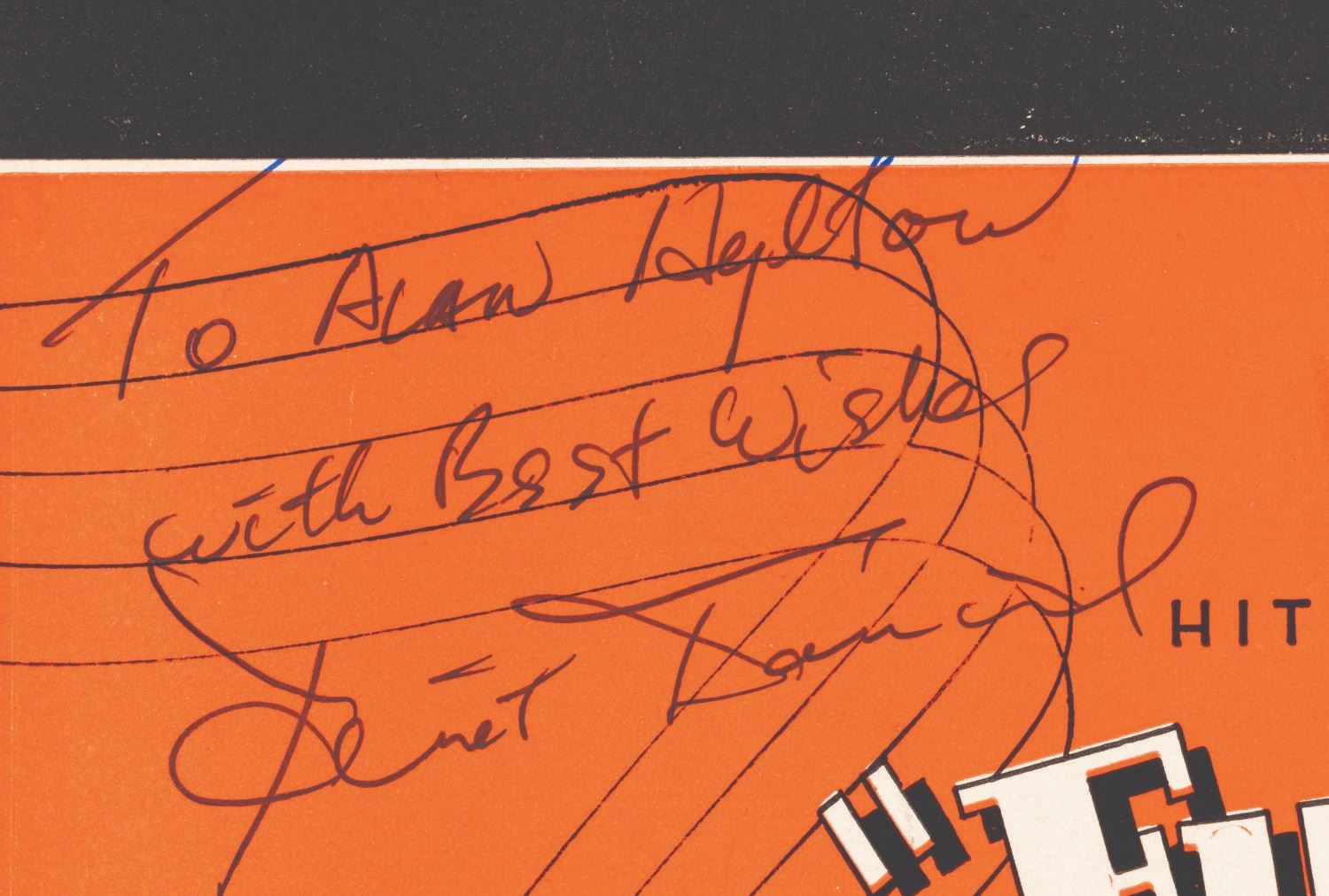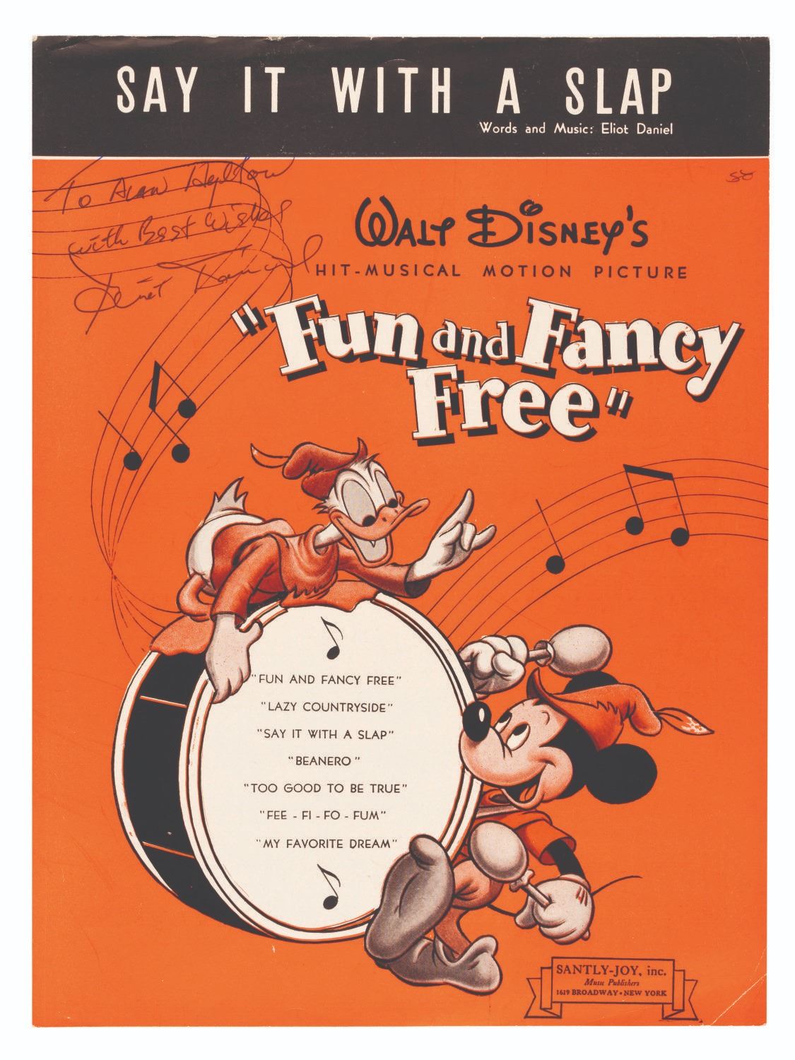 (Santly-Joy, 1947) Sheet music for “Say it with a Slap” from Walt Disney’s “Fun and Fancy Free,” signed on the cover in ink by the composer, Eliot Daniel. Measuring 9” x 12”, the sheet music displays in good condition with heavy scratches, edge wear including a fold at the bottom right corner, creases, and discoloration from age.