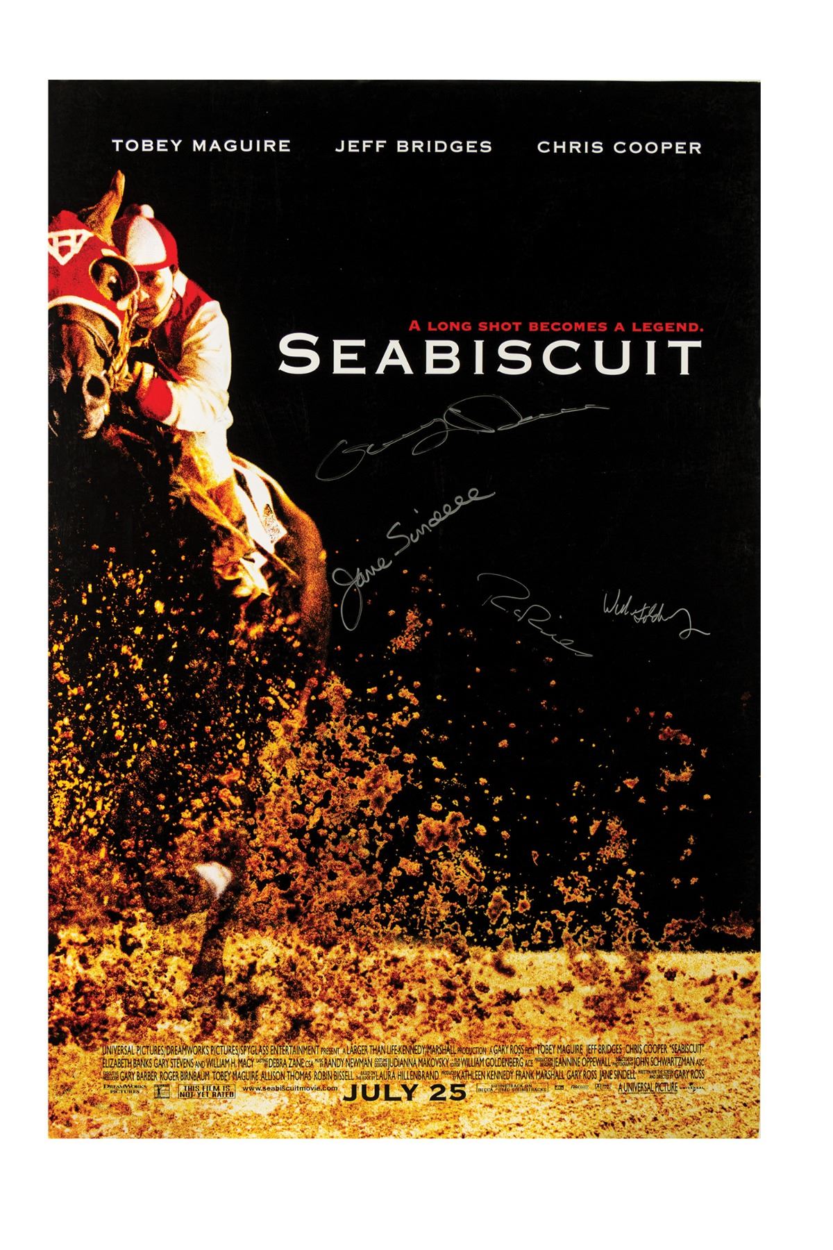 (Touchstone, 2011) An original one sheet poster for Seabiscuit that is signed by director Gary Ross, producer Jane Sindell, and editor William Goldenberg, as well as what appears to be actor Robin Bissell. The poster was used and signed at a Broadcast Film Critics Association event, and measures 39.75"x26.75". The poster is backed with foamcore and is in good condition with some surface and edge wear from use.
