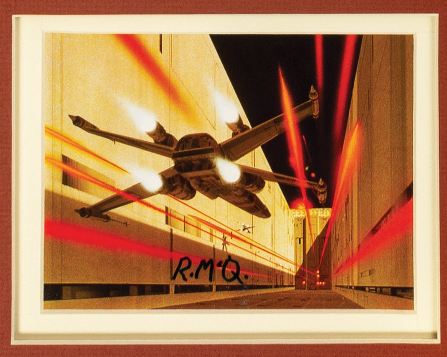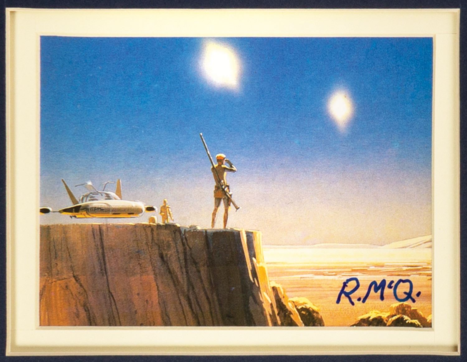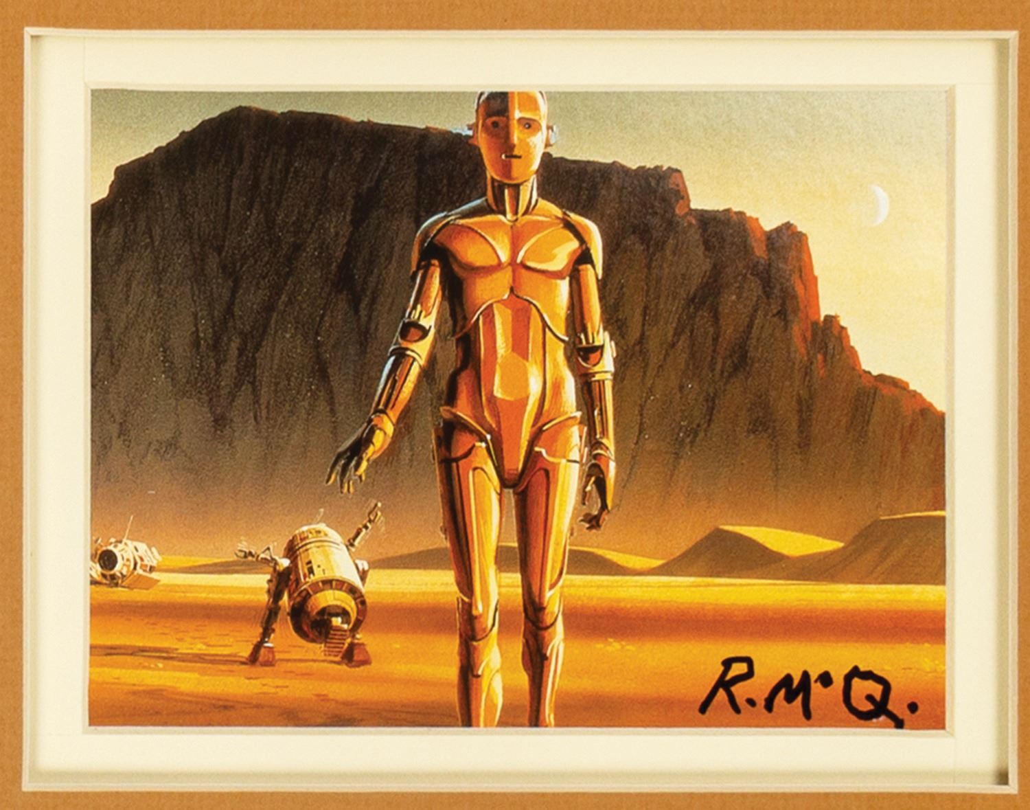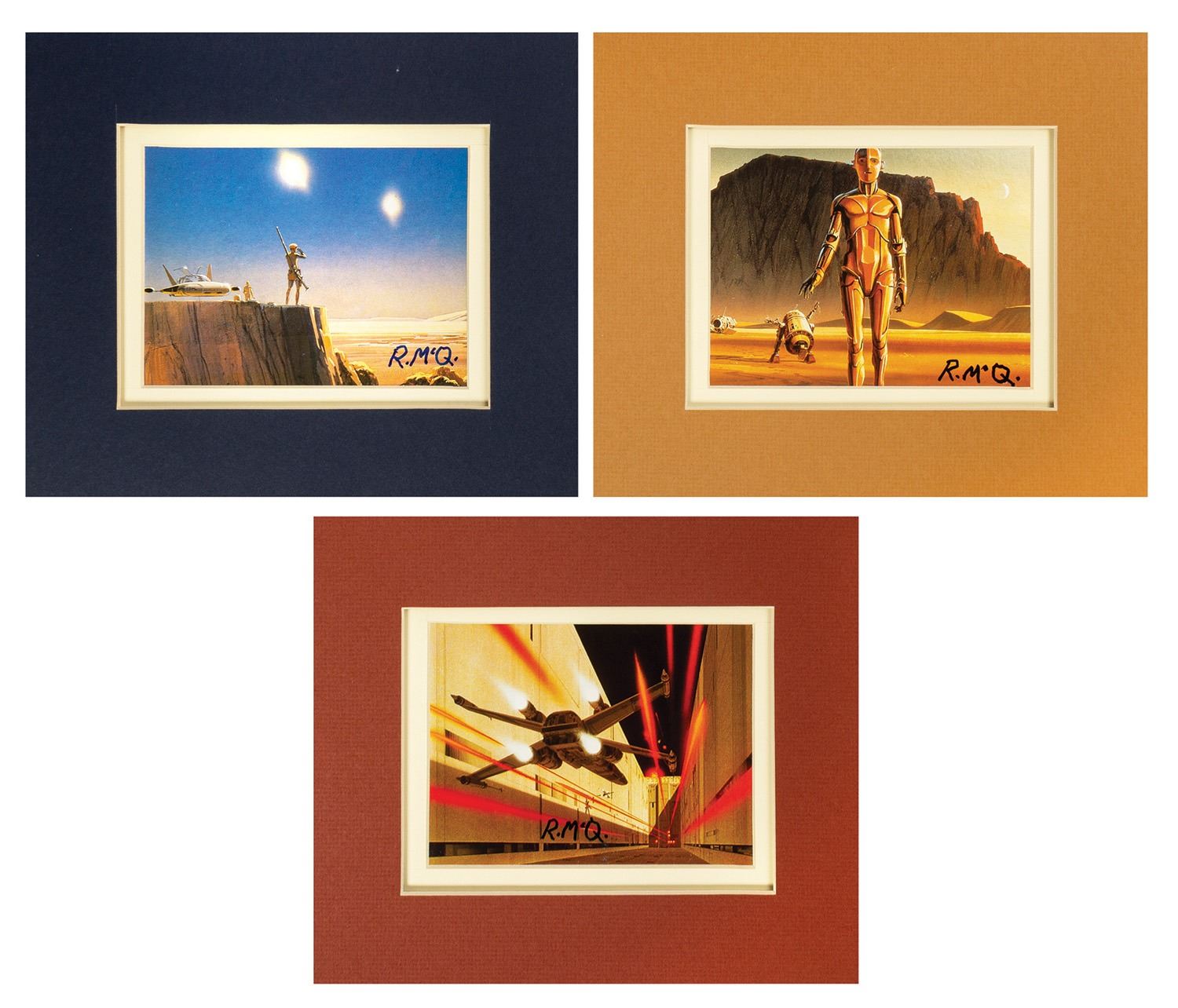 (McQuarrie, 2000s) A set of (3) prints featuring stunning concept artwork for Star Wars that was created by Ralph McQuarrie. The prints are signed by McQuarrie in the bottom-right corners, and each print comes with a mat frame for display. Measuring 8"x10" each, the prints are in very good condition overall with minor mat wear from storage.