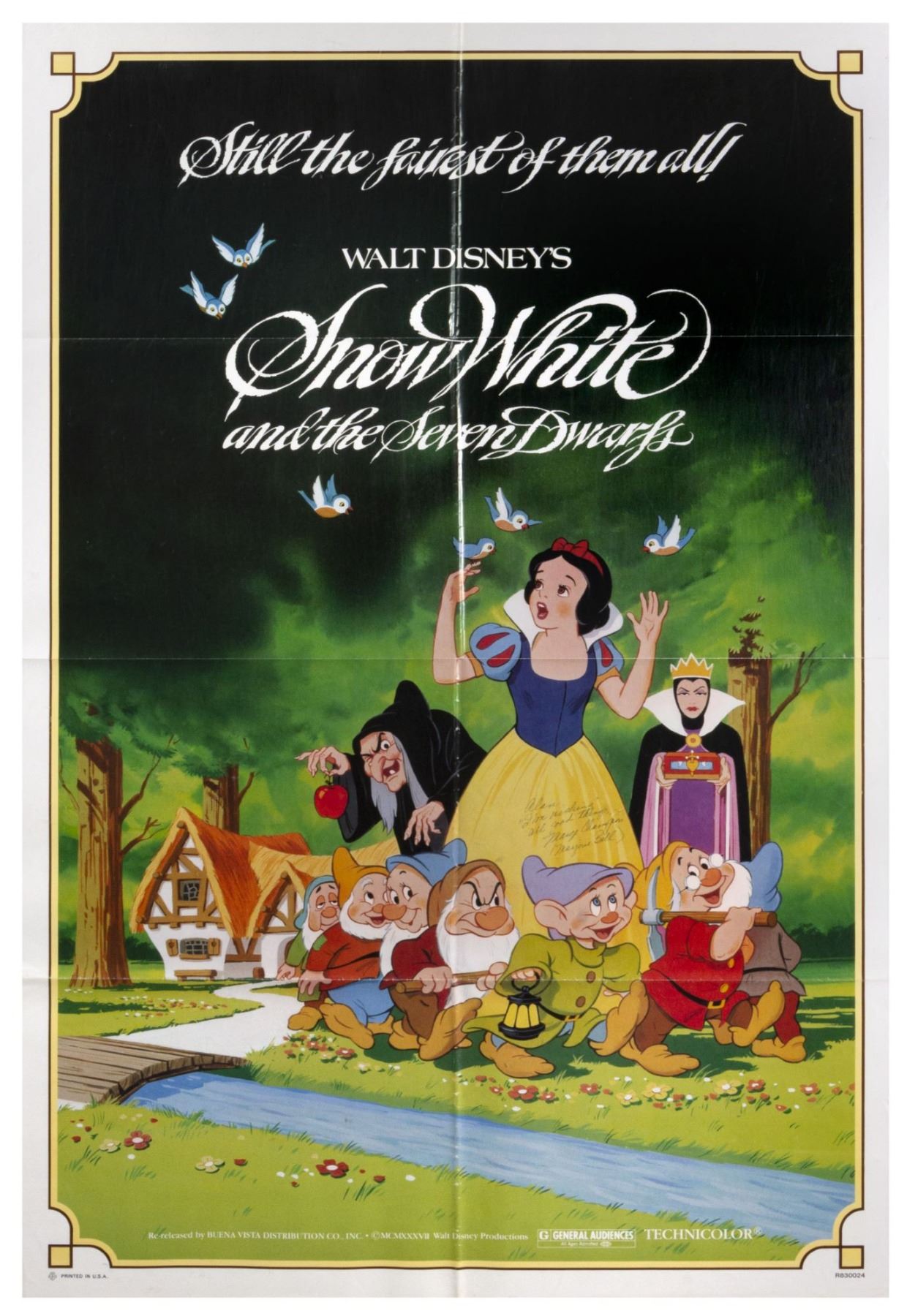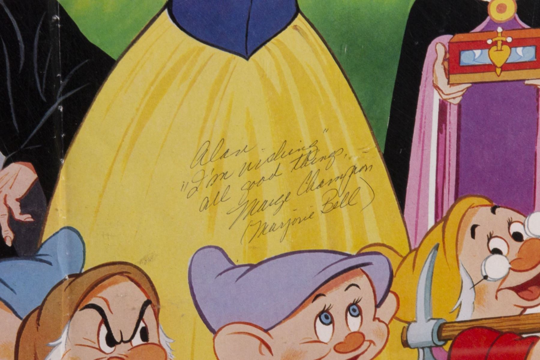 (Walt Disney Studios, 1986) A rare poster from the theatrical re-release of Snow White and the Seven Dwarfs. This beautifully illustrated poster is signed to Alan Hylton by Marge Champion, the character reference model for Snow White. Measuring 41"x27", the poster is in good condition overall with some wear along the fold lines and edges.