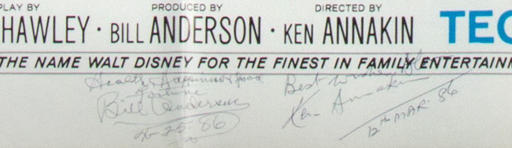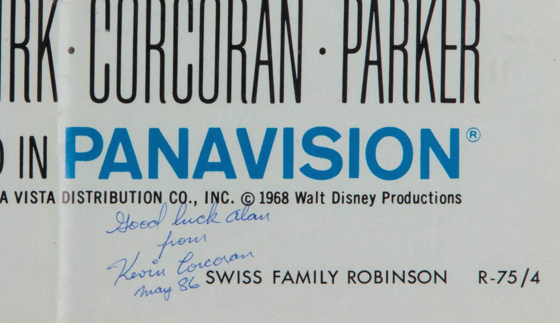 (Walt Disney Studios, 1975) An original one-sheet sized poster for the theatrical re-release of Walt Disney's Swiss Family Robinson that has been signed by director Ken Annakin, producer Bill Anderson, and actor Kevin Corcoran who played the youngest son Francis Robinson. This poster features beautifully illustrated imagery based on the film and measures 41"x27". The condition is very good with some creasing and minor wear throughout. Some of the signatures are personalized to "Alan".